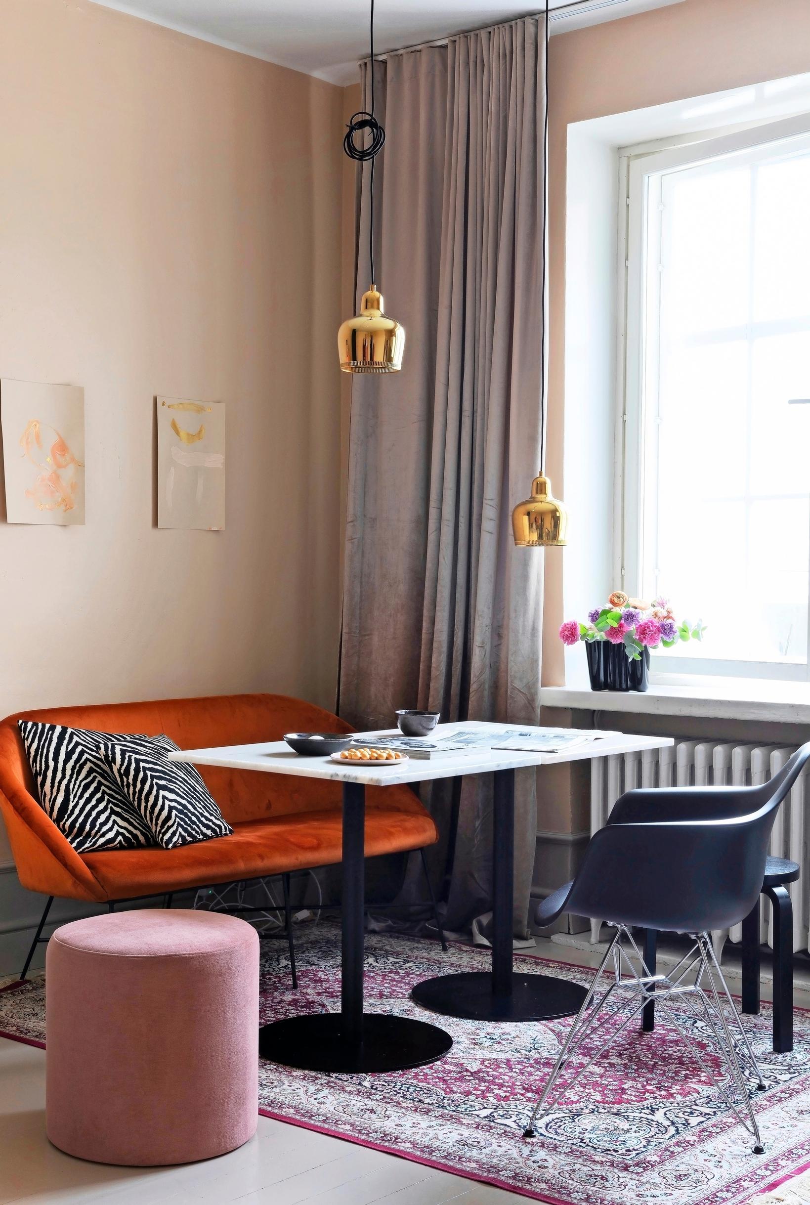 Dining areas often have predominantly hard surfaces and angles, but not in this café-like corner. Velvet curtains, a sofa, and an ottoman lend a luxurious touch. A rug completes the cozy feel.
