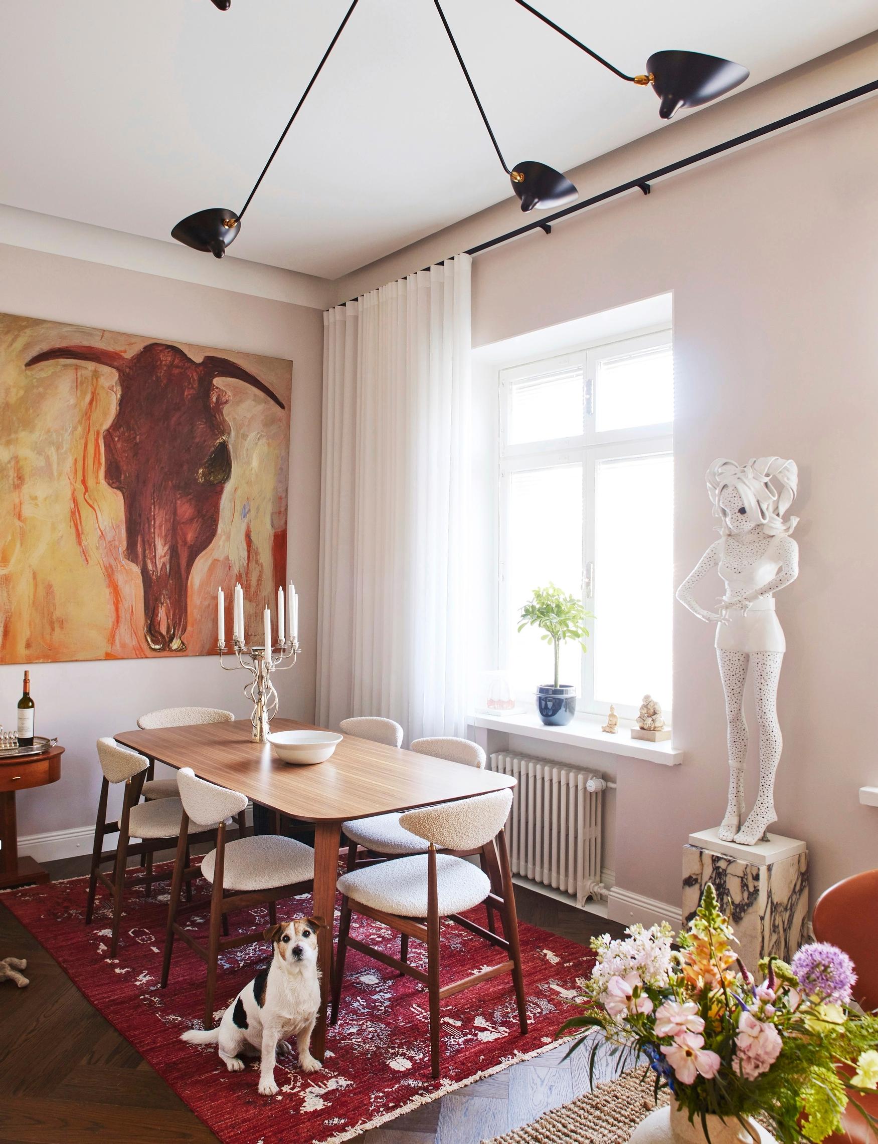 In this home, art is selected to match the interior color scheme, so the grounding rug in the dining area echoes the hue of the large painting by Marjatta Tapiola. The textured bouclé upholstery highlights the Gubi chairs’ curved lines. Sheer curtains add a naturally airy touch to the gallery-like style.