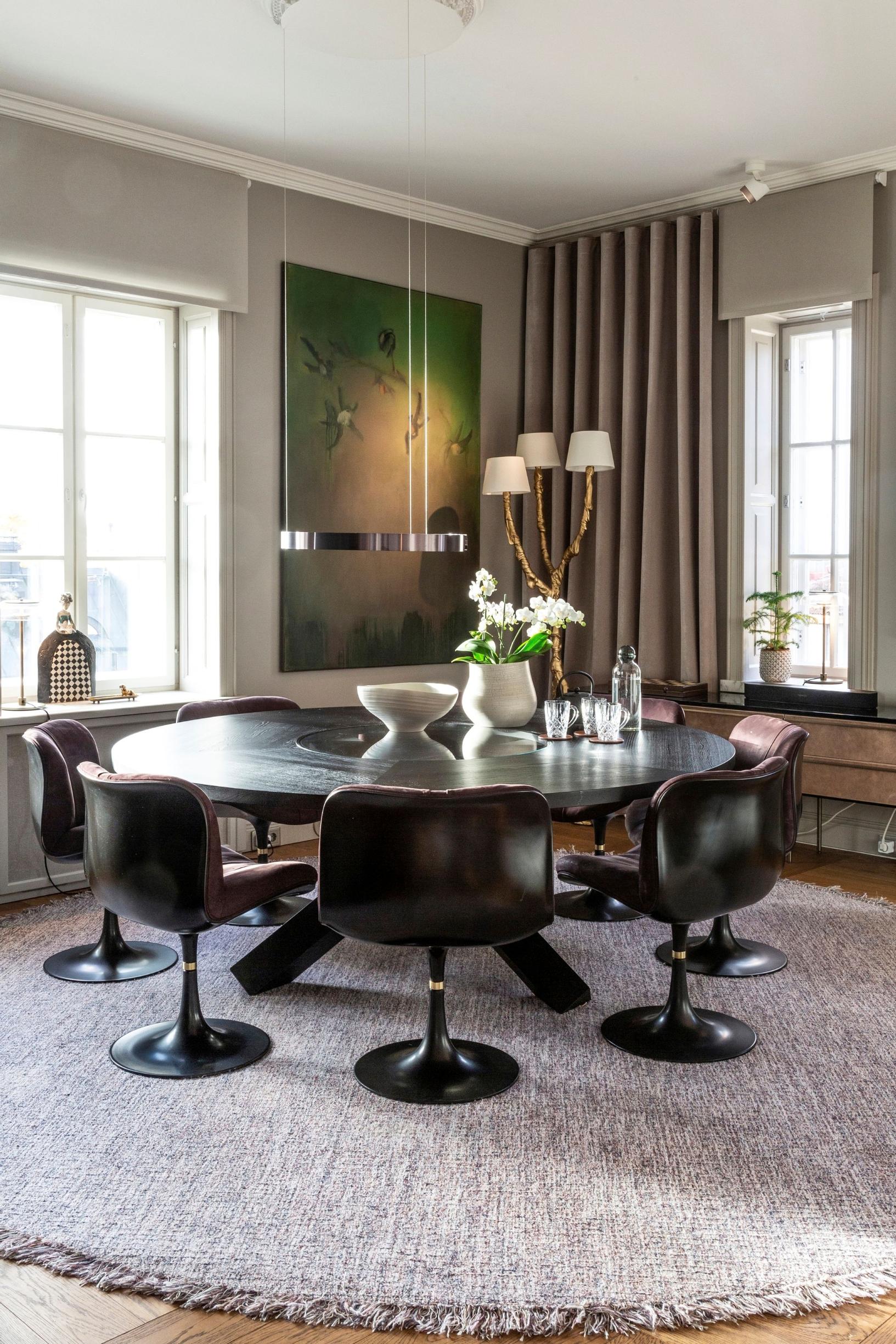 This dining area features plenty of textiles to soften acoustics and ambience: velvet chairs, substantial curtains, and a round rug that grounds the dining set. The rug is large enough for the chairs to stay on it when pulled in or out at the table. The round rug is by CS Rugs, and the Tisca curtain fabric is from Koolmat.