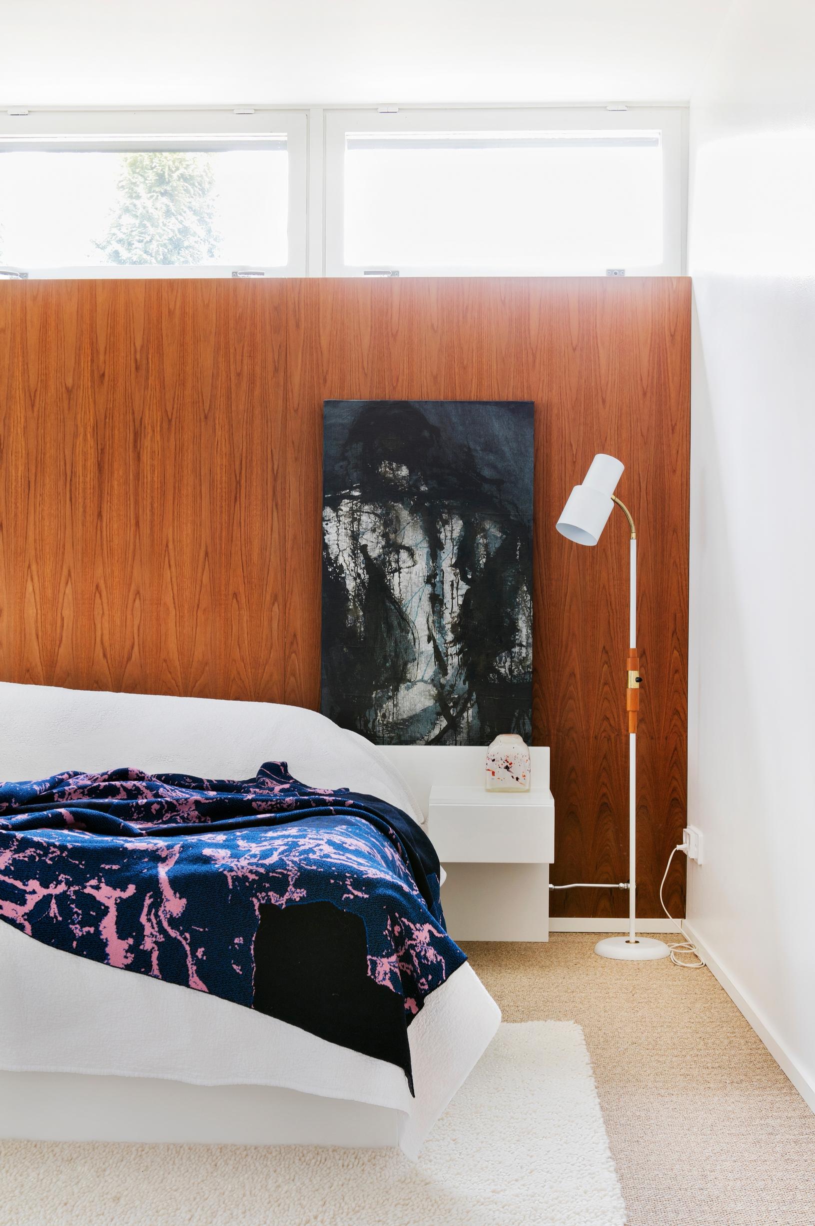 A textile floor is especially well suited to bedrooms, offering hotel-like comfort and a peaceful acoustic environment. The wall-to-wall sisal carpet from Estonia fulfilled the residents’ wish for a 1970s vibe. Wooden surfaces also help with sound absorption: the headboard wall is teak veneer.