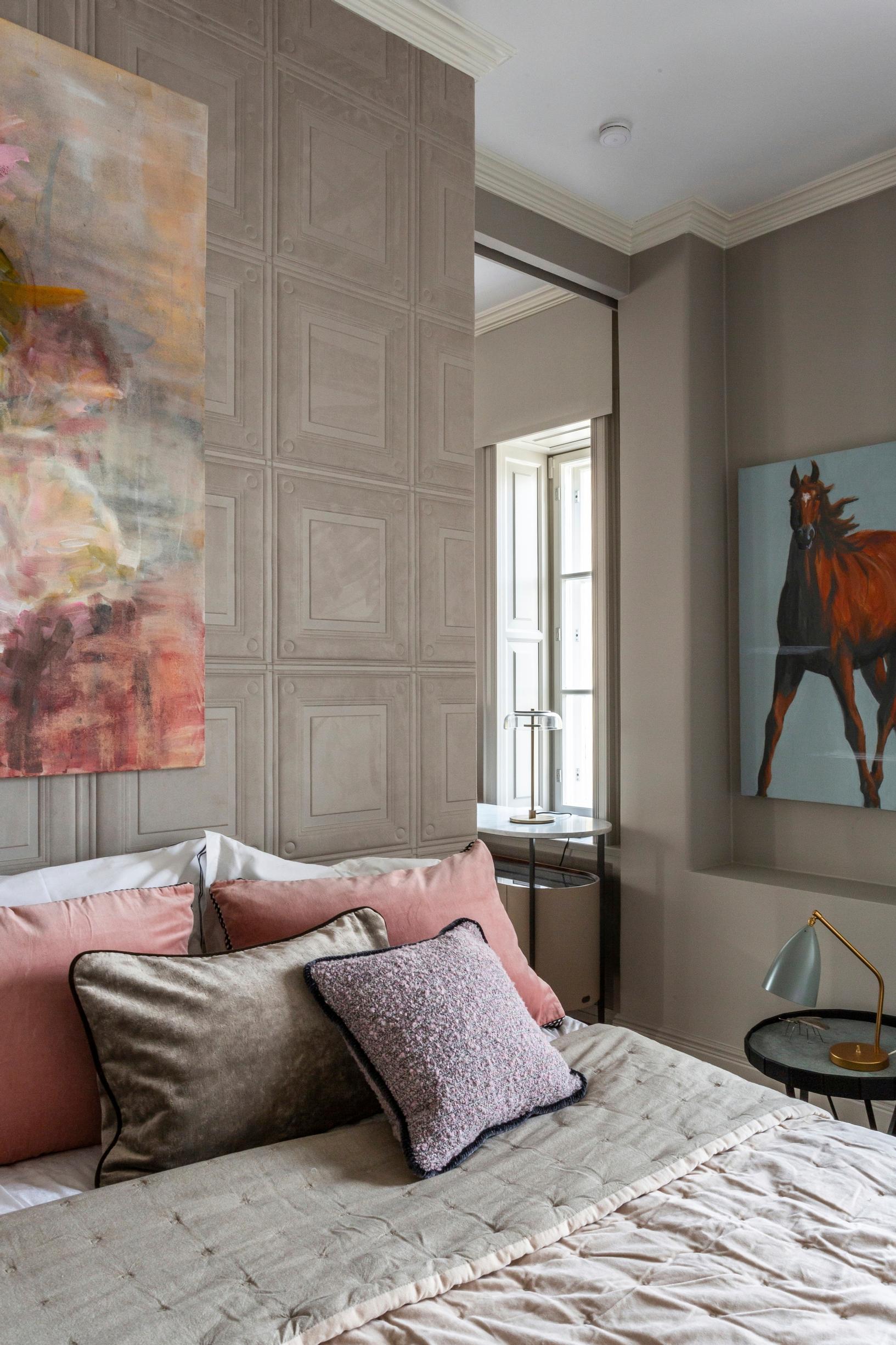 In this guest room, along with plush bedding, an Arte wallcovering creates a pleasant mood and soundscape. A soft, sound-absorbing wallpaper is a smart choice for spaces with tall ceilings and echo.