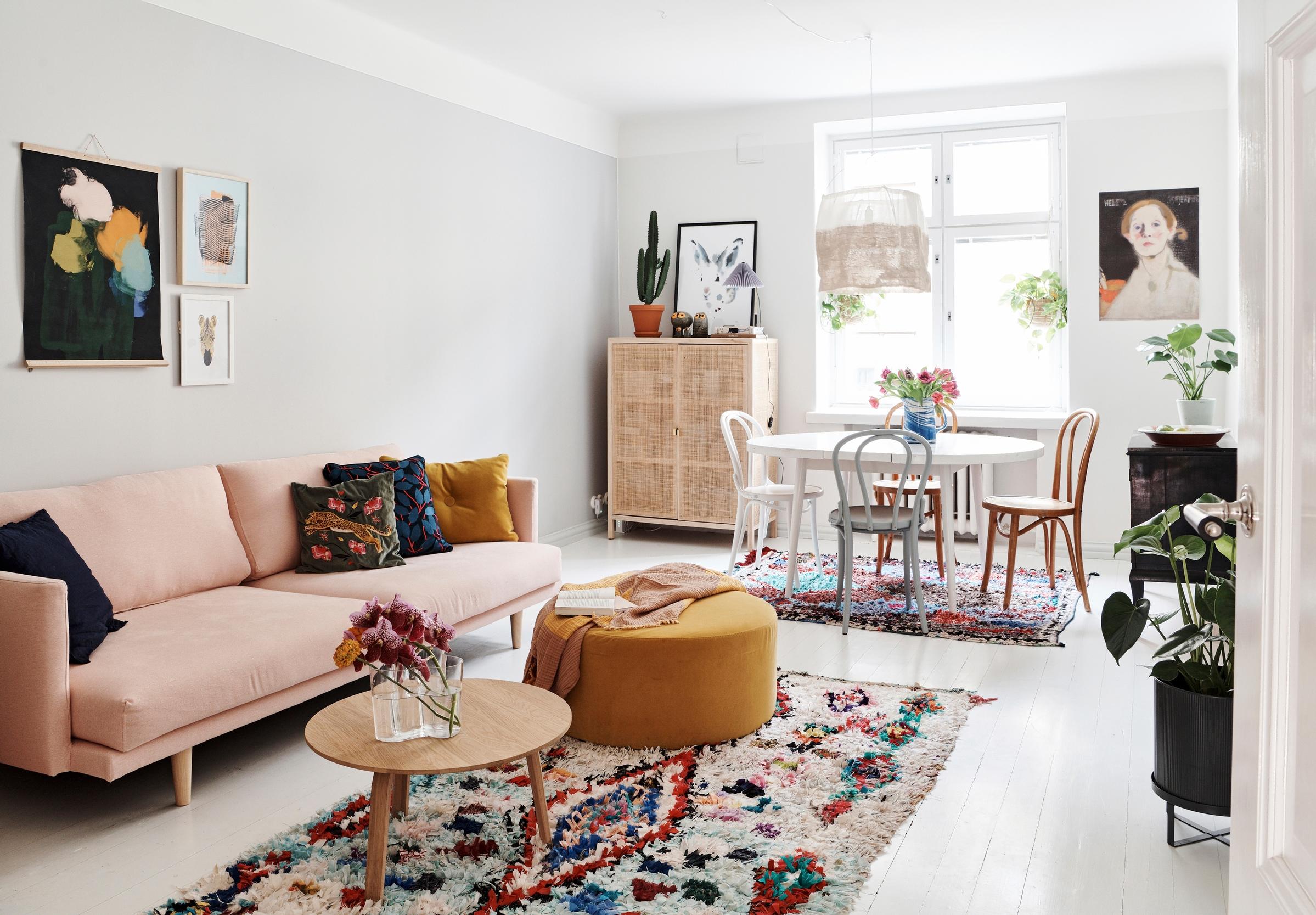 A pale pink sofa from Hakola, an ocher ottoman, and Moroccan boucherouite rugs—made from textile scraps—bring warmth to this light-toned living area. Notice that textiles can also appear in a lampshade. Decorative pillows and a throw finish the cozy look.
