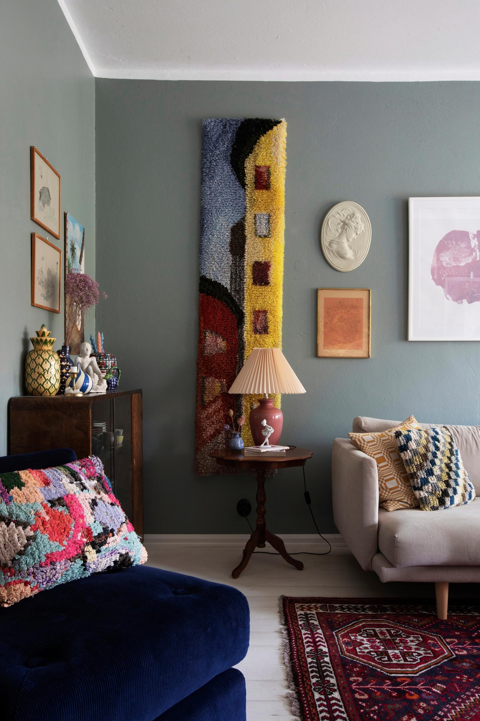 A rya cushion found on the Tori marketplace adds color to the reading nook furnished with a daybed-style chair, as does a wall rya woven by the resident’s godparent. Plush rya rugs exude warmth and coziness. Large oriental rugs effectively muffle the creaking of the old wooden floor.