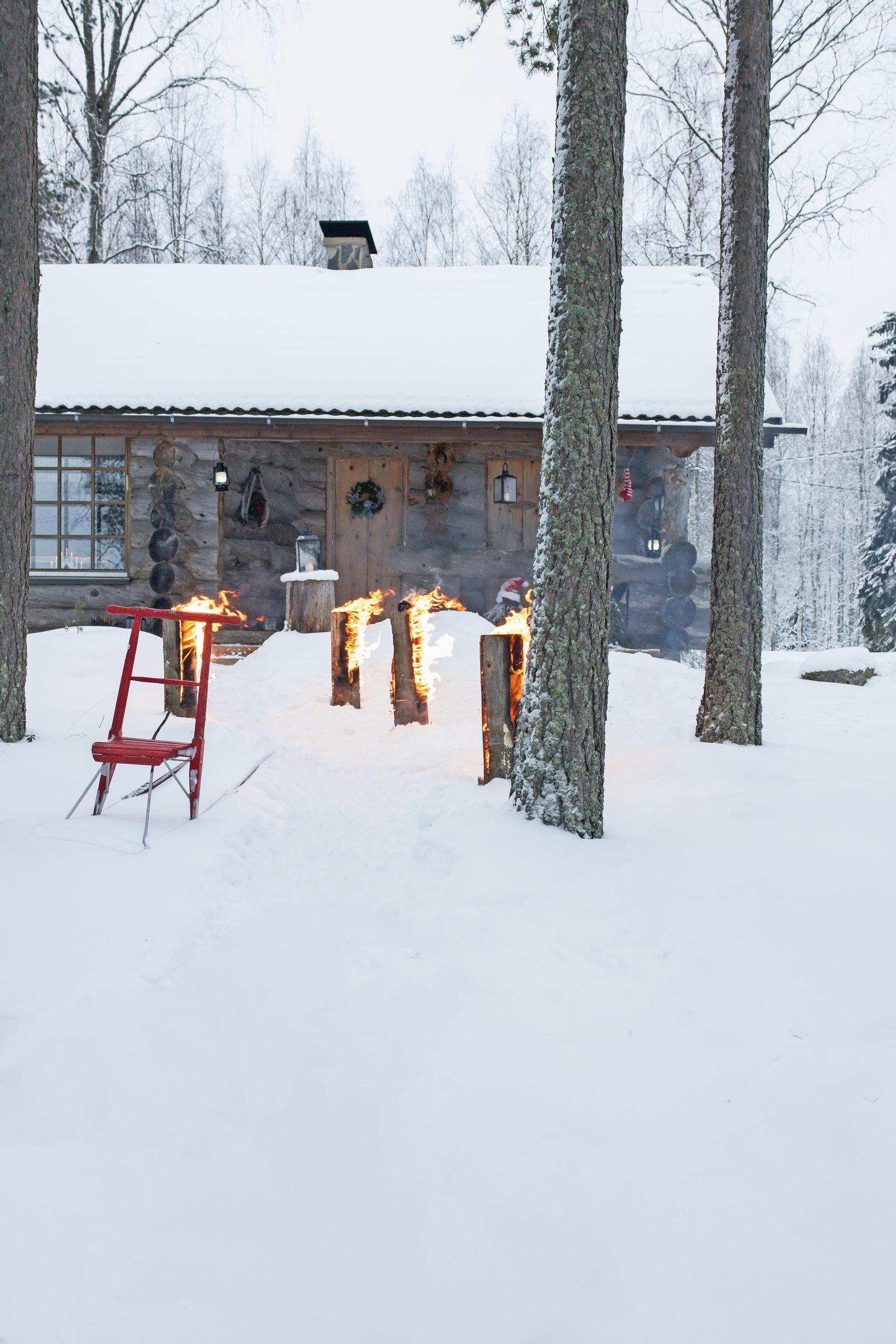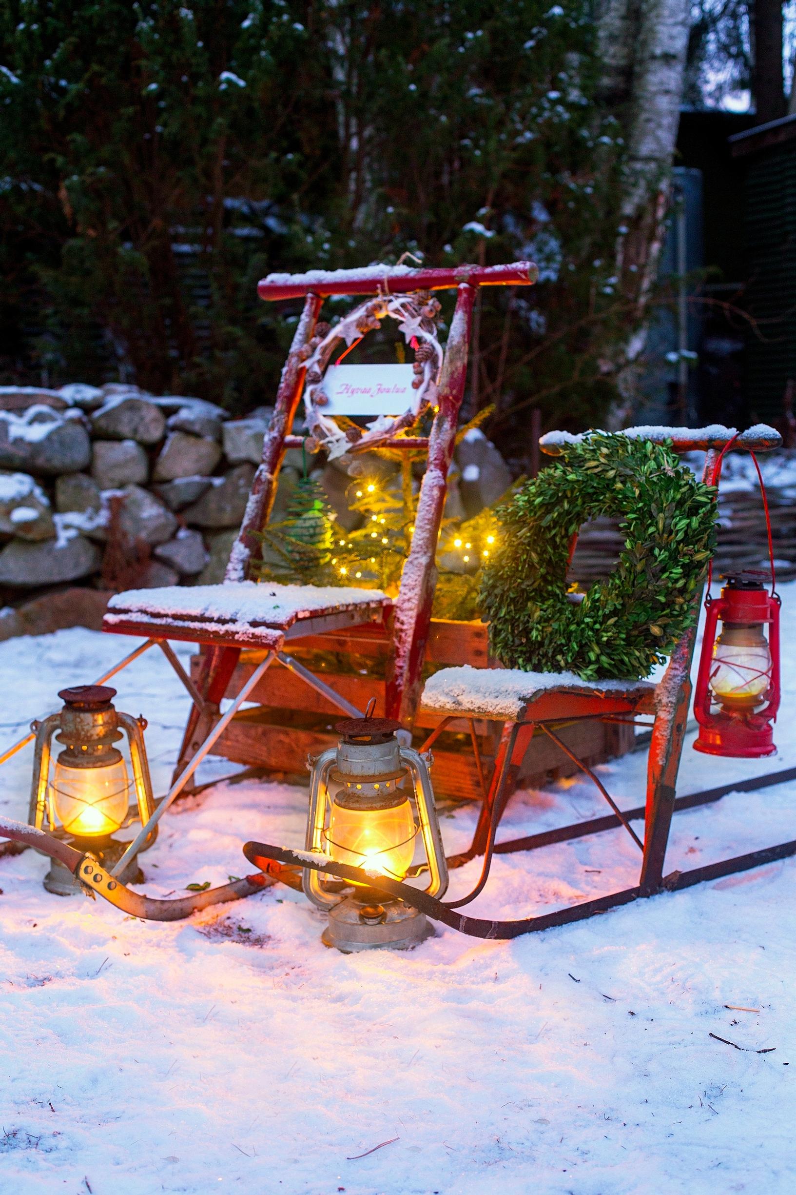 Kicksleds parked along the path to the sauna and lit with hurricane lanterns are instant mood-lifters. Here, the wooden crate set on the runners of the larger kicksled is filled with spruce saplings dressed with a string of lights; on Christmas Eve, they’re carried indoors as decorations. Suet balls hanging from the sled’s crosspiece are a gift for the birds. A boxwood wreath adorns the kids’ sled.