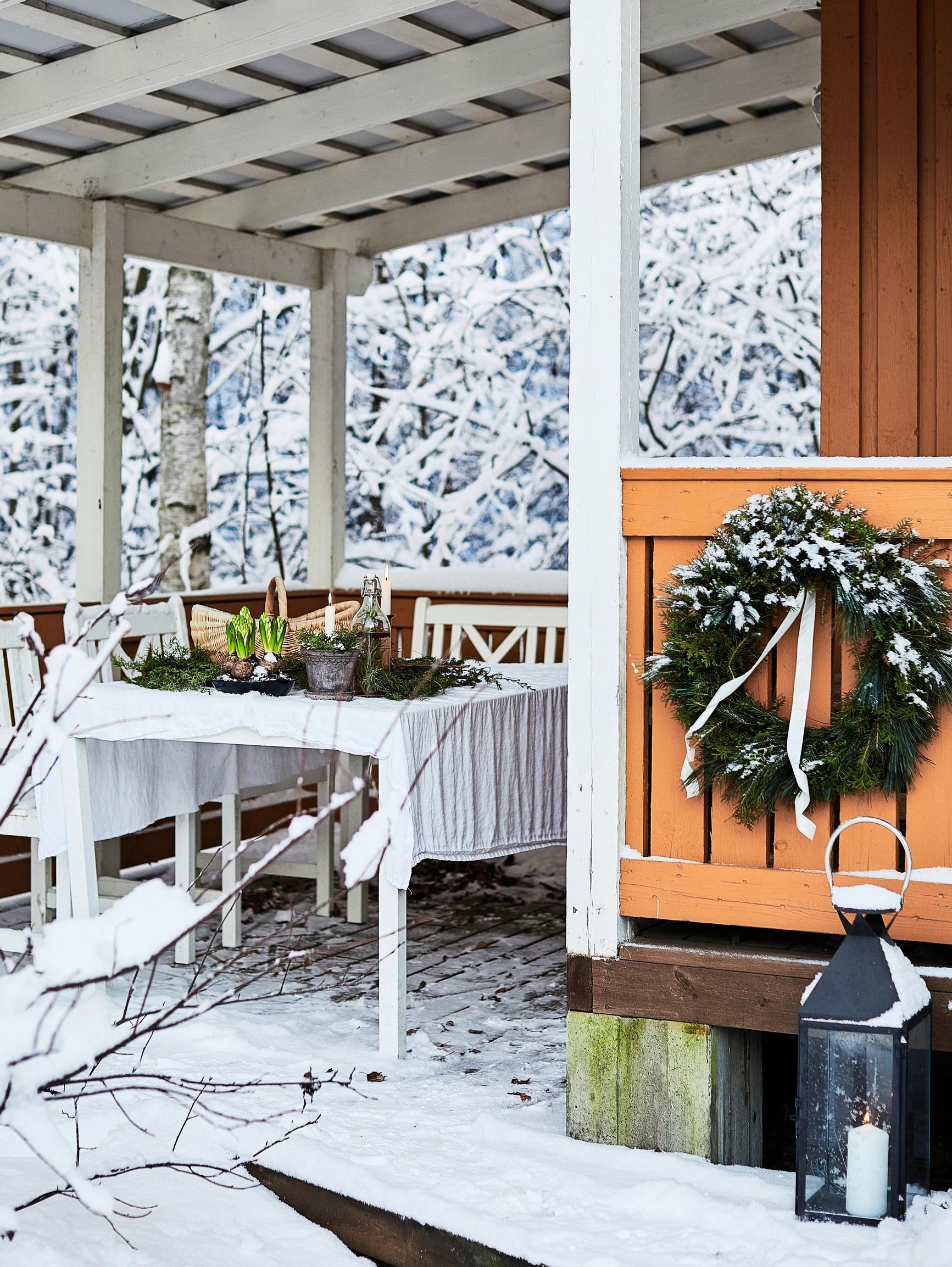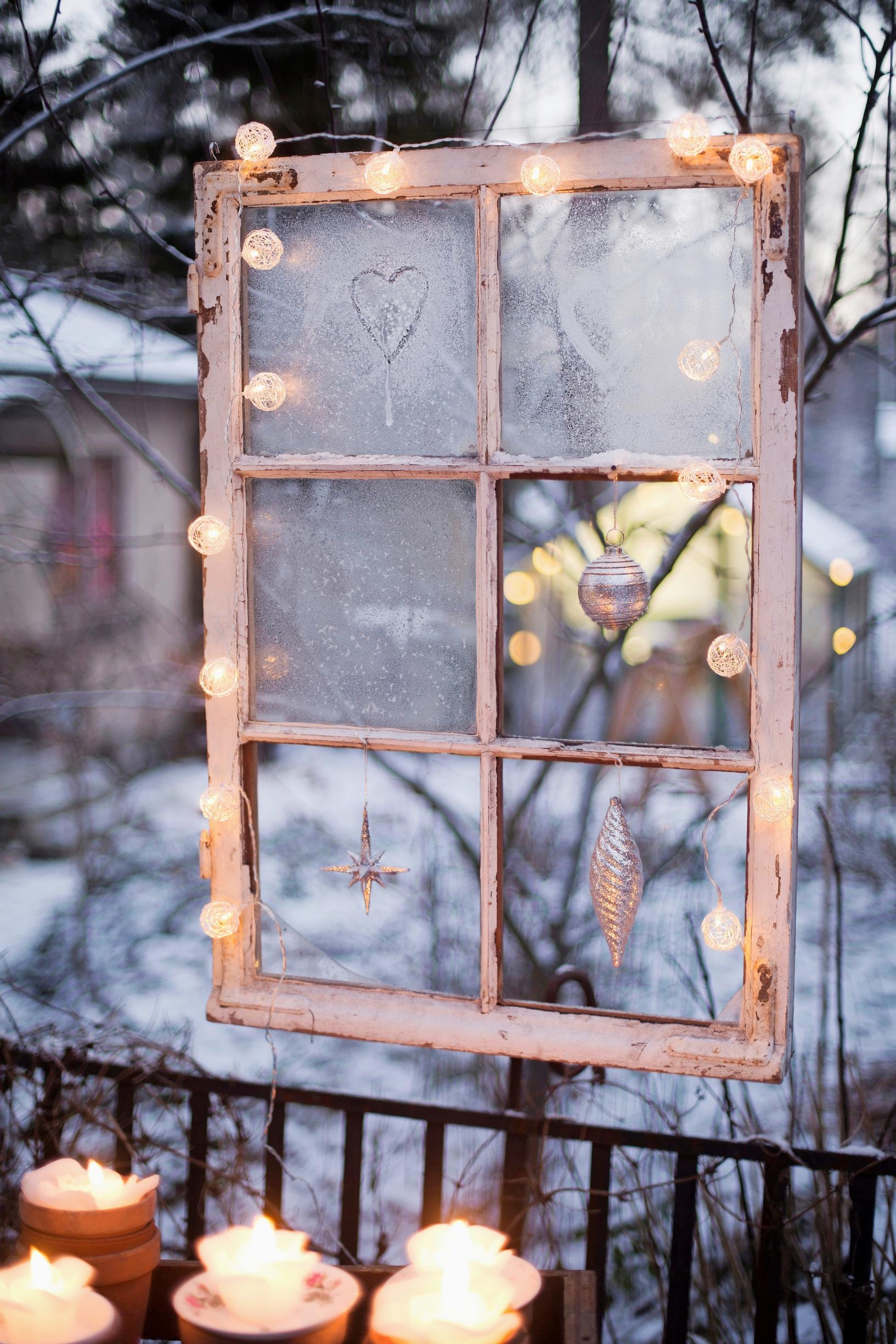A window sash that’s missing a few panes makes a pretty frame for outdoor decor. Hang it on, say, the garden shelter wall, wrap it with outdoor string lights, and place ornaments in the open squares. Frost will paint the remaining glass with frost flowers. Arrange pots, plates, and rose candles in front of the window.