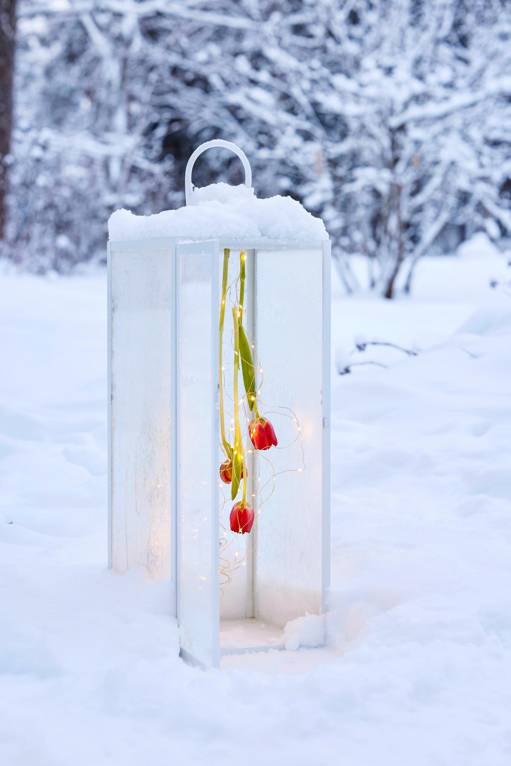 A candle lantern, a string of lights, and a few tulips make a delicate outdoor decoration that the frost finishes into something unforgettable.