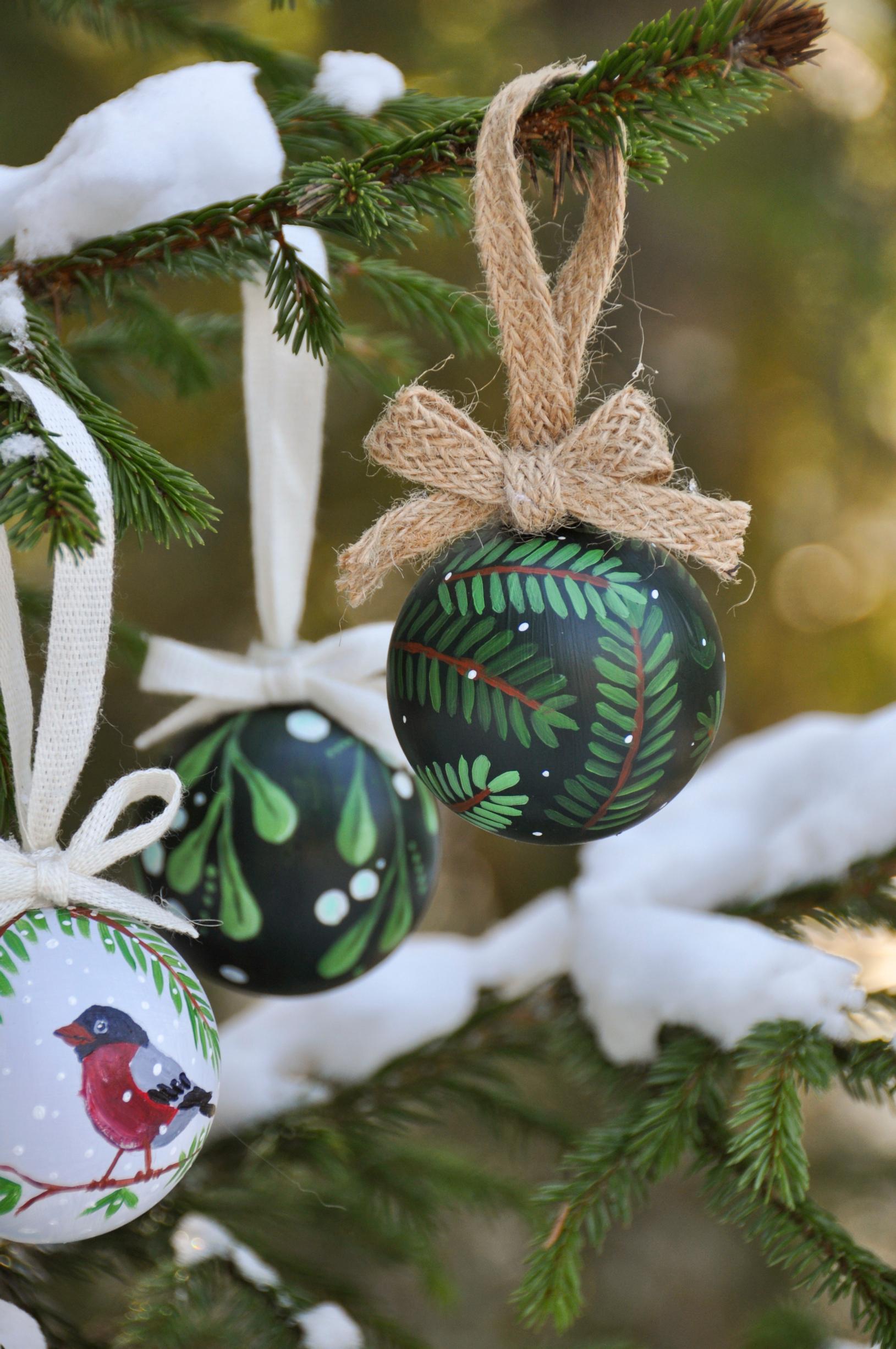 Turn ordinary Christmas ornaments into little works of art with acrylic paint. The easiest motif to paint is evergreen sprigs. Hang the finished ornaments outside on the branches of the spruce or another conifer. [in Finnish]