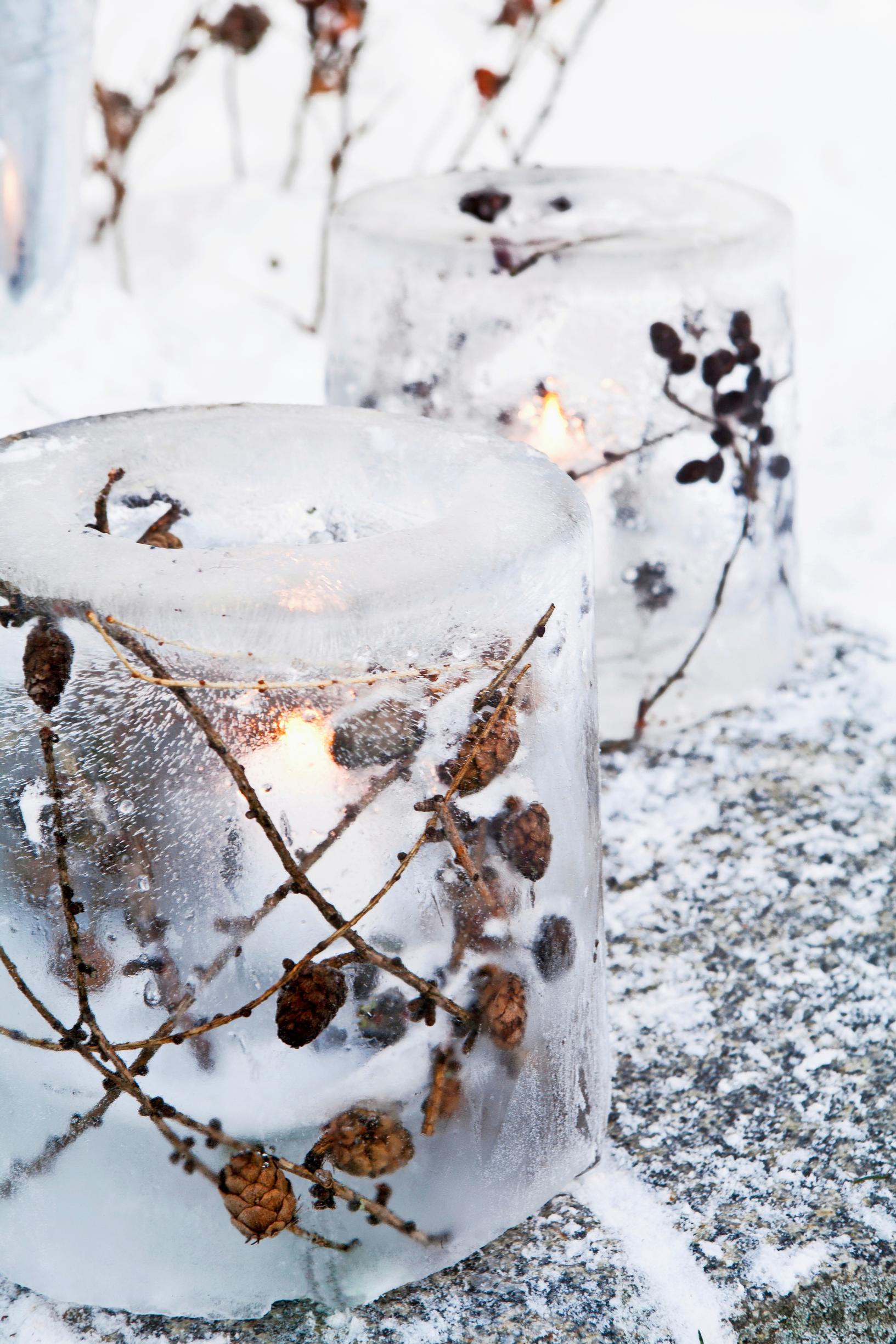 Turn your backyard into a Christmas wonderland: hang ornaments and lights on tree or shrub branches, set up a mulled-wine station, and finish the magic with ice lanterns and clever displays.
