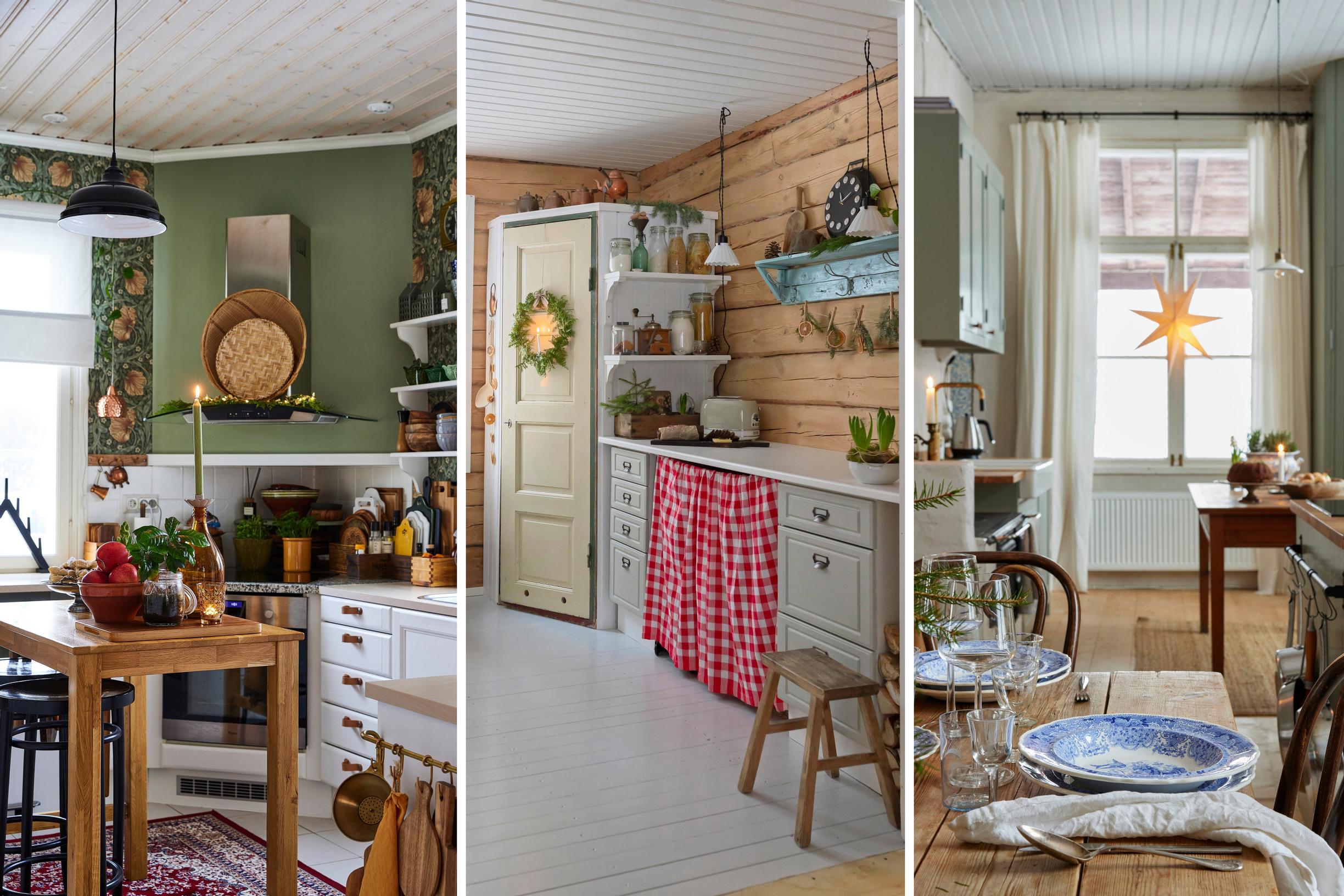Ninni and Rafael are enthusiastic cooks who decided to invest in their kitchen. The solid wood cabinetry was custom-made. The antique green color suits their more-than-a-century-old log house beautifully. This timeless kitchen features a matching window star and candelabra. Herbs are planted in an old soup bowl, and the blue-and-white Davenport tableware is inherited from Rafael’s family.