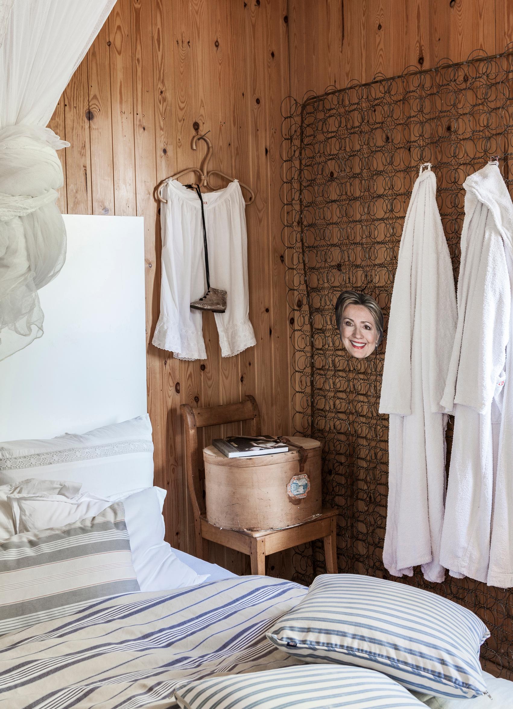 In that same room, there’s a small recess that once held the kitchen sink and stove. I placed an antique farmhouse table there, along with a porcelain bowl and pitcher so guests can wash up in the evenings.