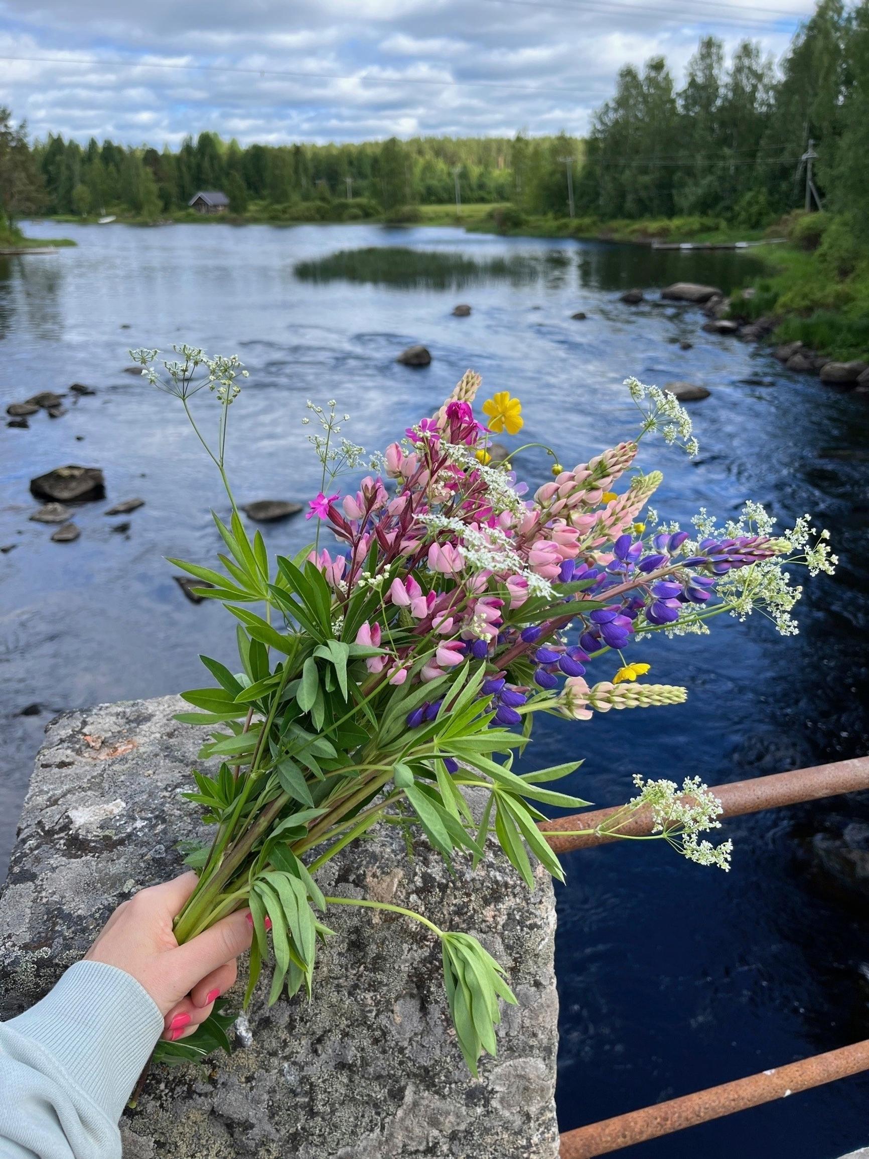 I heat the sauna and swim in a summer rain. I watch a mother bird flying back and forth to the birdhouse. I count the petals on the meadow flowers, and every different flower has five! I find wondrous patterns in the clouds. I walk barefoot and watch little fish from the dock.