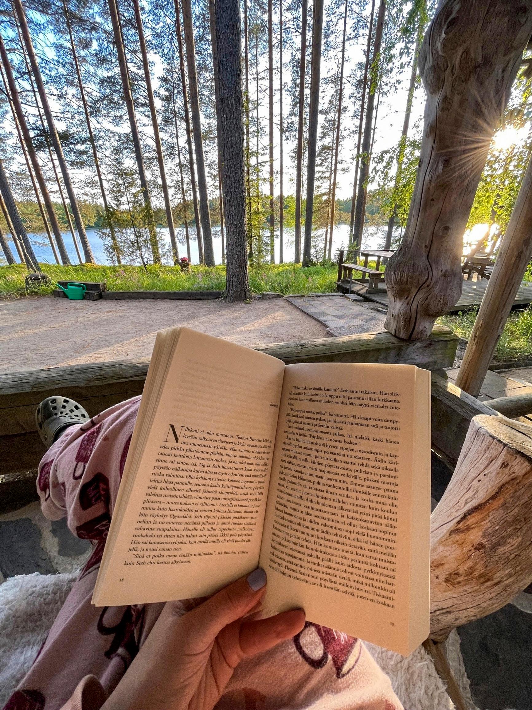 I pull on wool socks and slip into my Crocs, then settle into the garden swing with a book and a cup of coffee. Birch leaves rustle in the wind, birds chirp, and the stream babbles. What perfect conditions for getting lost in a story!