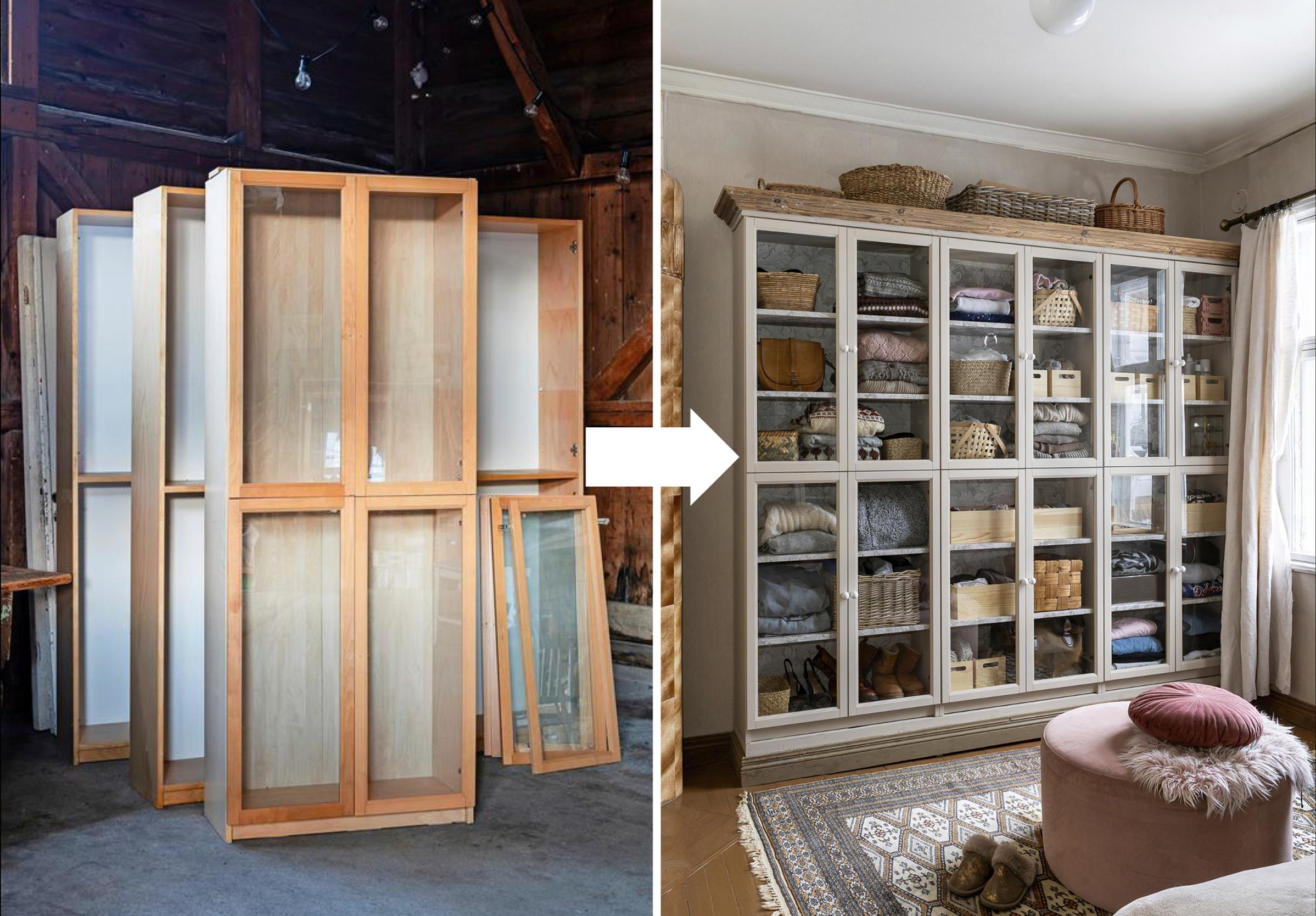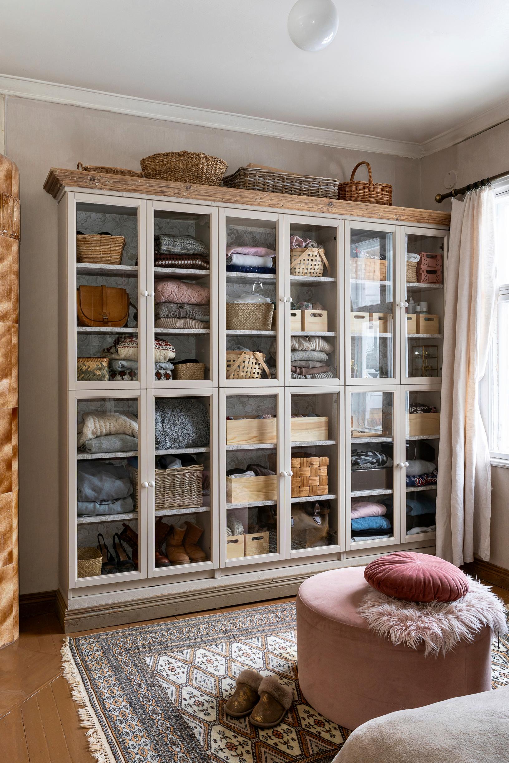 Vintage display cabinets got a fresh coat of paint and wallpaper, transforming them into a wardrobe. The wide cabinets look light thanks to the glass doors, and baskets keep things organized. See instructions for painting wooden display cabinets!