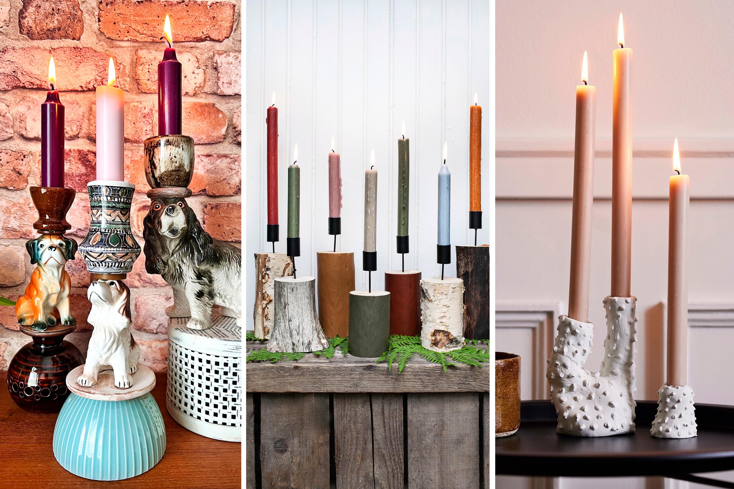 Lighting a candle in a candleholder you made yourself feels extra special. With these ideas, you can craft one-of-a-kind candleholders from clay, thrifted finds, firewood blocks fitted with metal candle cups, and glass bottles.