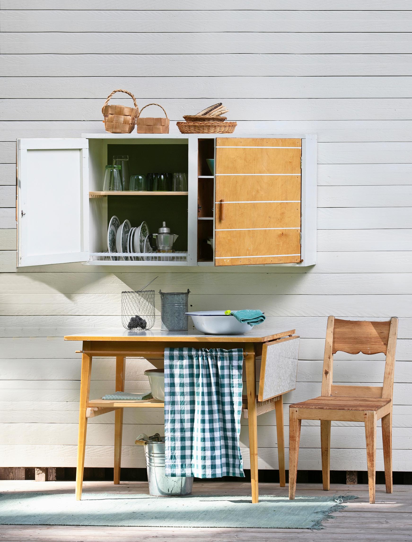 Turn a solid-wood overhead cabinet and a laminate-coated table into a practical dish station, perfect for a small cabin without running water. The dish-drying cabinet is an essential helper, and washbasins and water buckets stay out of sight behind the curtain.