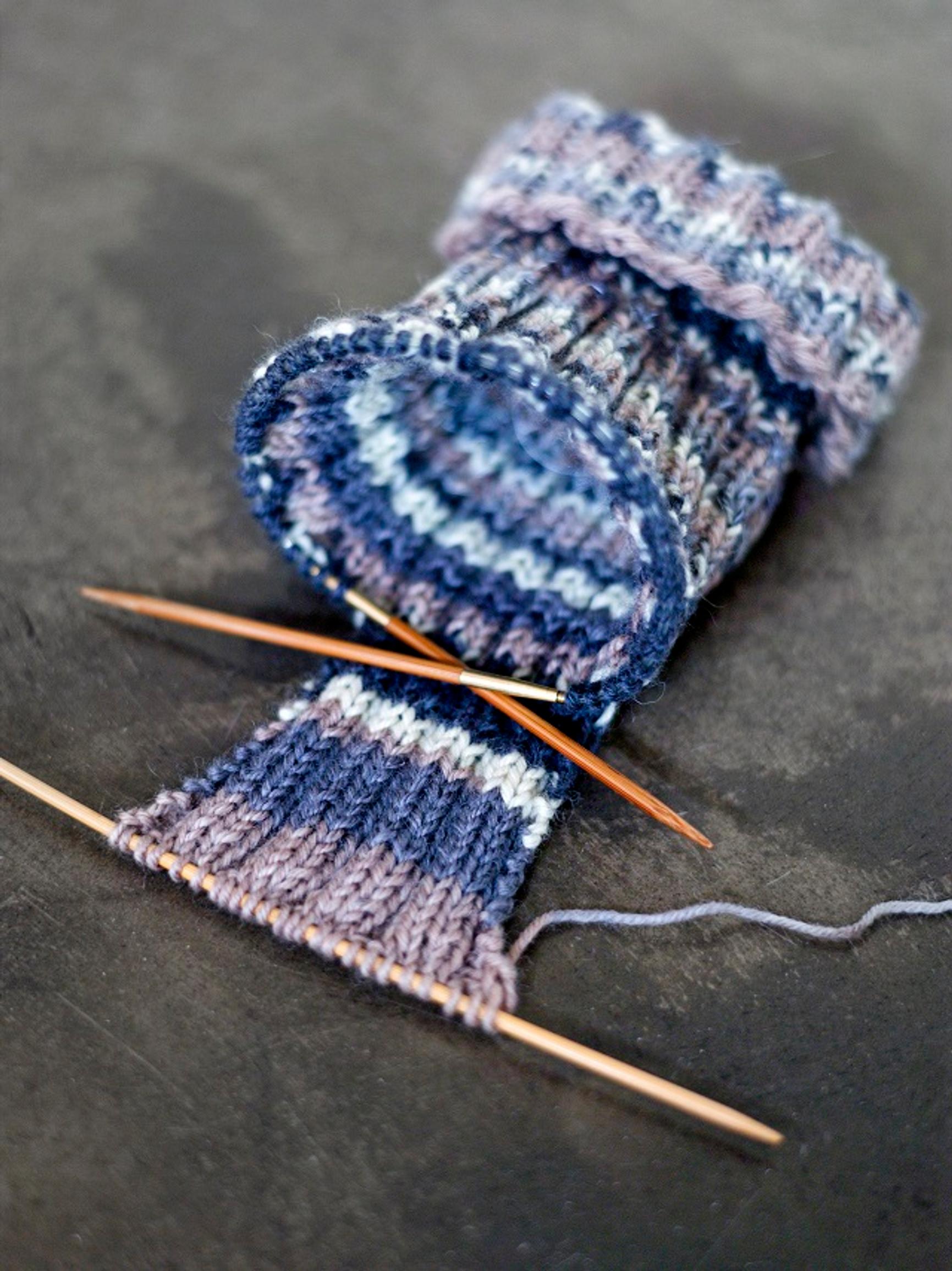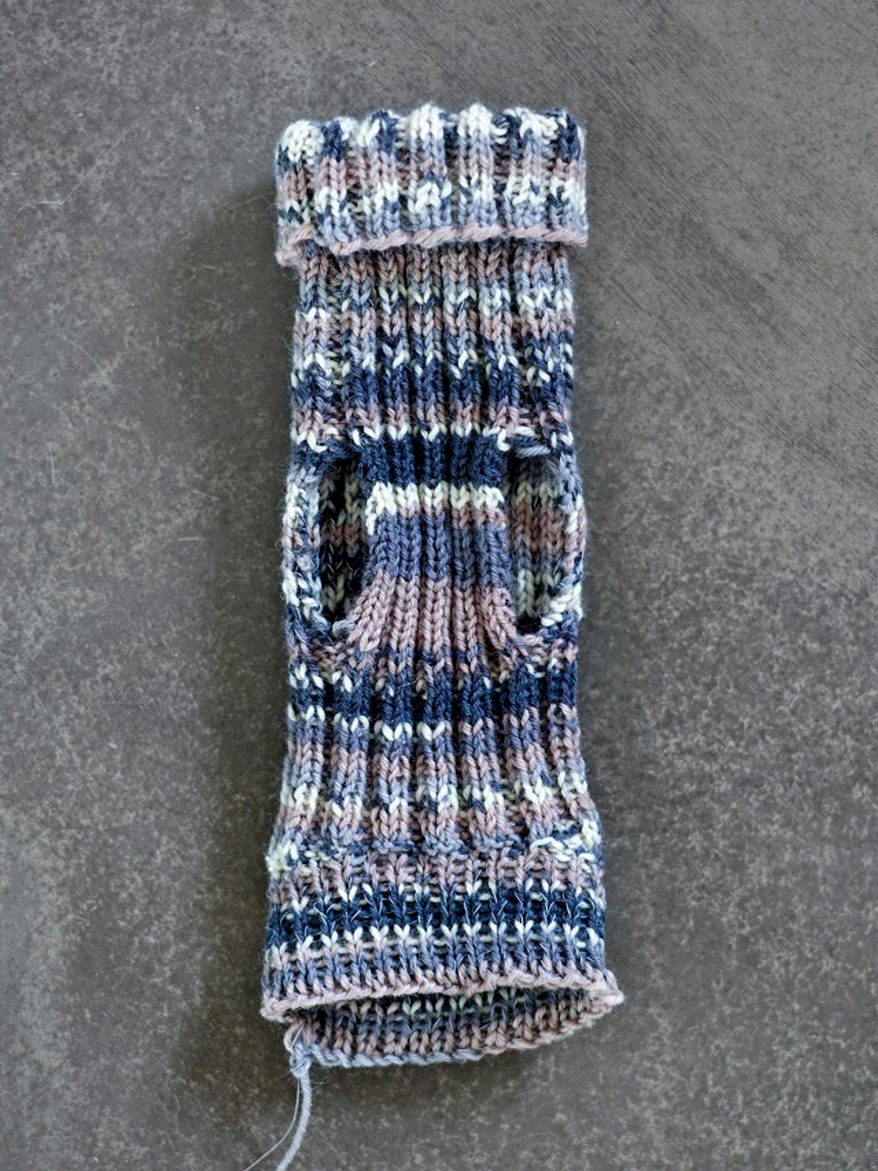 3. Work [k2, p3] rib with the reflective yarn until the piece measures 12 cm. Then continue without the reflective yarn until it measures 16 cm.