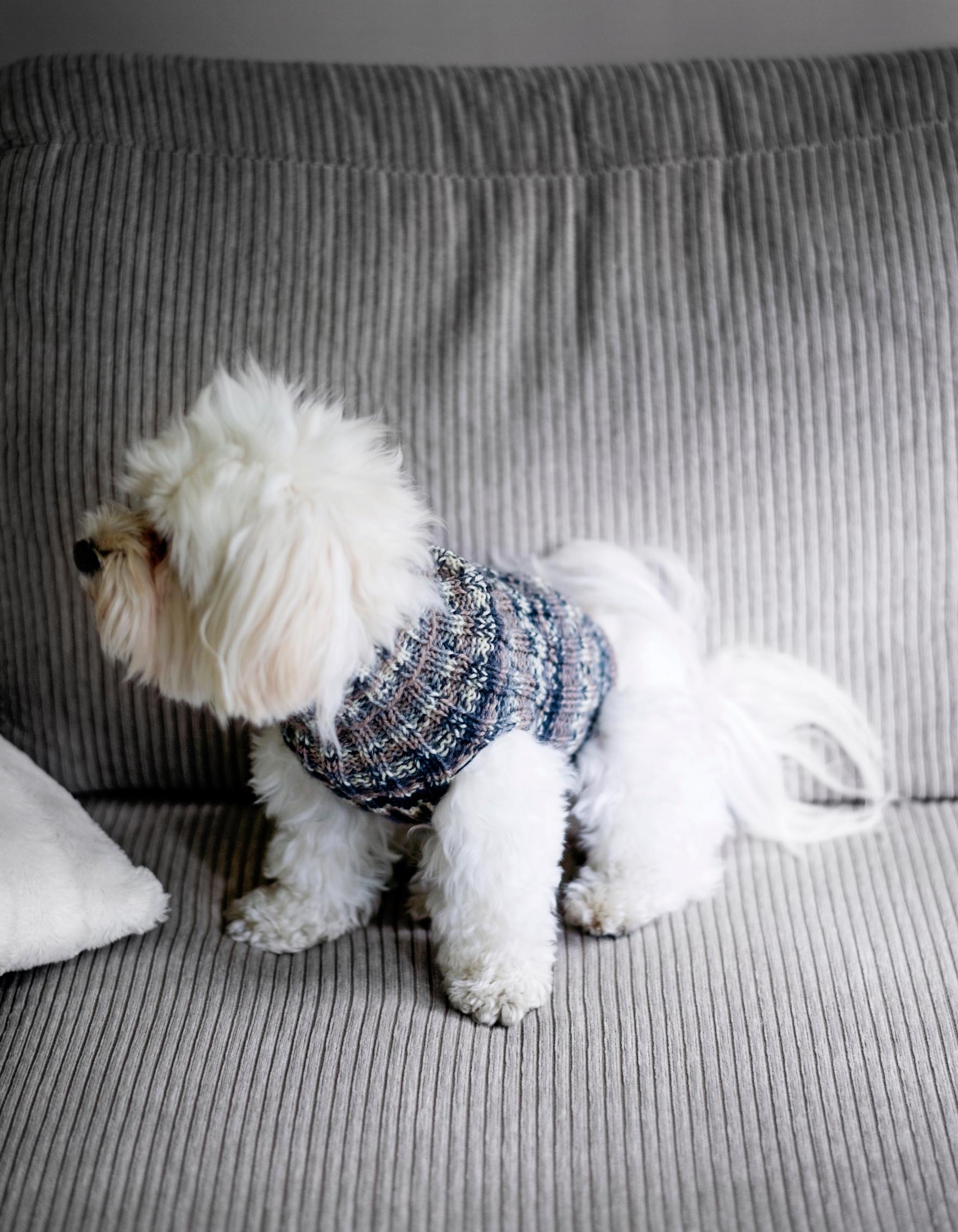 - Sock yarn suitable for 3.5 mm (US 4) needles, such as Novita 7 Veljestä. Just under 100 g was used for the sample knit, so one 100 g ball is enough for a small dog sweater.