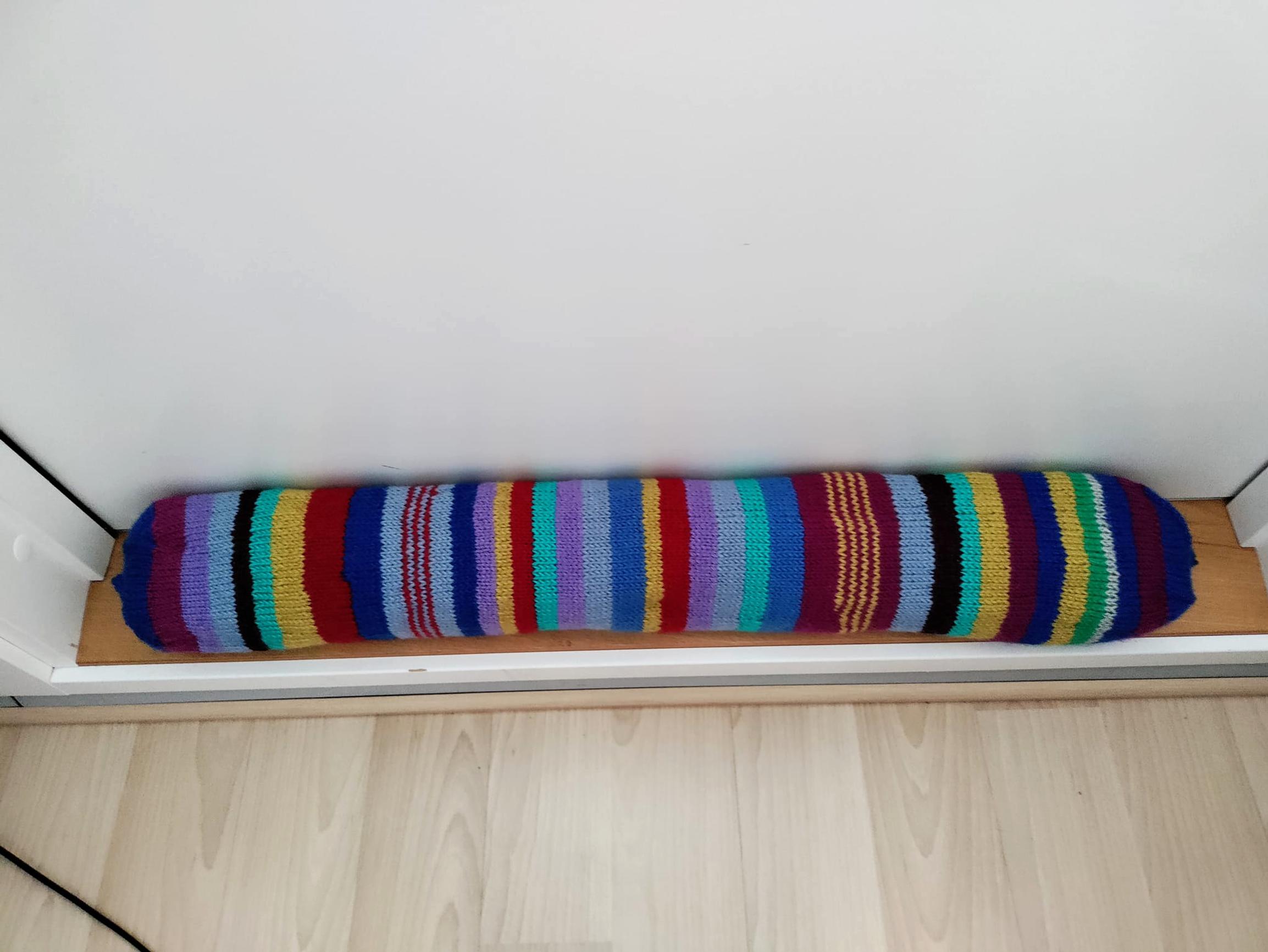 Epe Spets had received a heaps of yarn from a friend and had already made a throw blanket and socks, but smaller balls of yarn in various colors still remained. After hearing about draft stoppers, she decided to put the leftovers to good use.