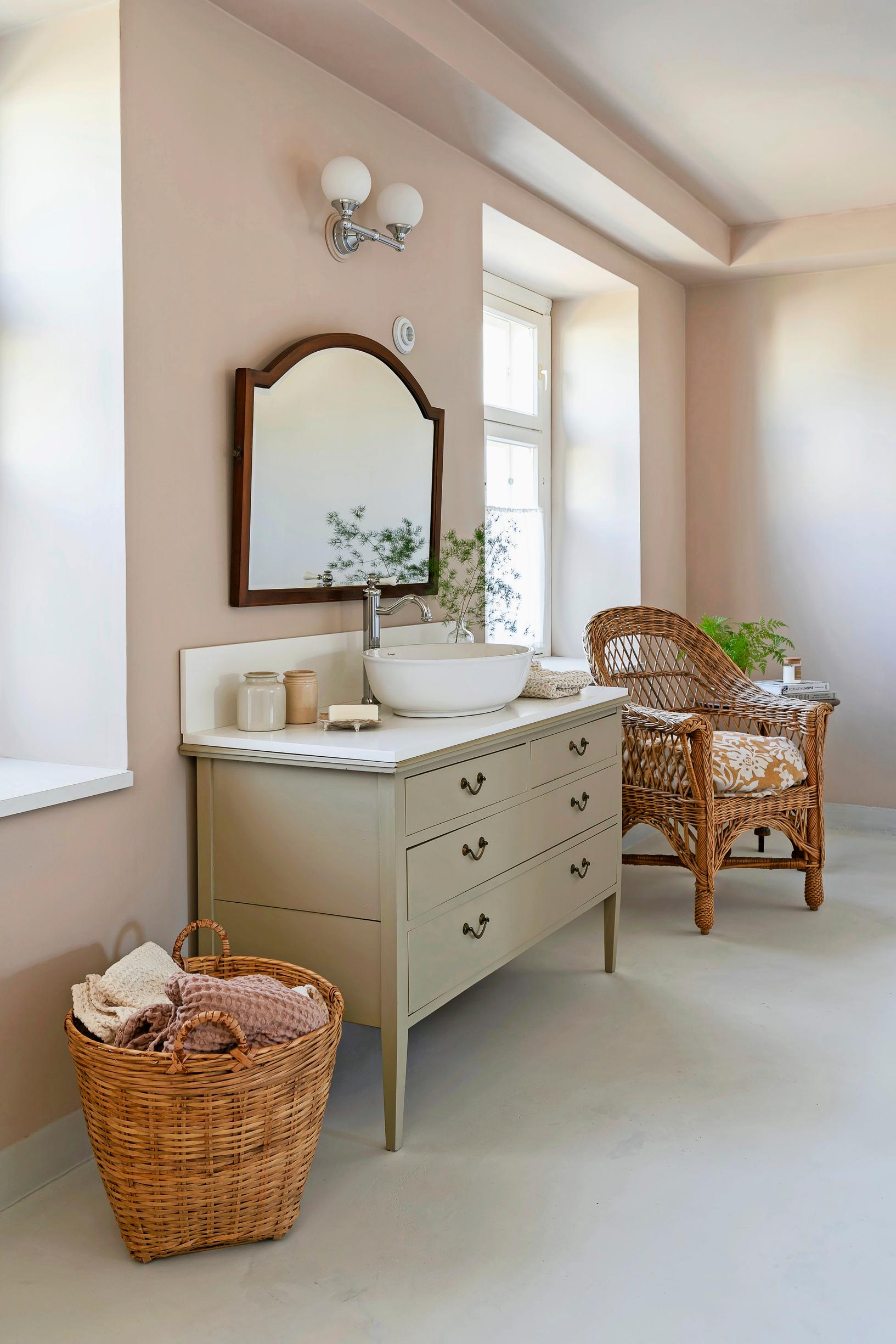 5. Paint the dresser with two coats of paint. Reattach the pulls. Use construction adhesive in a few spots to secure the stone countertop. Seal around the sink with silicone. It’s also wise to anchor the dresser to the wall through its back panel.