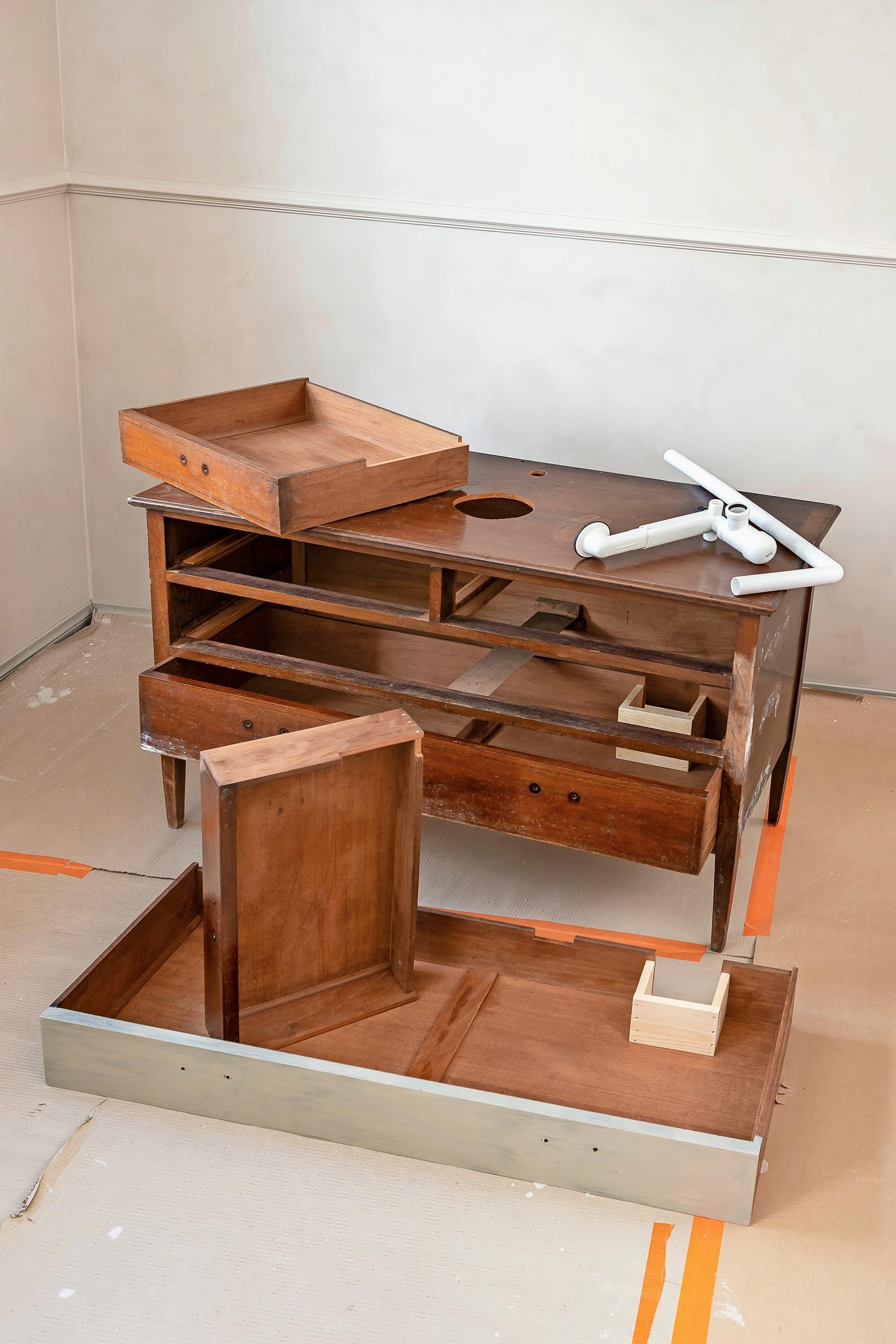 3. Temporarily set the sink in place to check its fit, and attach the bottle trap. Measure how much space the pipes will need inside the dresser, and use the drawers to see where modifications and pipe placements are required. If simply shortening the drawer is enough, saw off the back panel, move it to the new position, and shorten the drawer.