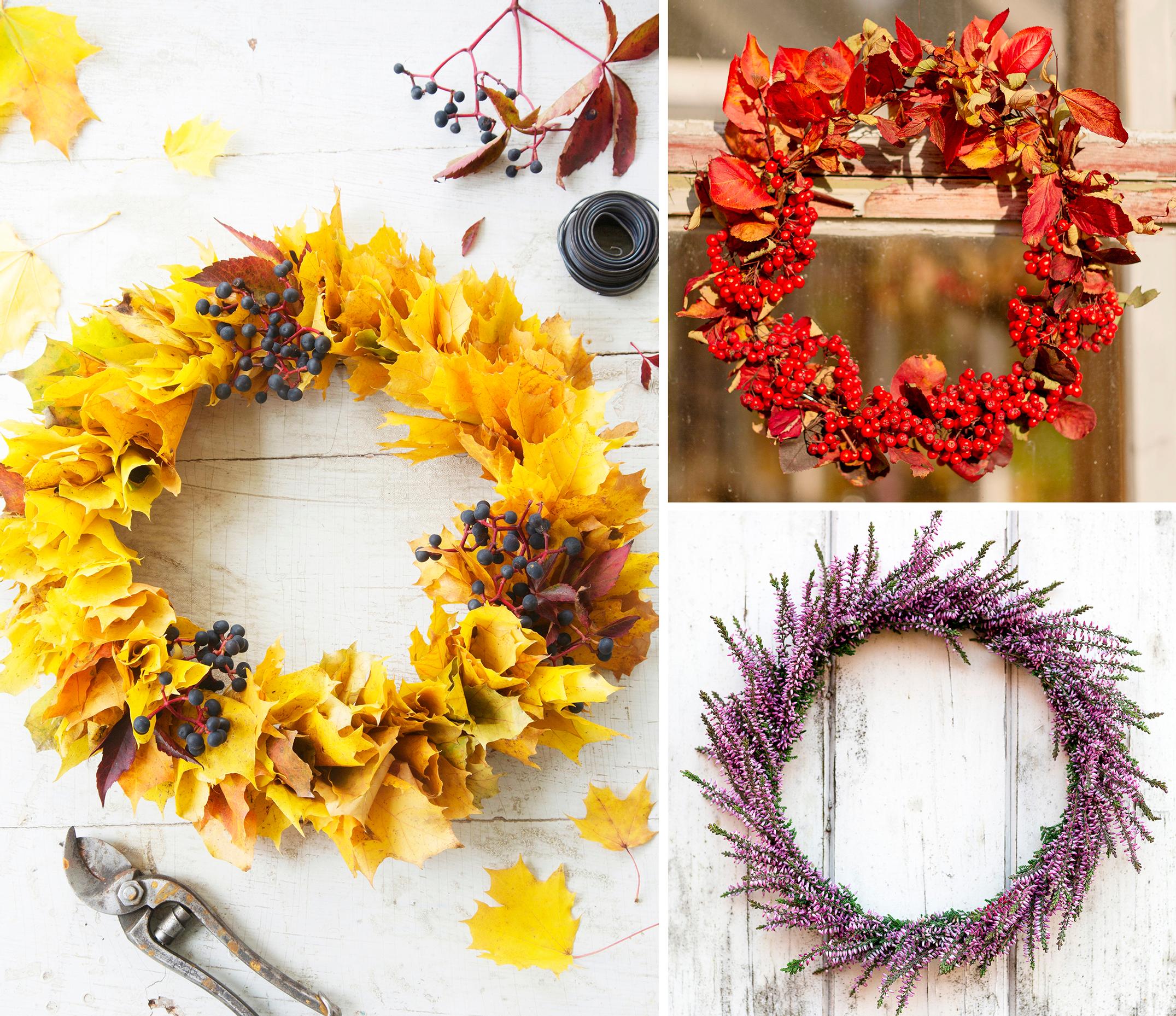 Nature in fall offers some of the loveliest materials for crafting. You can whip up a wreath in no time with colorful maple leaves, heather, and small twigs.