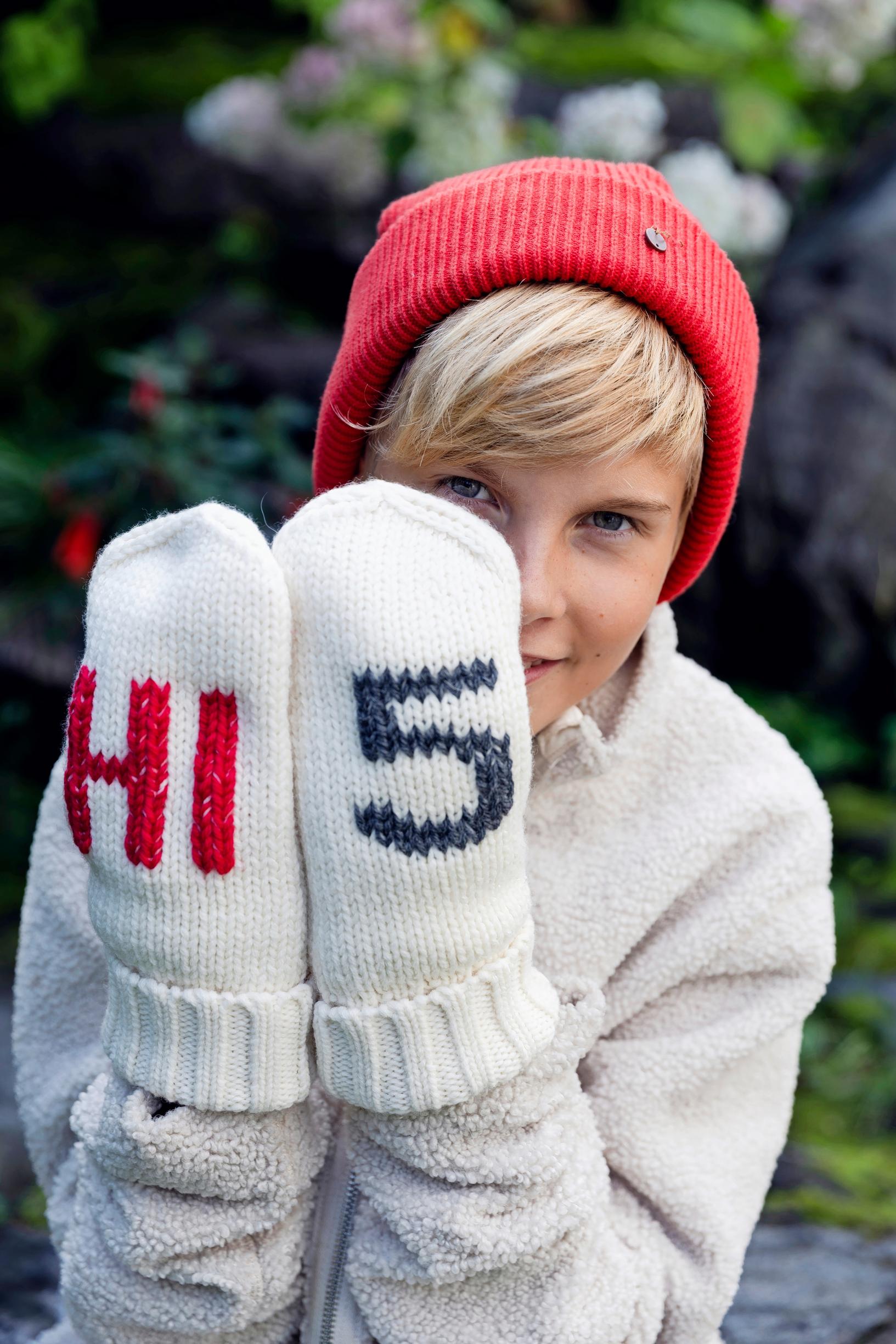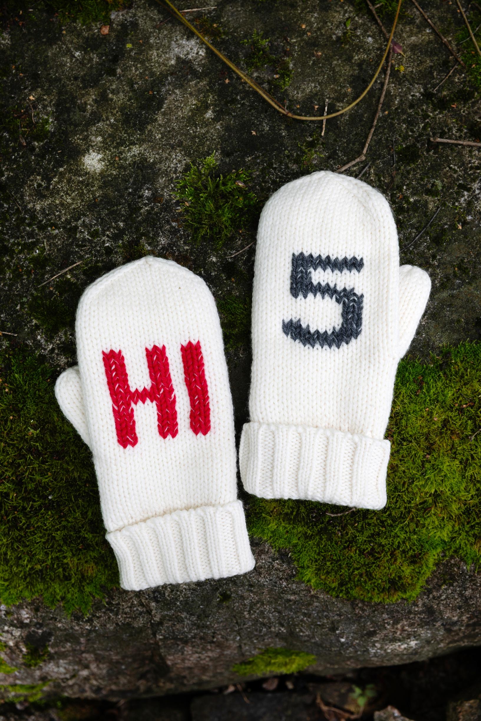 The text HI goes on the right-hand mitten, and the number 5 goes on the left-hand mitten.