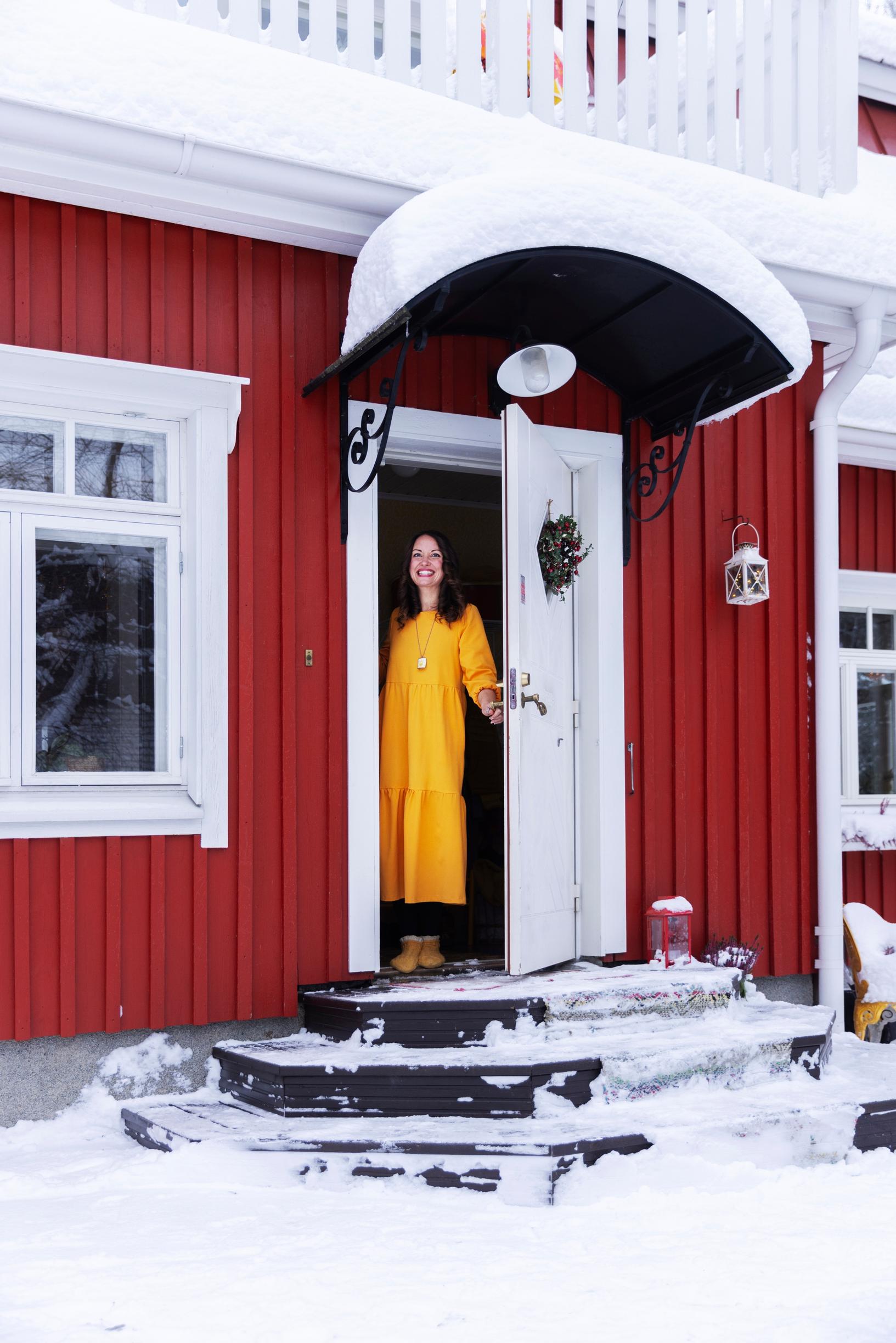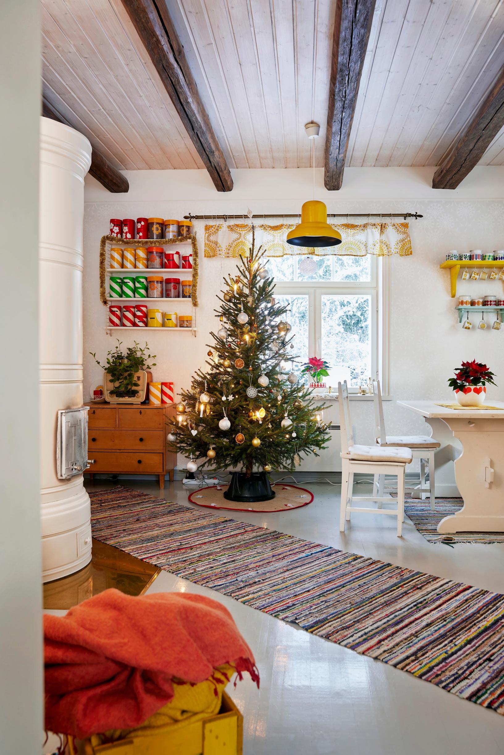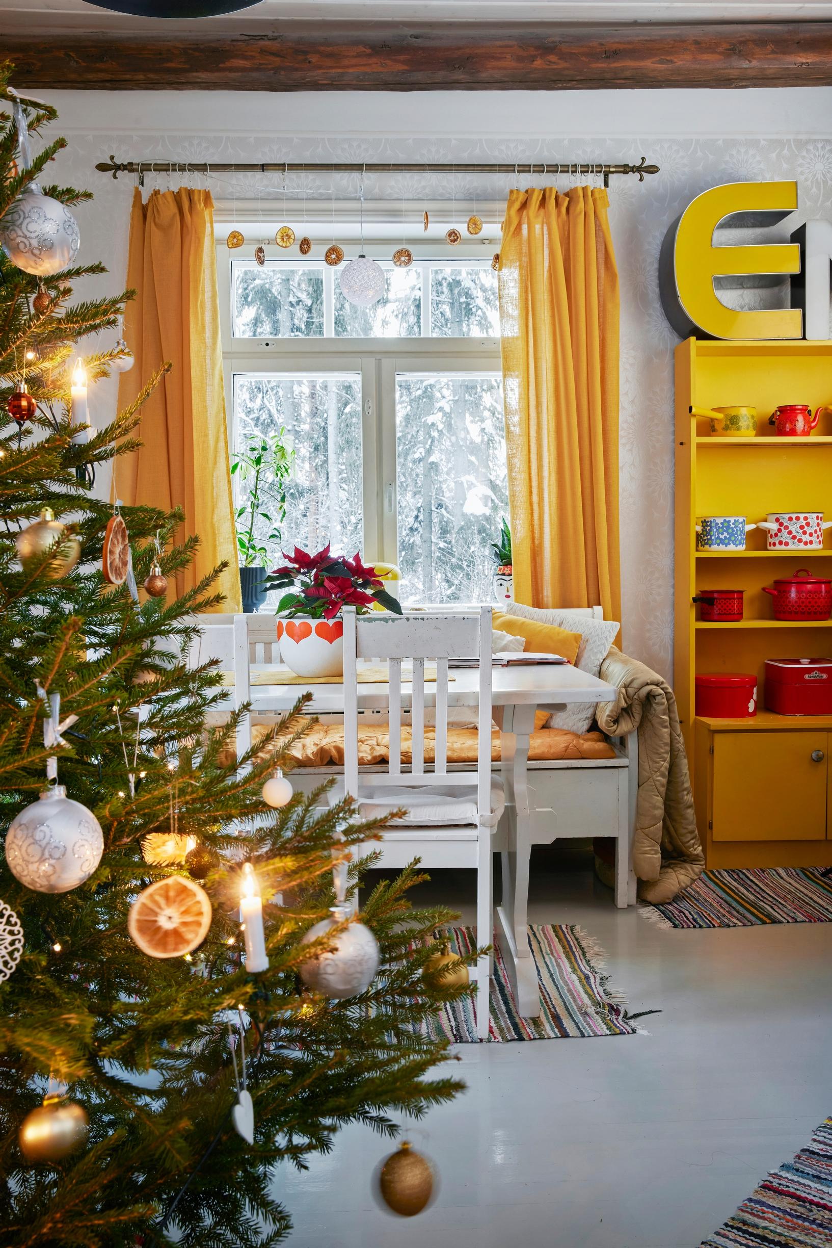 But before it’s time for the Christmas mattresses, plenty happens in this century-old log house. In mid-November, decorative lights go up outside, and stars appear in the windows. Christmas flowers are planted in cheerful retro containers, and the living area is beautifully decorated. Even though the home’s main color is a vibrant yellow, the flowers boast a more traditional Christmas color, red. Around the third Sunday of Advent, the family brings in a real spruce tree adorned with subtly fragrant dried orange slices.