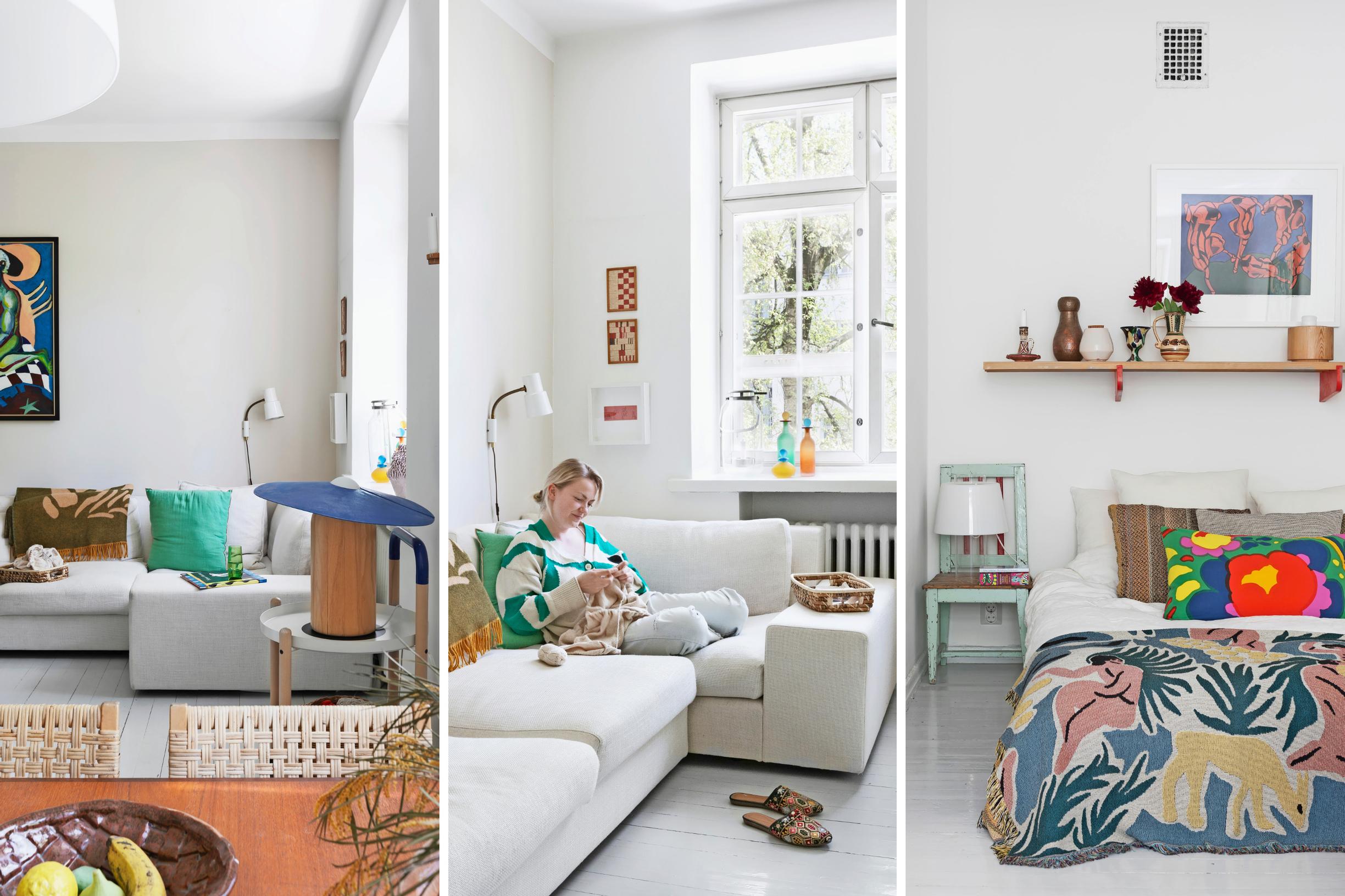 The street in Helsinki’s Vallila neighborhood is lively, but this courtyard-facing apartment remains peaceful. Light filters in beautifully through the birch leaves swaying in the breeze. Interior architect Emilia Lonka’s home is a mirror image of its resident: intentional, playful, and cozy. Emilia has successfully furnished her rental home to reflect her own style with the help of lighting, art objects, and textiles. The floor plan of this mini-home is varied, and the atmosphere feels airy. Light-colored surfaces create a sense of space in the narrow living room.