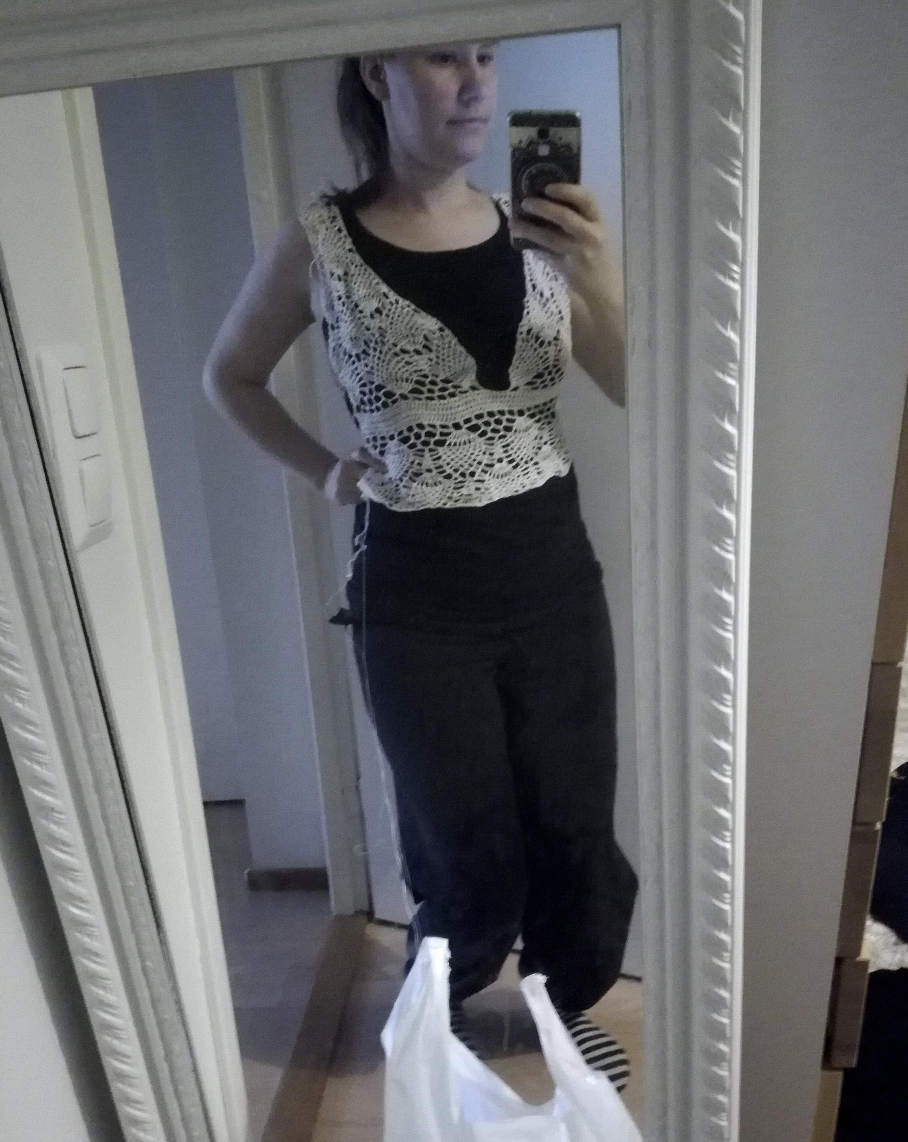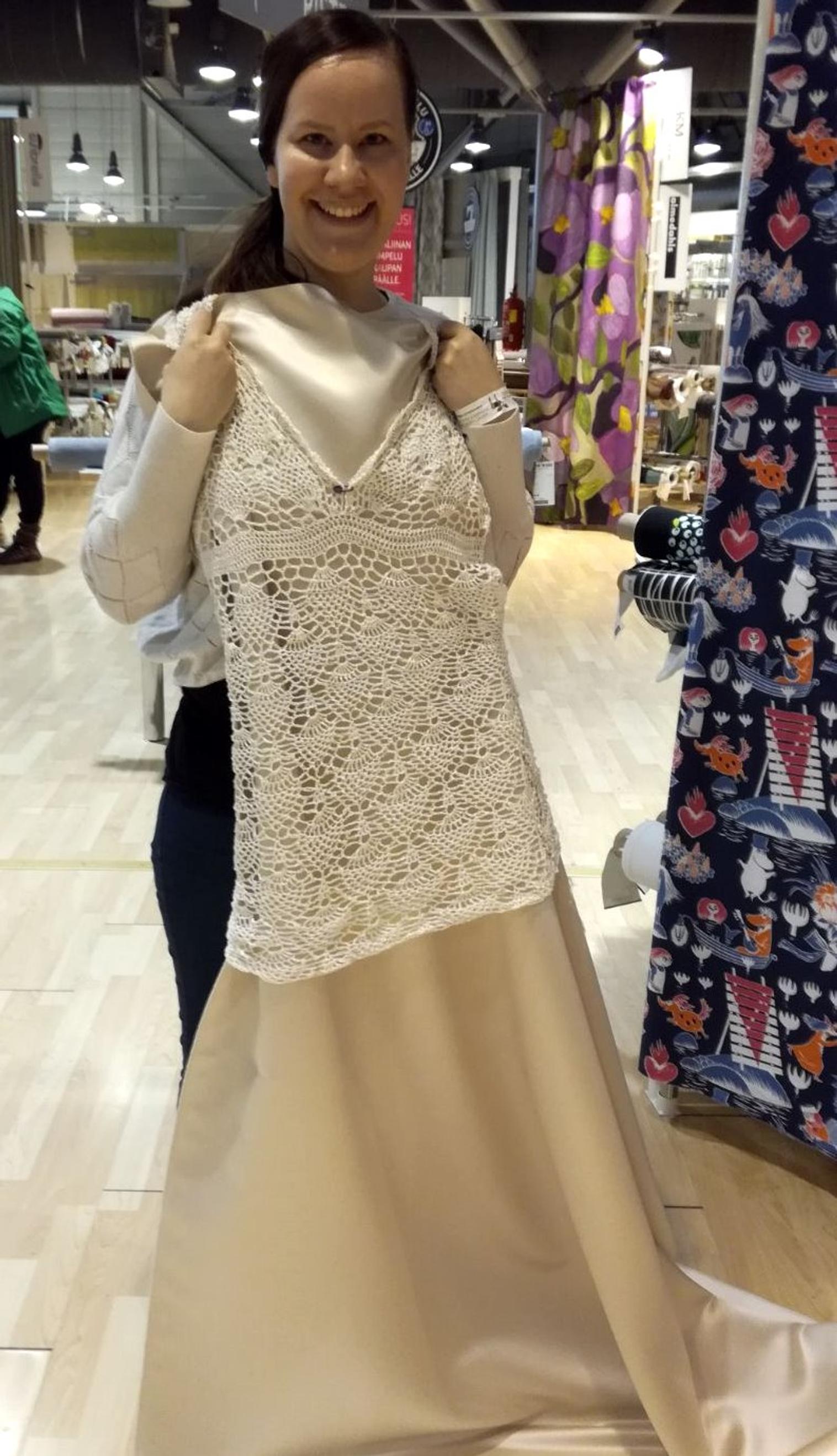 My sister Johanna Aakkula sewed the underslip to my measurements and helped block the crocheted dress.