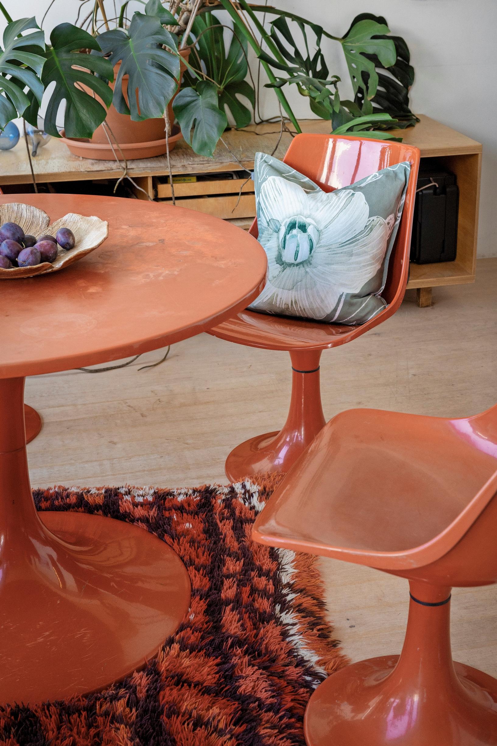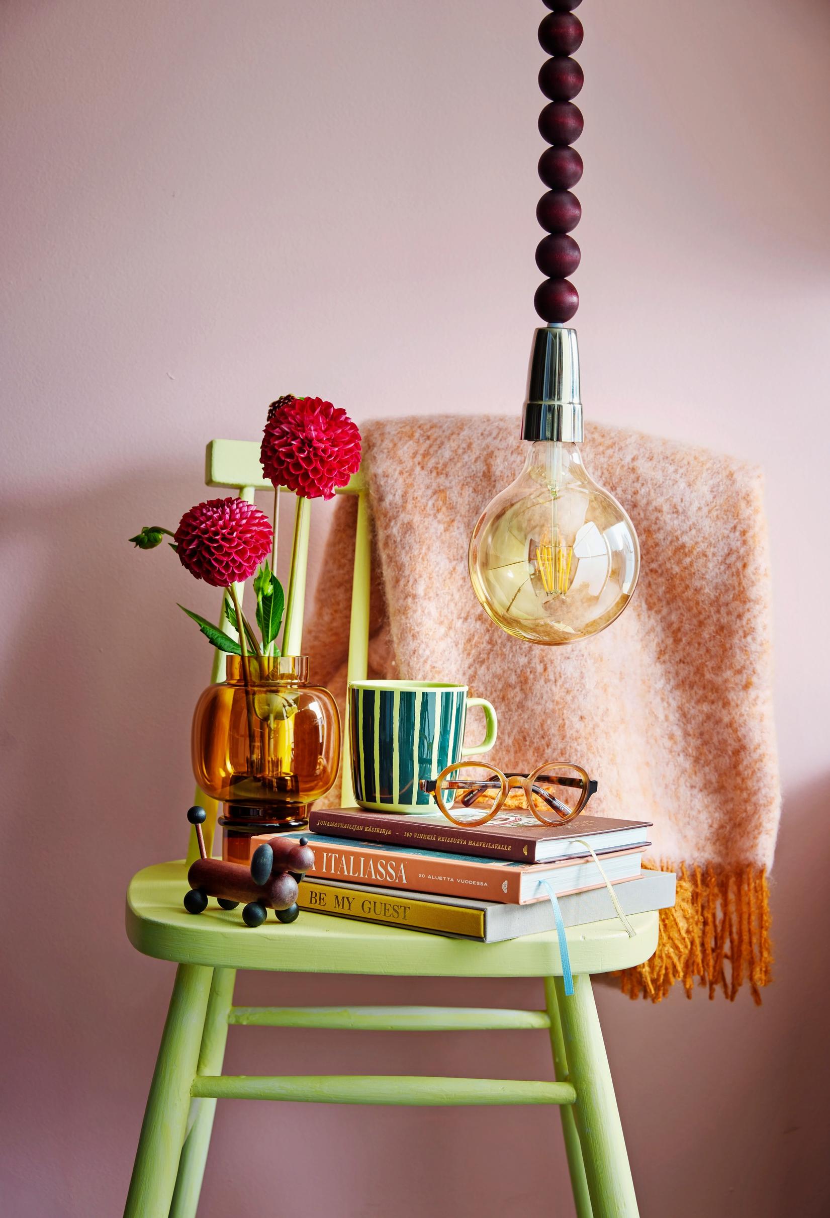 Inquiries: eyeglass frames from Specsavers; mohair throw from Lapuan Kankurit; Piccolo mug from Marimekko; and the plum Reitti pendant lamp from Aarikka. Dahlias by Anna Niitty. The spindle-back chair and Heikki Orvola’s lantern are Tori finds, and the books are photo props.