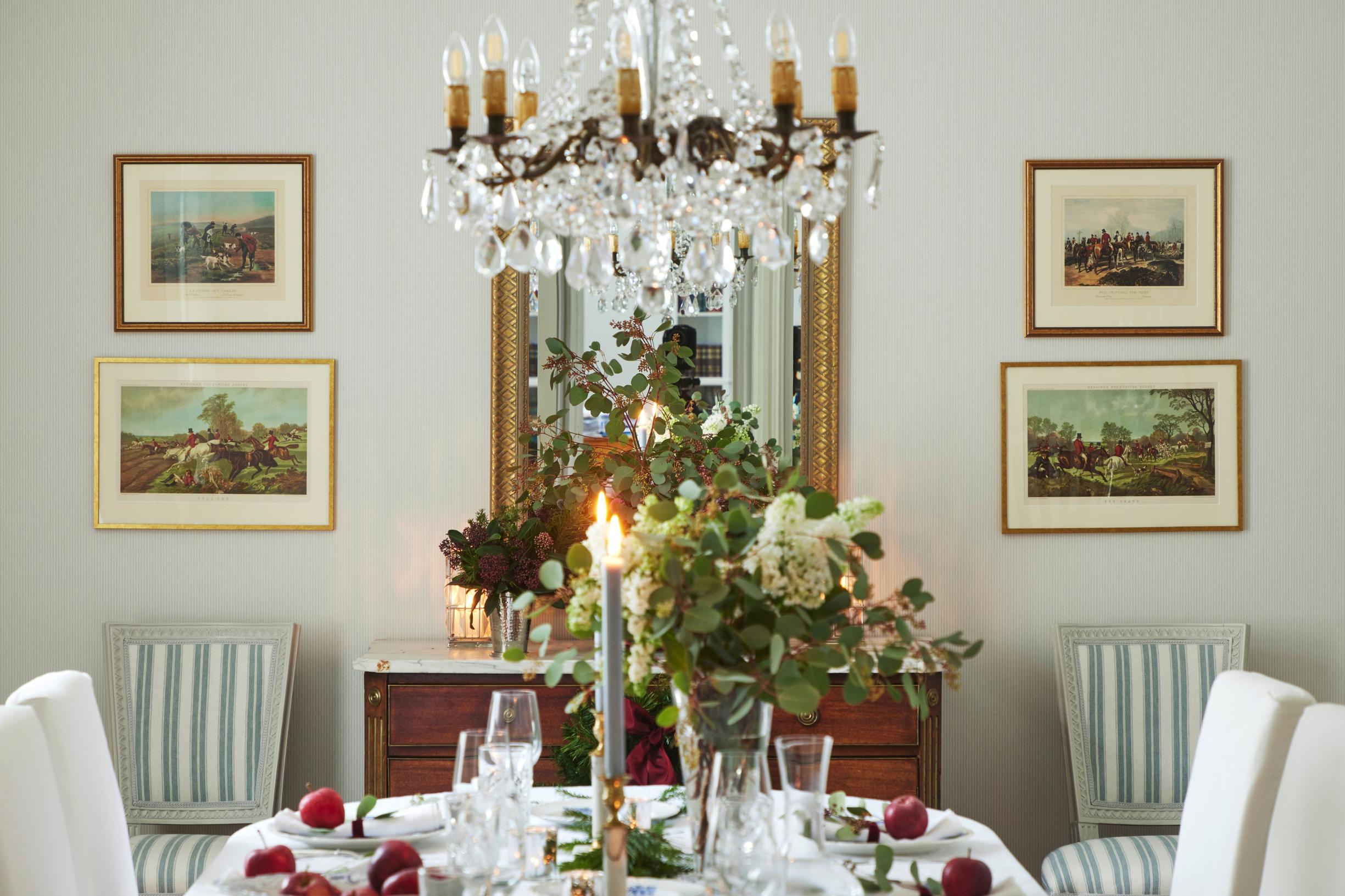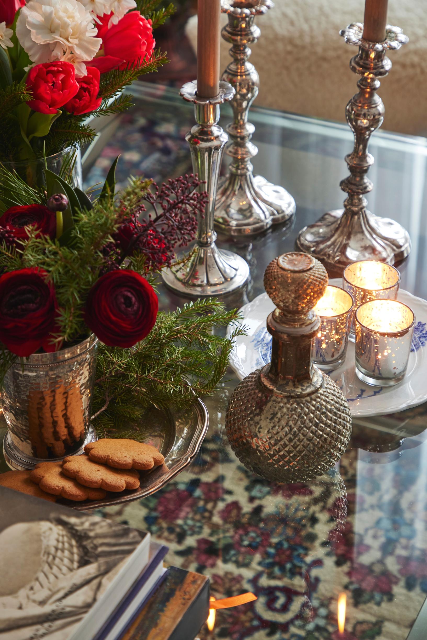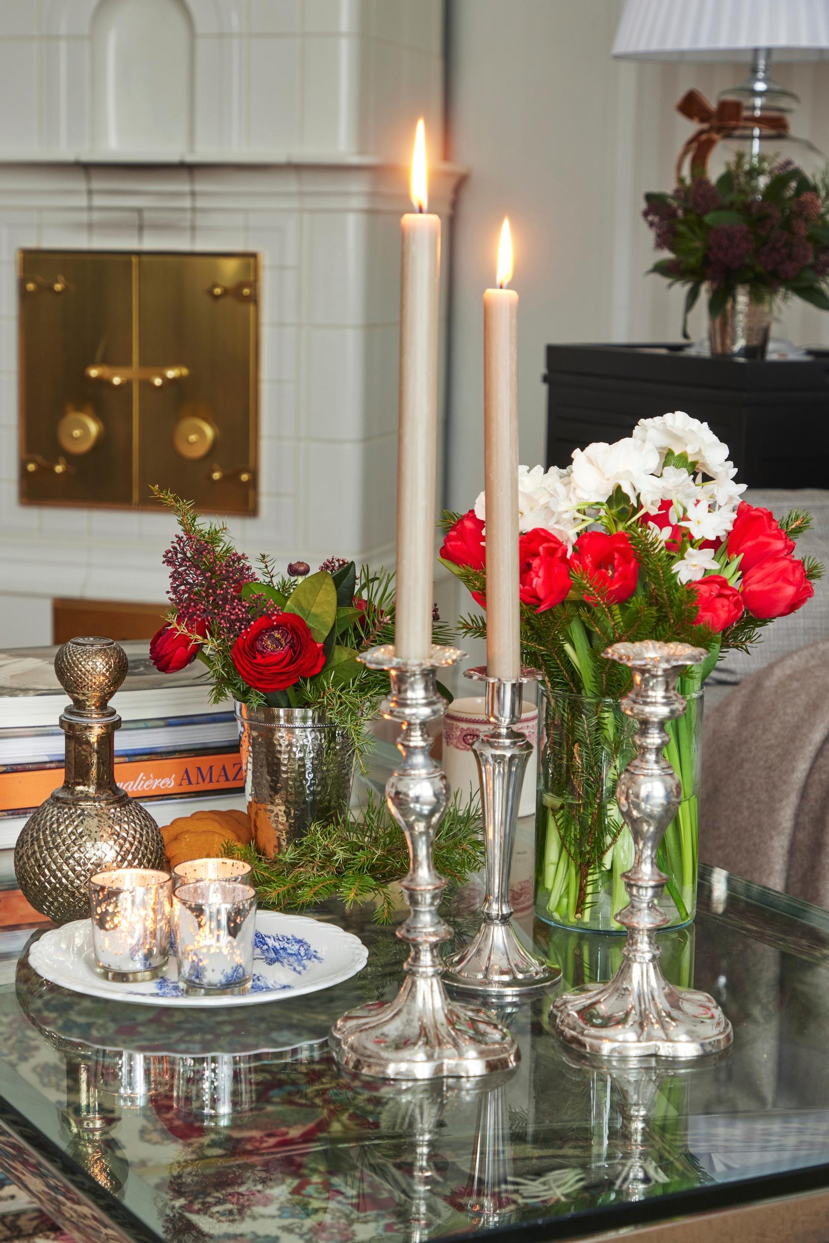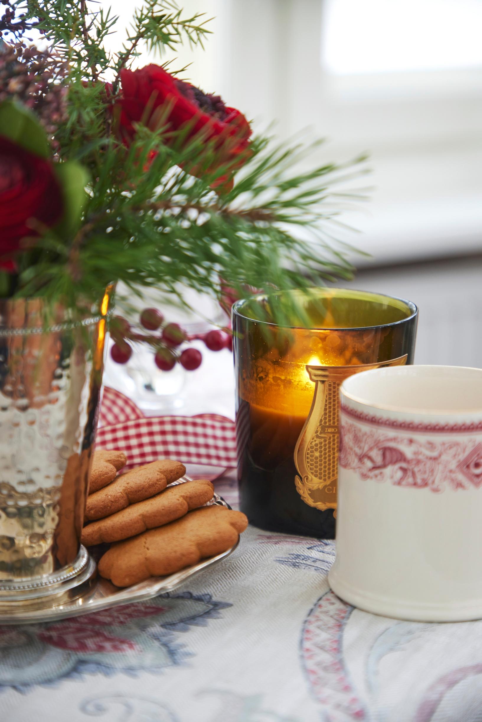 For Christmas flowers, Elina favors traditional British choices like paperwhites, tazettas, and carnations. One vase in the center of the dining table features a surprising burst of white lilac branches, while another holds skimmia and bright red roses.