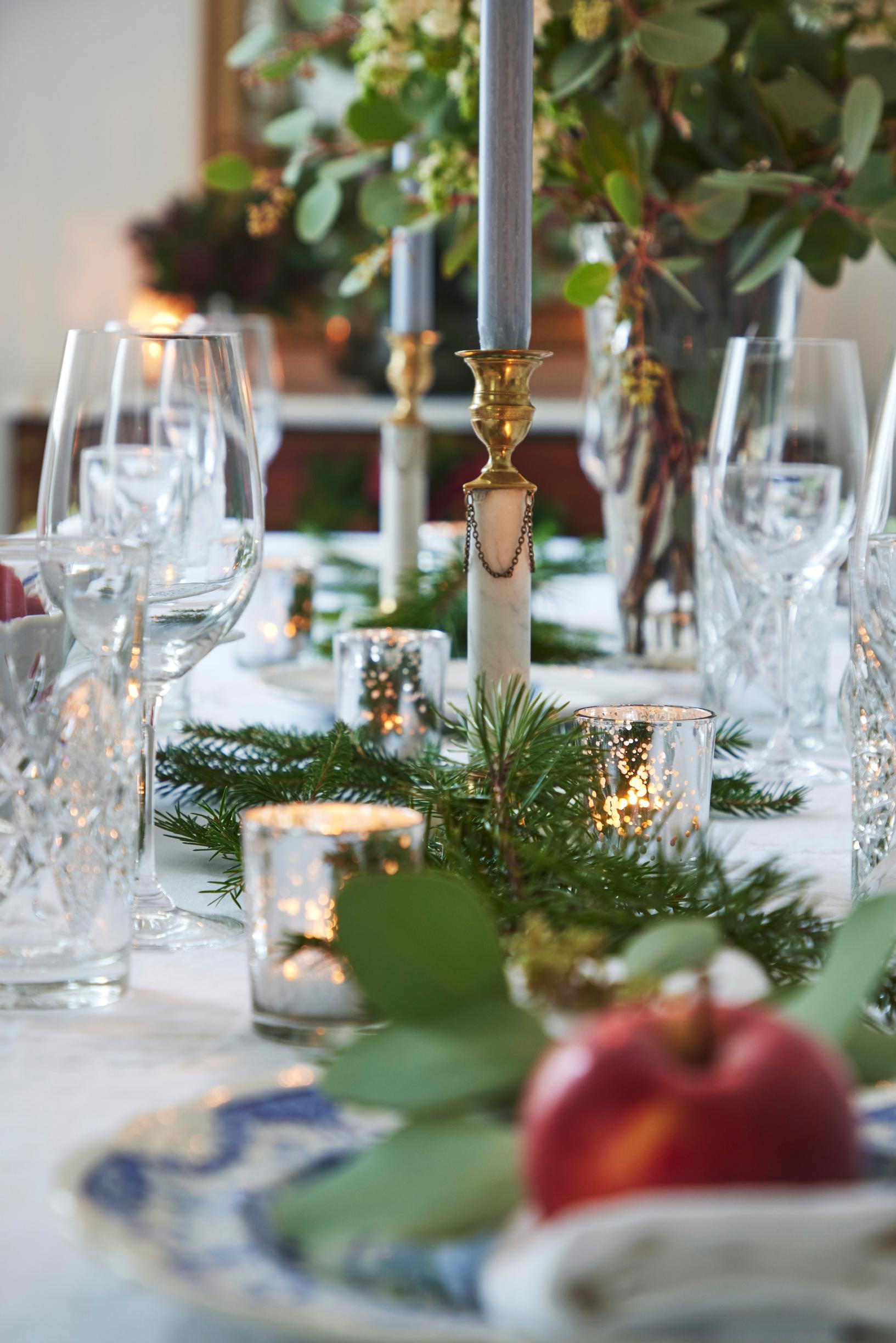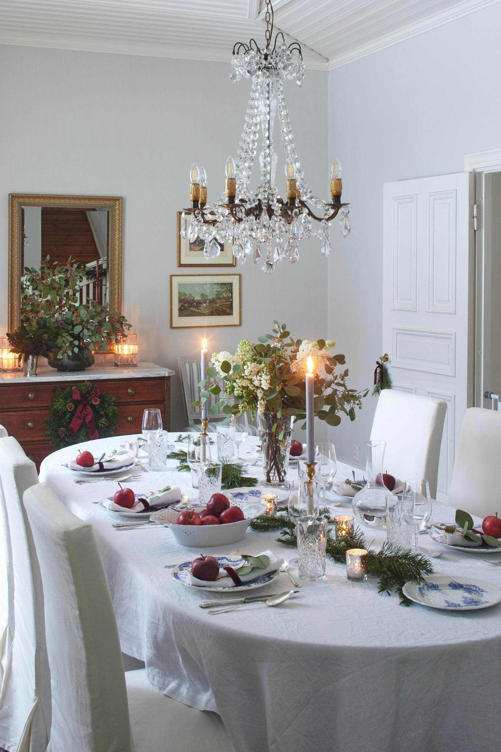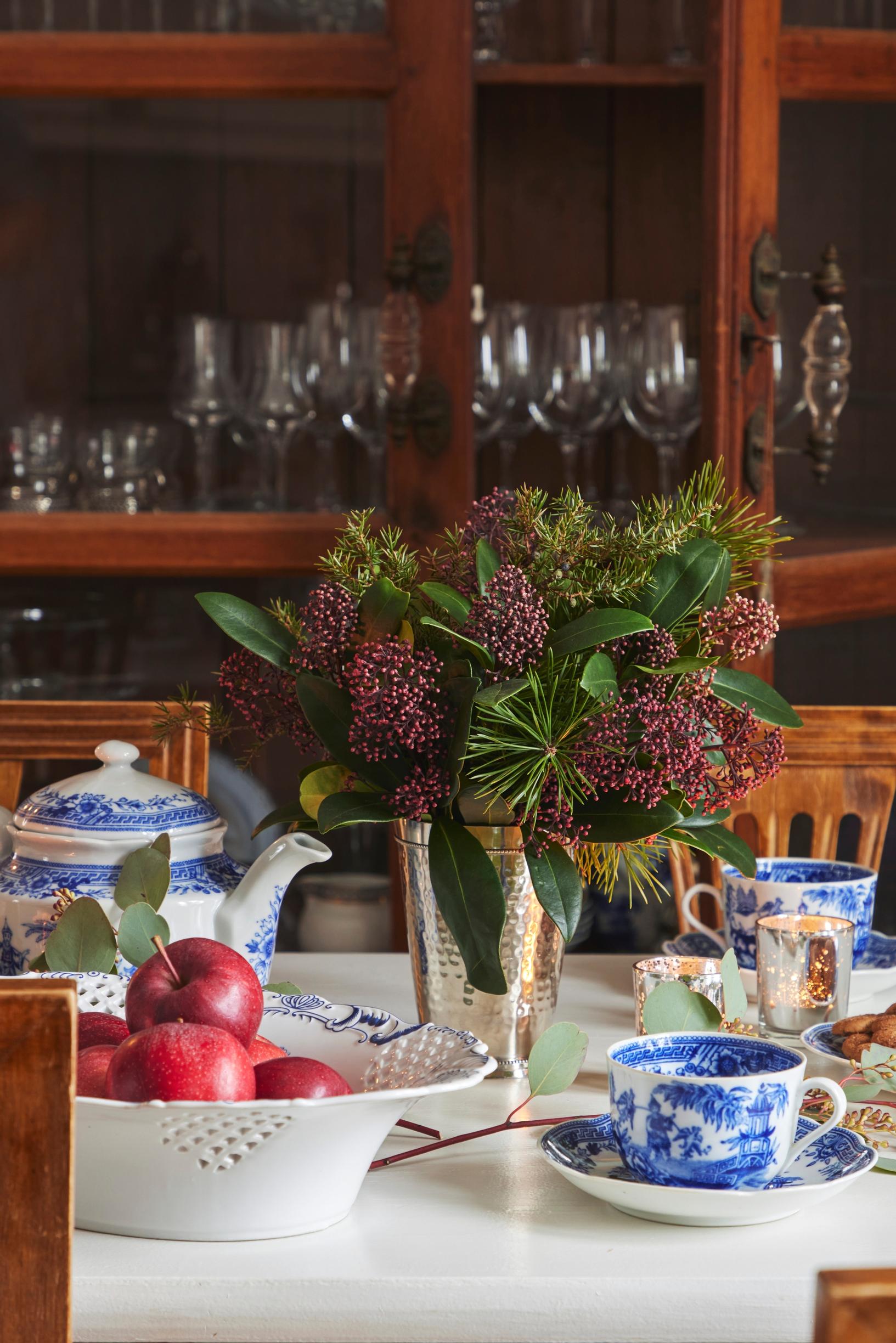 After breakfast, they venture outdoors for fresh air, then return to the veranda for cocoa, gingerbread cookies, and rosy-cheeked apples. Later, everyone gathers around a large dining table set with the same blue-and-white Davenport dishes used in many past Christmases, even in previous generations. They linger over a fish-based meal for hours by candlelight.