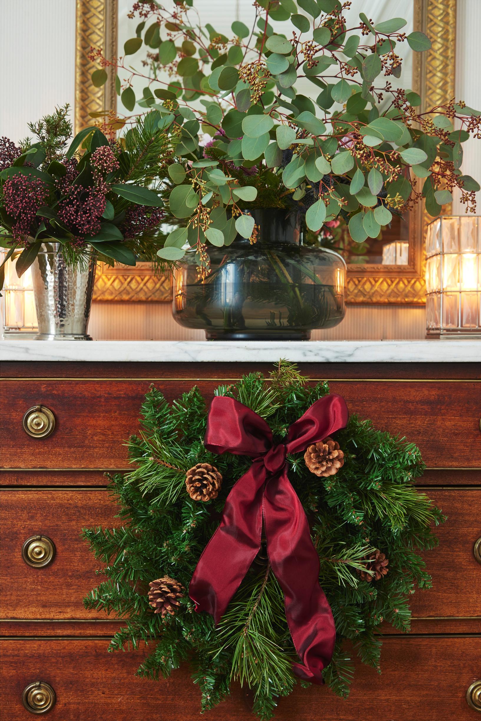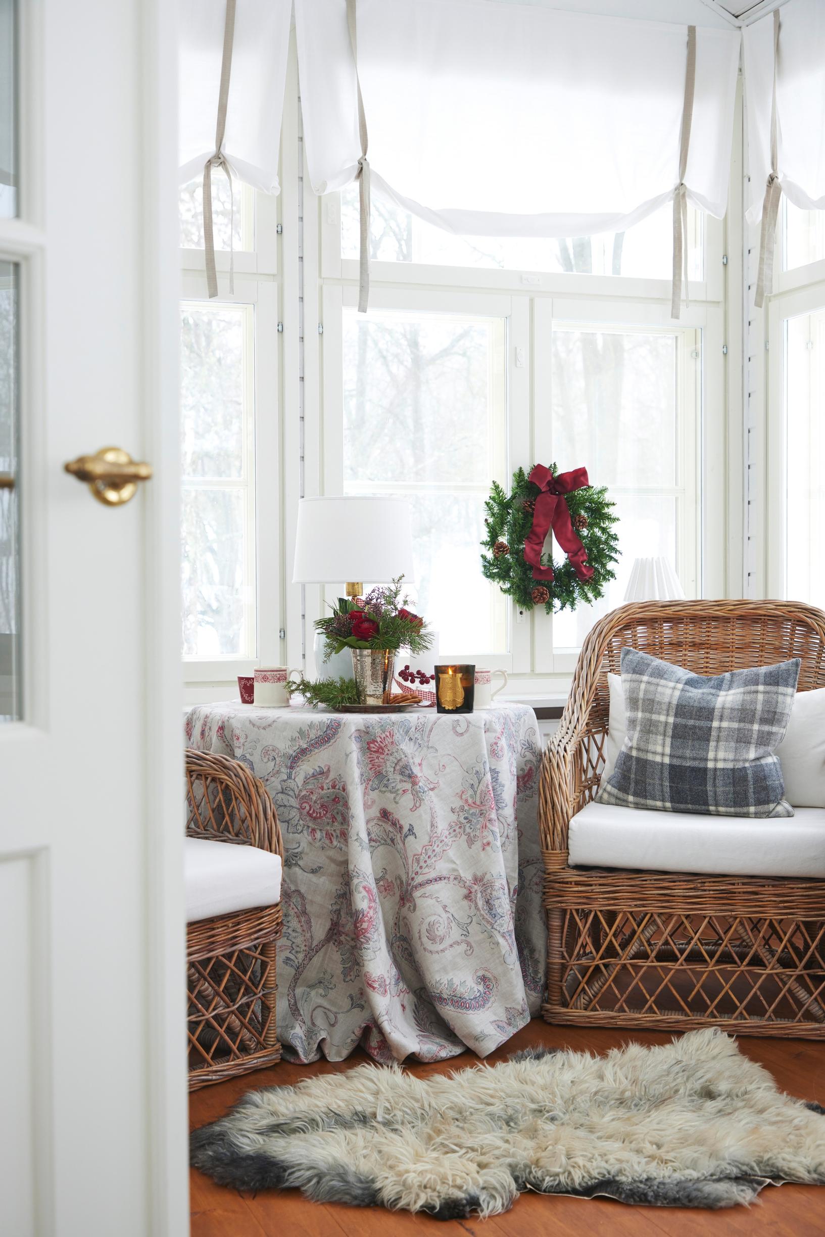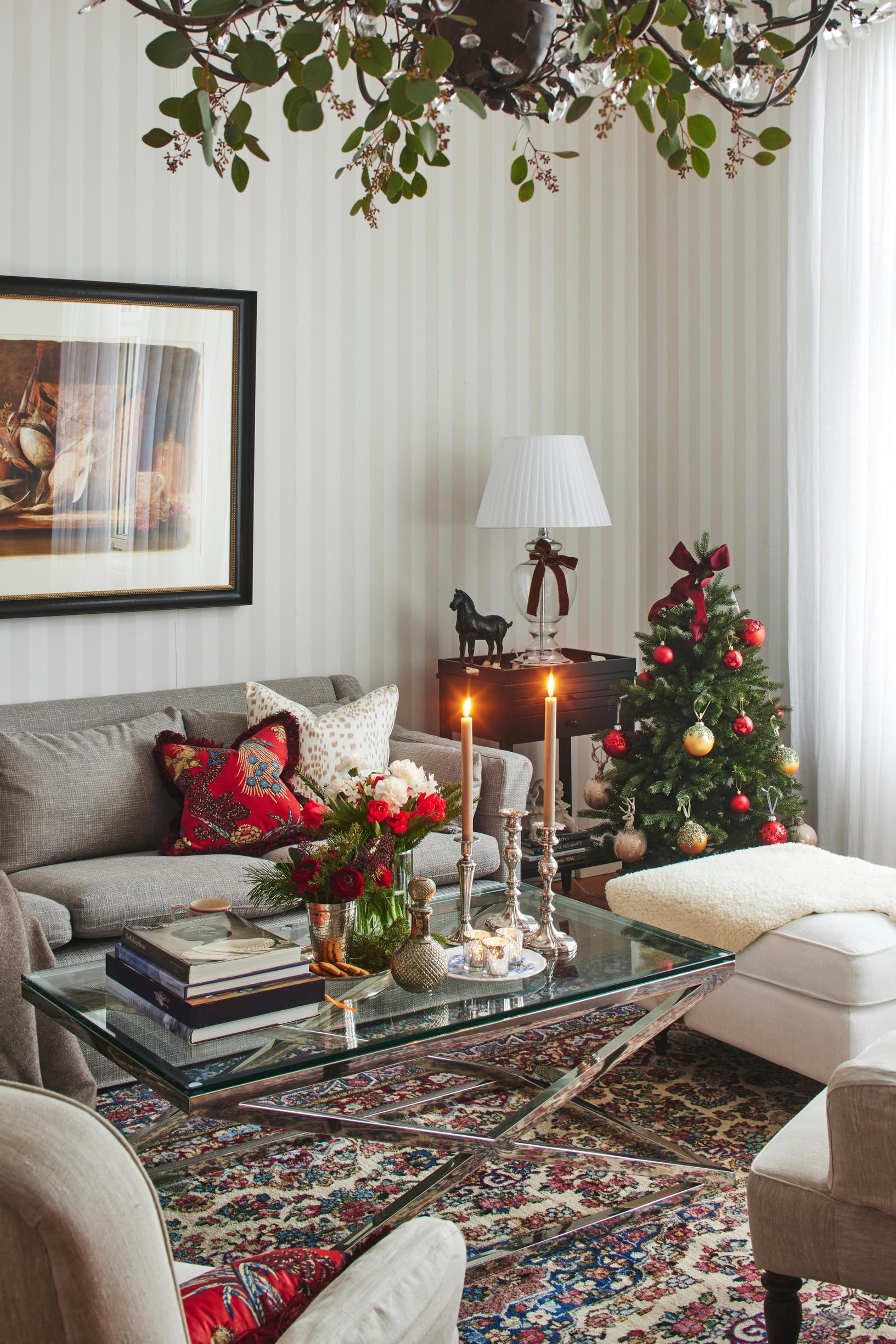 In this bright, classically furnished home, Elina has arranged basketfuls of red and green in the form of flowers and evergreens, rather than just ornaments. From the stair banister to the entryway mirror and various floral arrangements, she has hung greenery and eucalyptus branches everywhere.