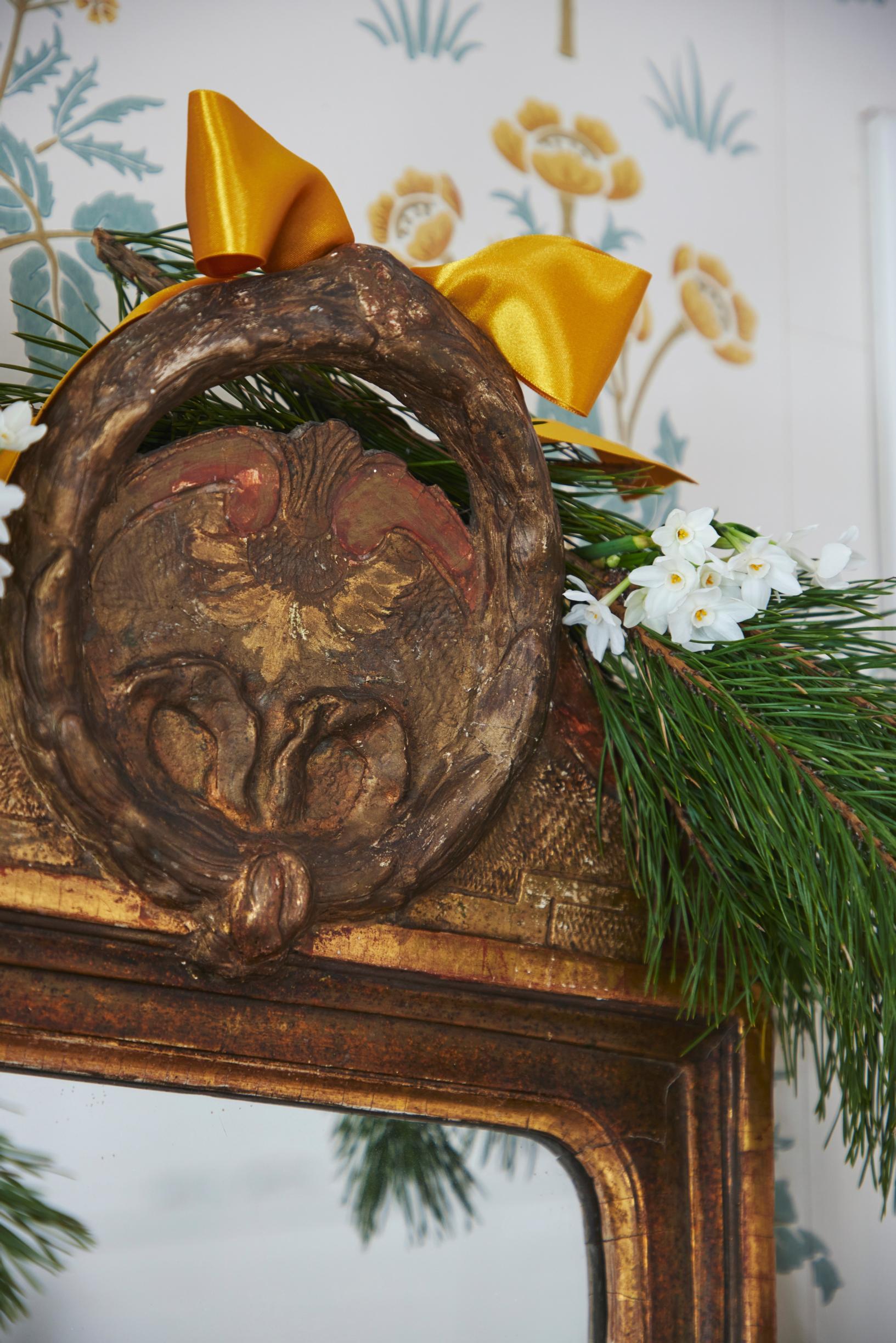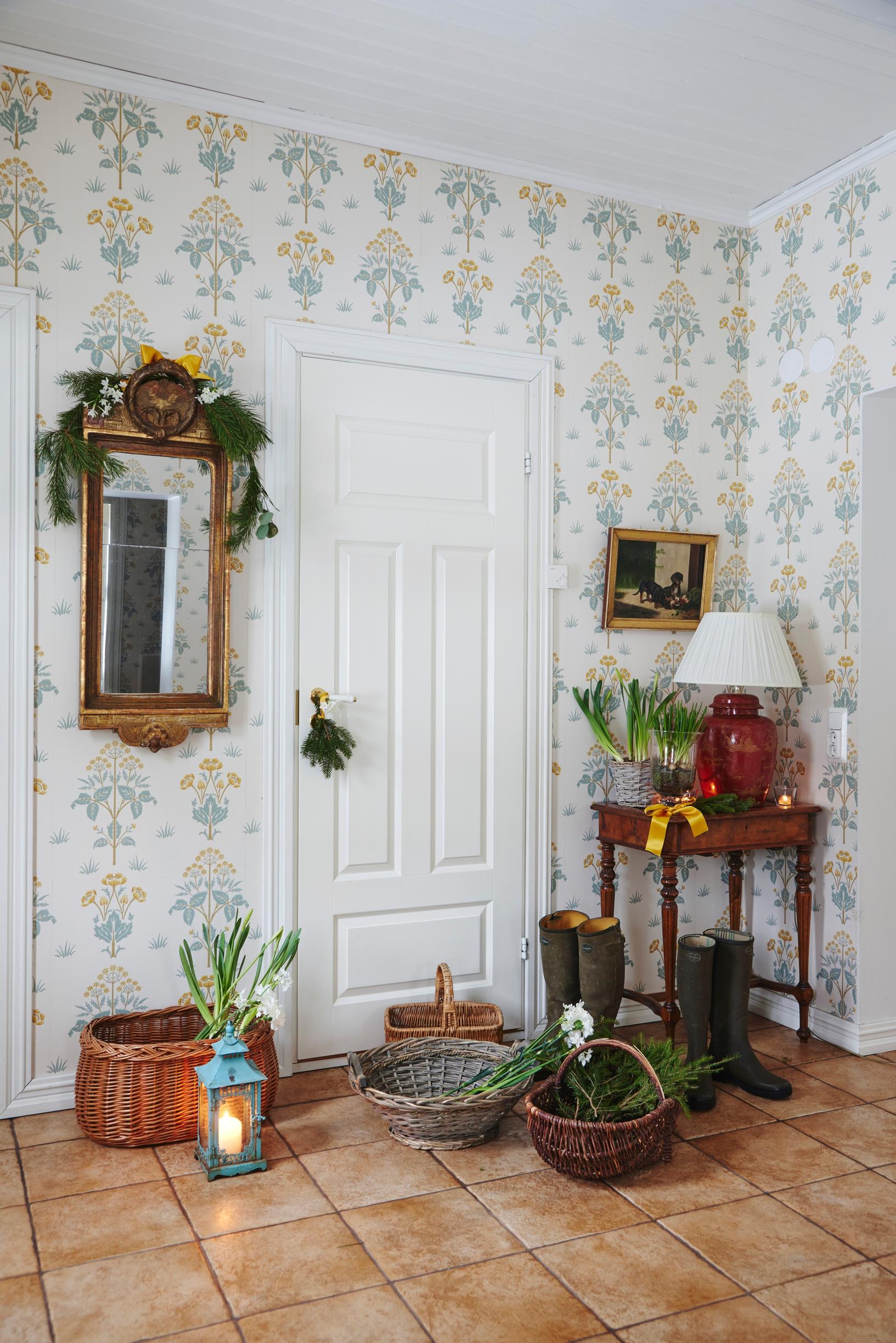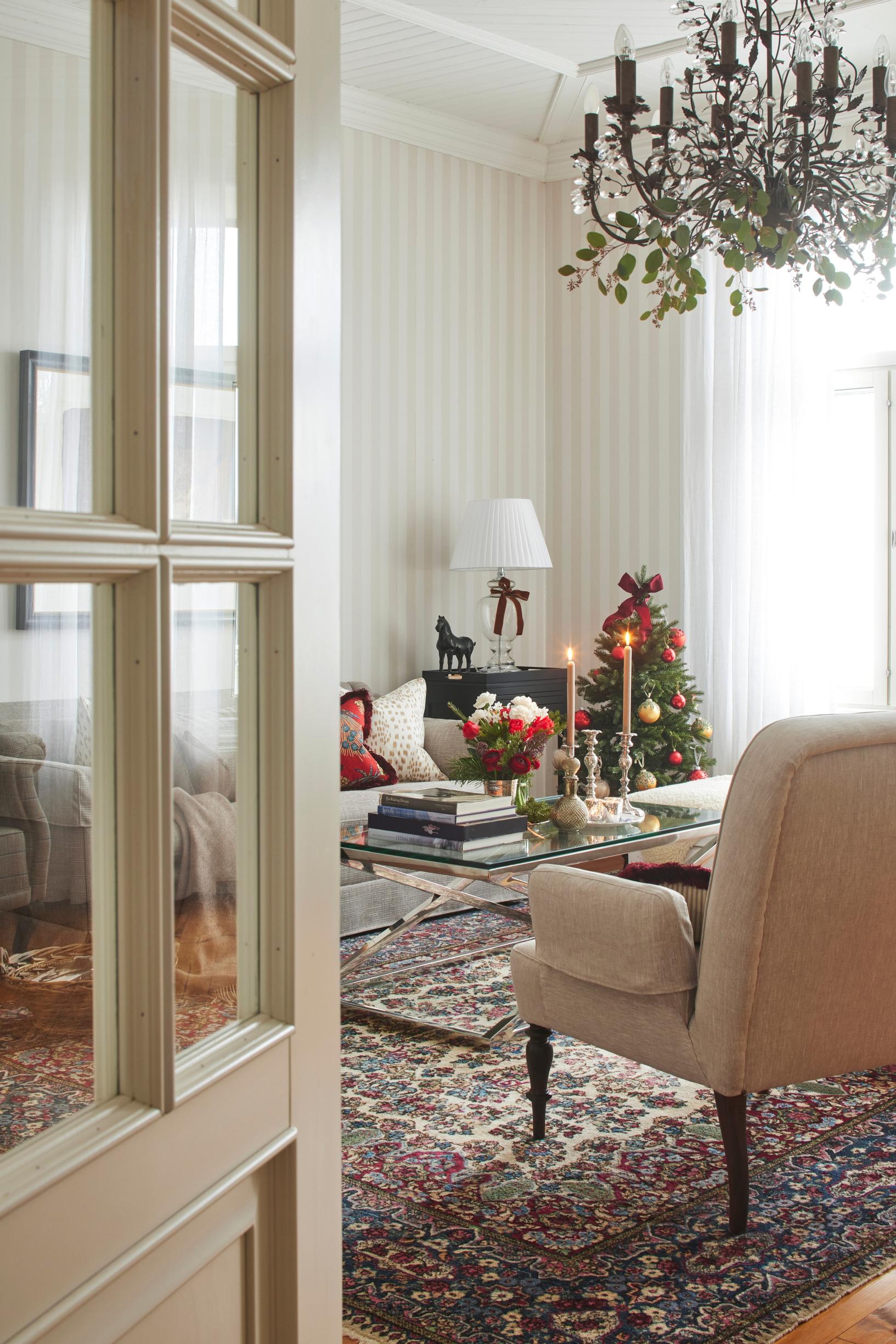 In this bright, classically furnished home, Elina has arranged basketfuls of red and green in the form of flowers and evergreens, rather than just ornaments. From the stair banister to the entryway mirror and various floral arrangements, she has hung greenery and eucalyptus branches everywhere.