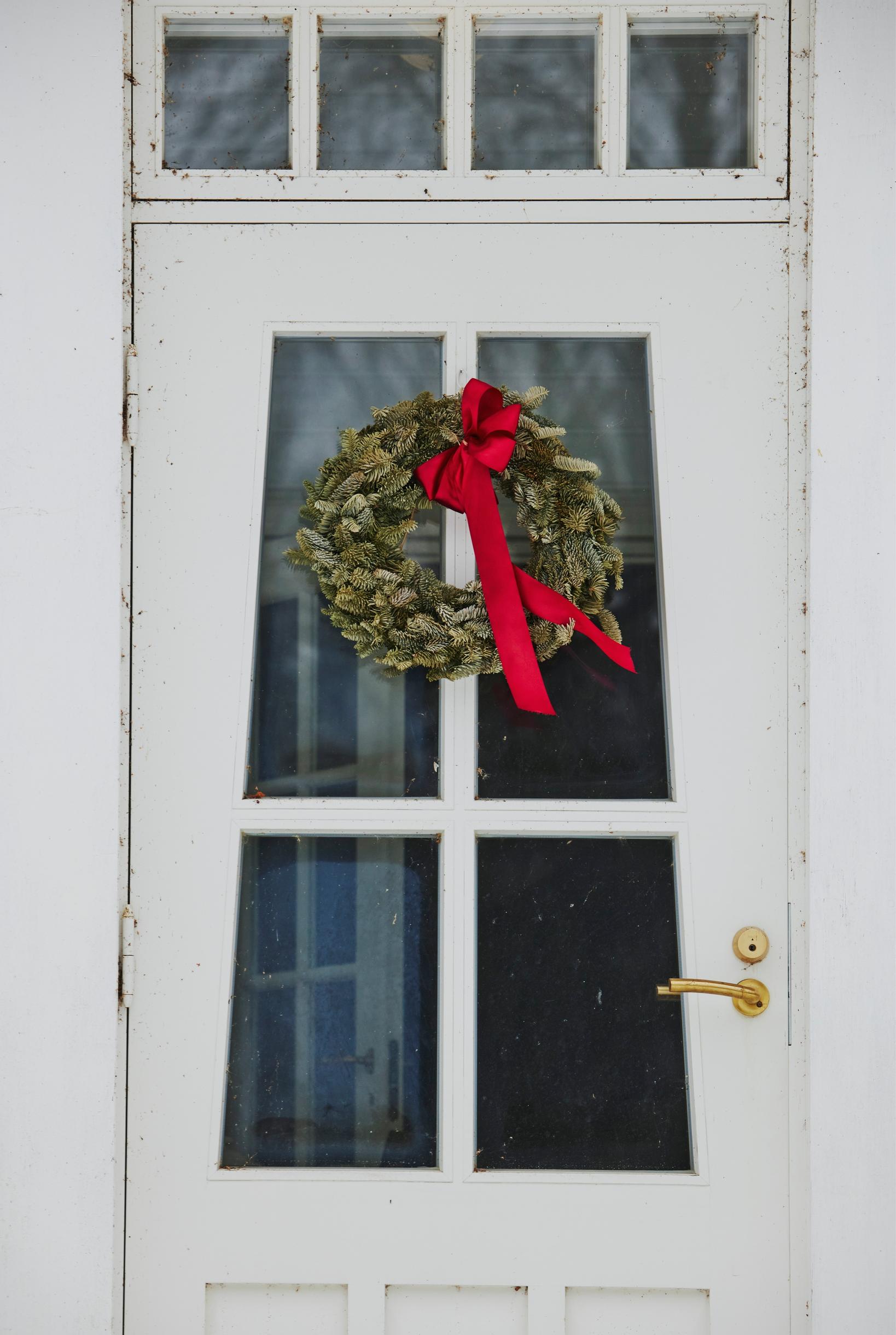 There are only a few true Christmas ornaments, mainly hanging from the Christmas tree and as singular highlights. However, ribbons abound, having been tied from silk and velvet to everything—from the tree’s peak to wreaths, lamp stands, and door handles.