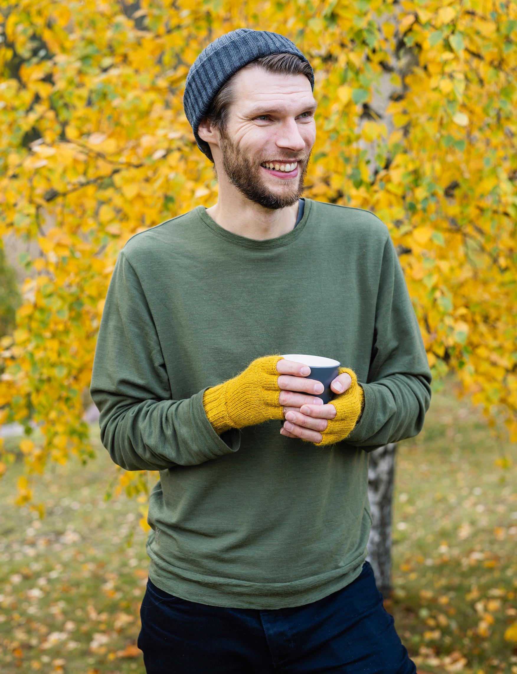 - For the men’s fingerless gloves: 1 ball of Knitting for Olive Merino yarn (100% merino wool, 50 g = 250 m) in Mustard, and 1 ball of Filcolana Alva yarn (100% alpaca, 25 g = 175 m) in Curry (285)