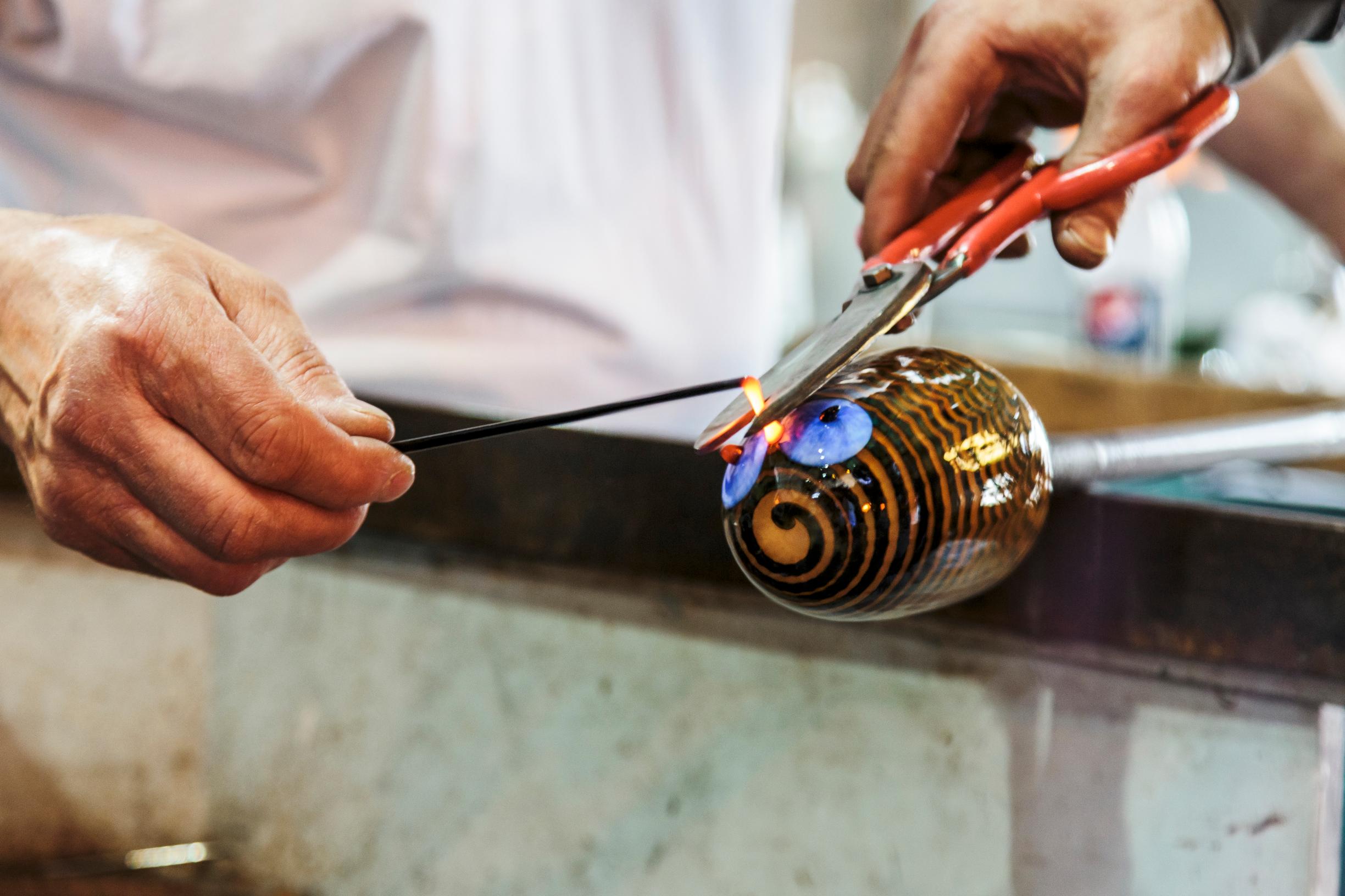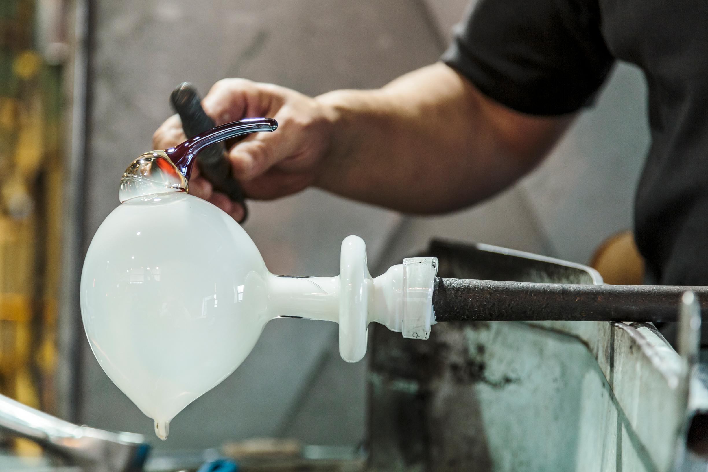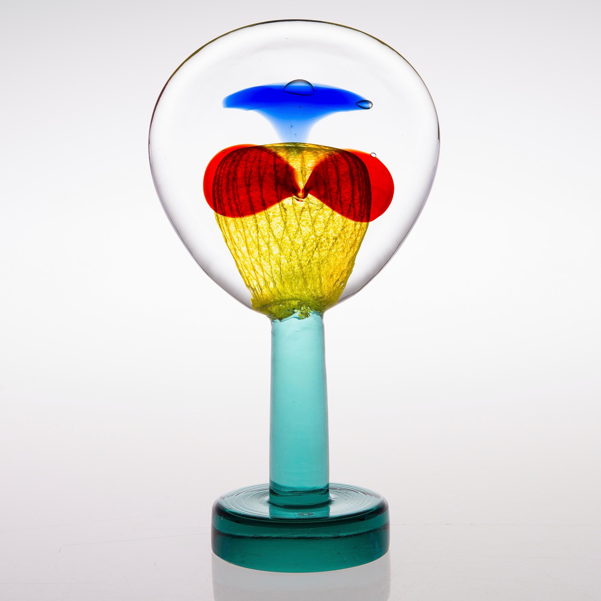 A new stage began when he got to realize his visions in Venice’s Murano, the cradle of Italian glassblowing. In the hot shop of master blower Pino Signoretto (1944–2017), pieces were created that critic Timo Valjakka described in newspaper Helsingin Sanomat: “Memories appear in the witty titles of the pieces, but all words fade away once you step into the exhibition. You’re pulled in by the stunning visual appeal of Venetian glass and Toikka’s magician‑like skill in blowing, stretching, and bending it into forms that simply enthrall and captivate.”