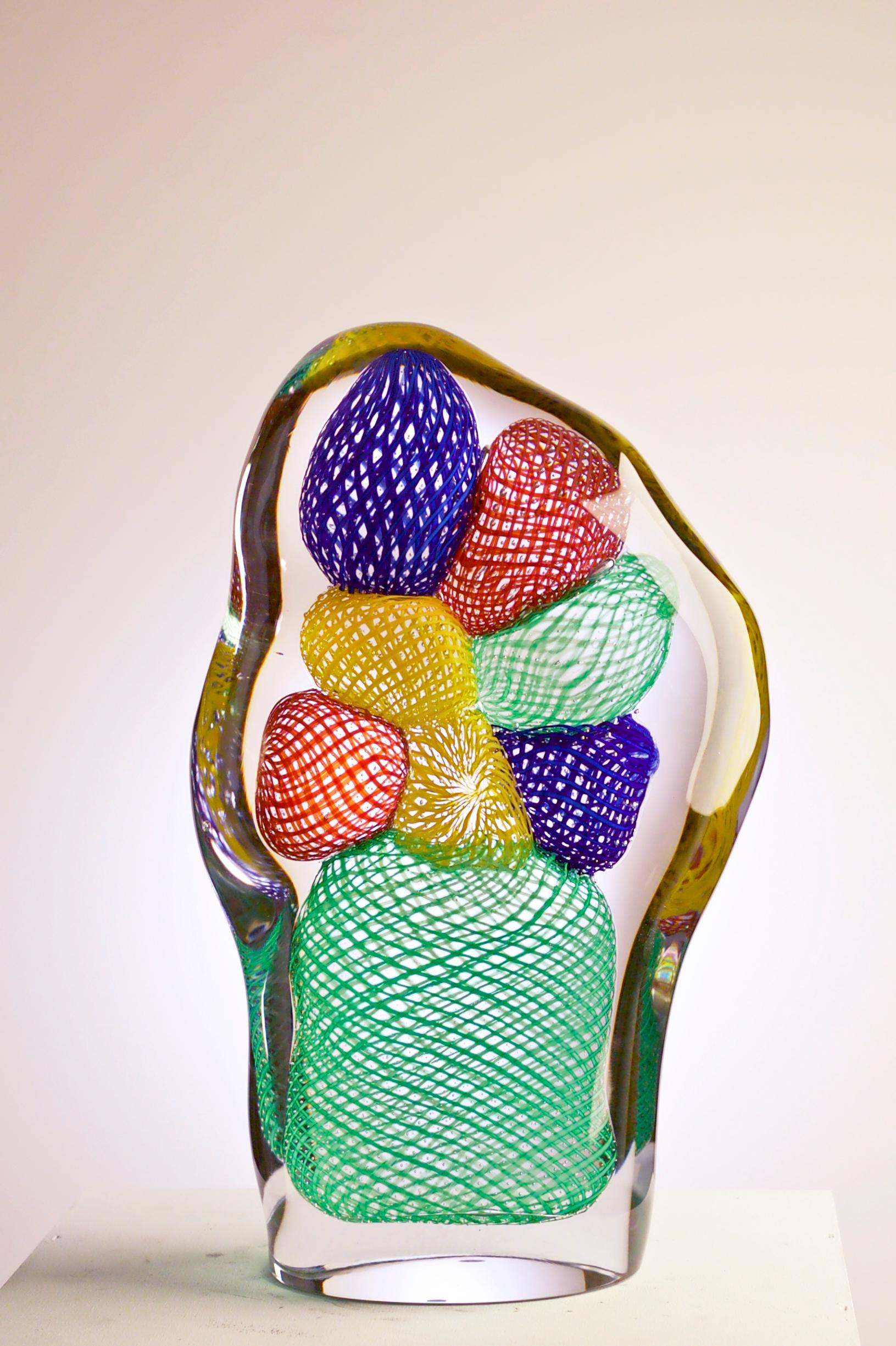 Beyond birds, Toikka got to showcase his talent through glass fruits and vegetables, returning to them repeatedly. He designed his first one‑of‑a‑kind glass fruits in the early 1980s. They were followed by small series, with the enticing Lasinen hedelmätarha (‘Glass Fruit Garden’) collection debuting in 1989. Then came Hedelmät (‘Fruits’) (1989), Lasinen kasvimaa (‘Glass Vegetable Garden’) (1991), and Vihannekset (‘Vegetables’) (1992).