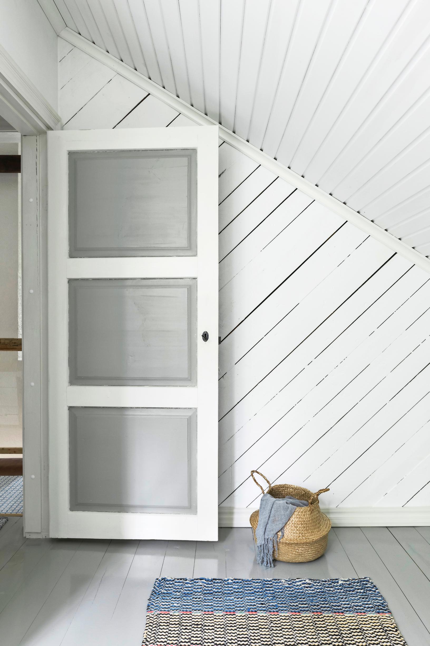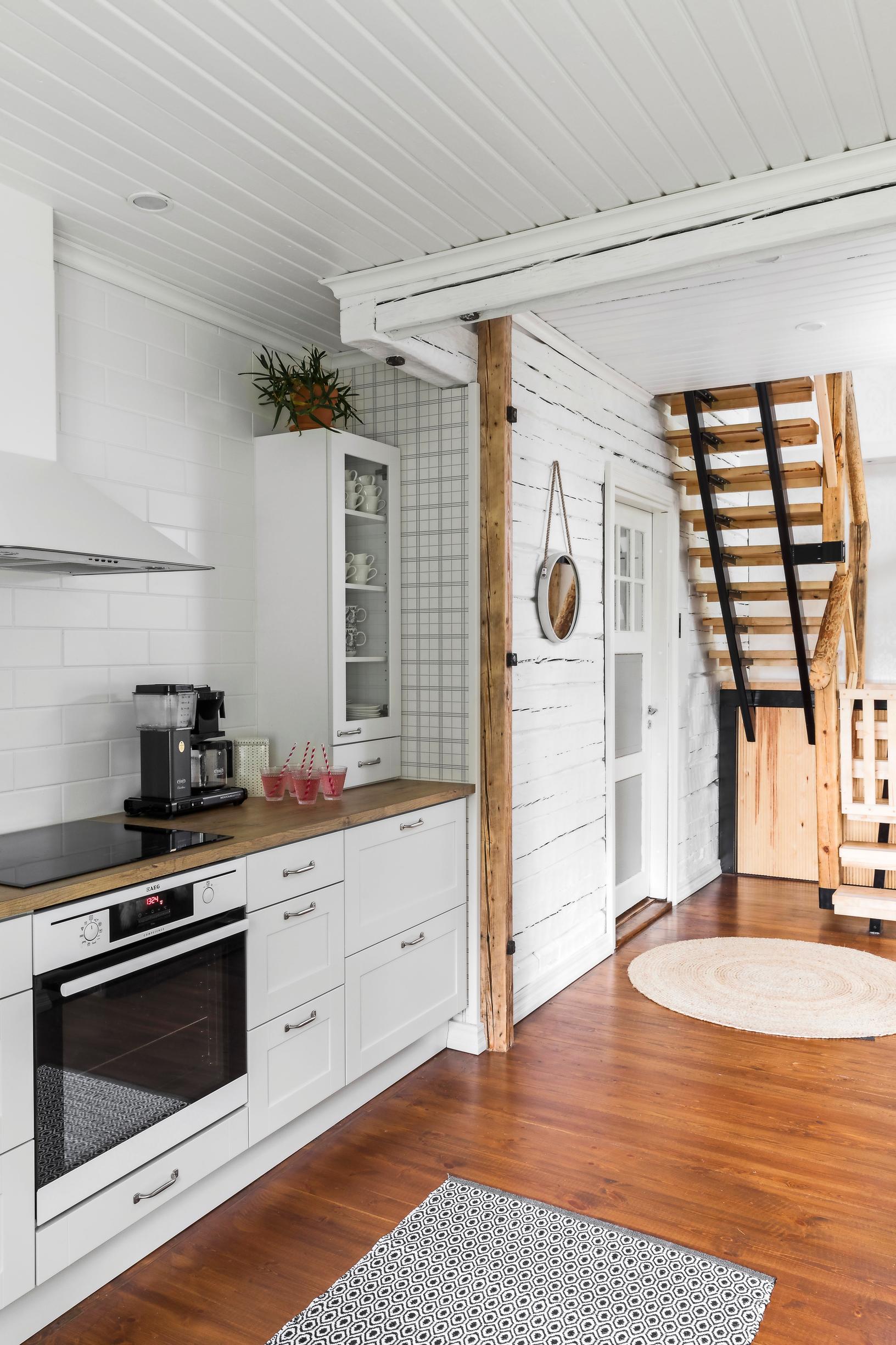 They only updated the kitchen flooring, laying the same parquet used in the living room to level both floors. The couple simply painted the older boards in the downstairs bedroom.