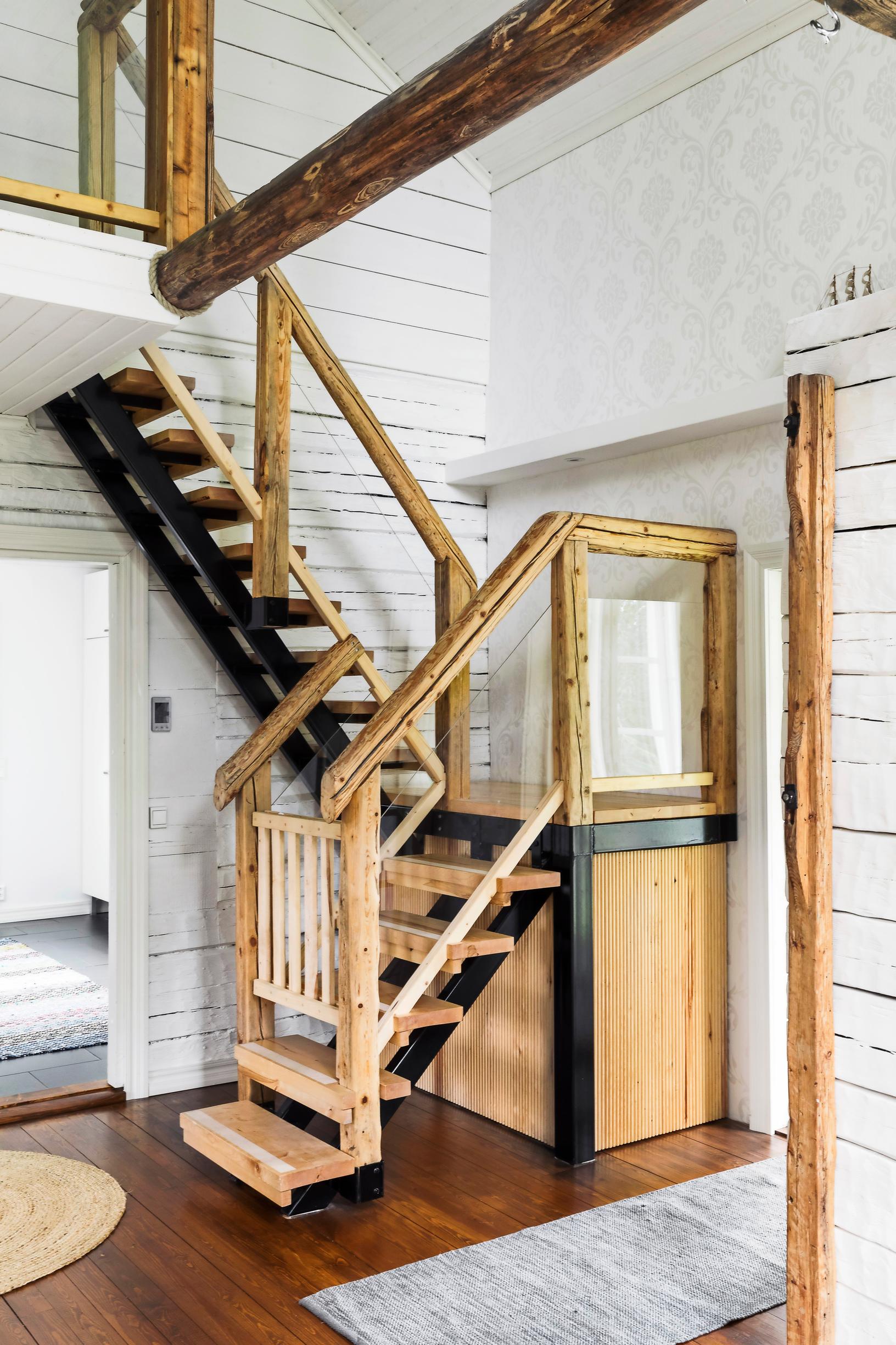 He dreamt up most of his ideas while driving his truck. The stairs stood in a cramped spot next to the external entry. Marko welded a steel frame that changes direction halfway up, and a friend painted it black. The steps are made with different shades of birch, and the railings are from dismantled wall beams.