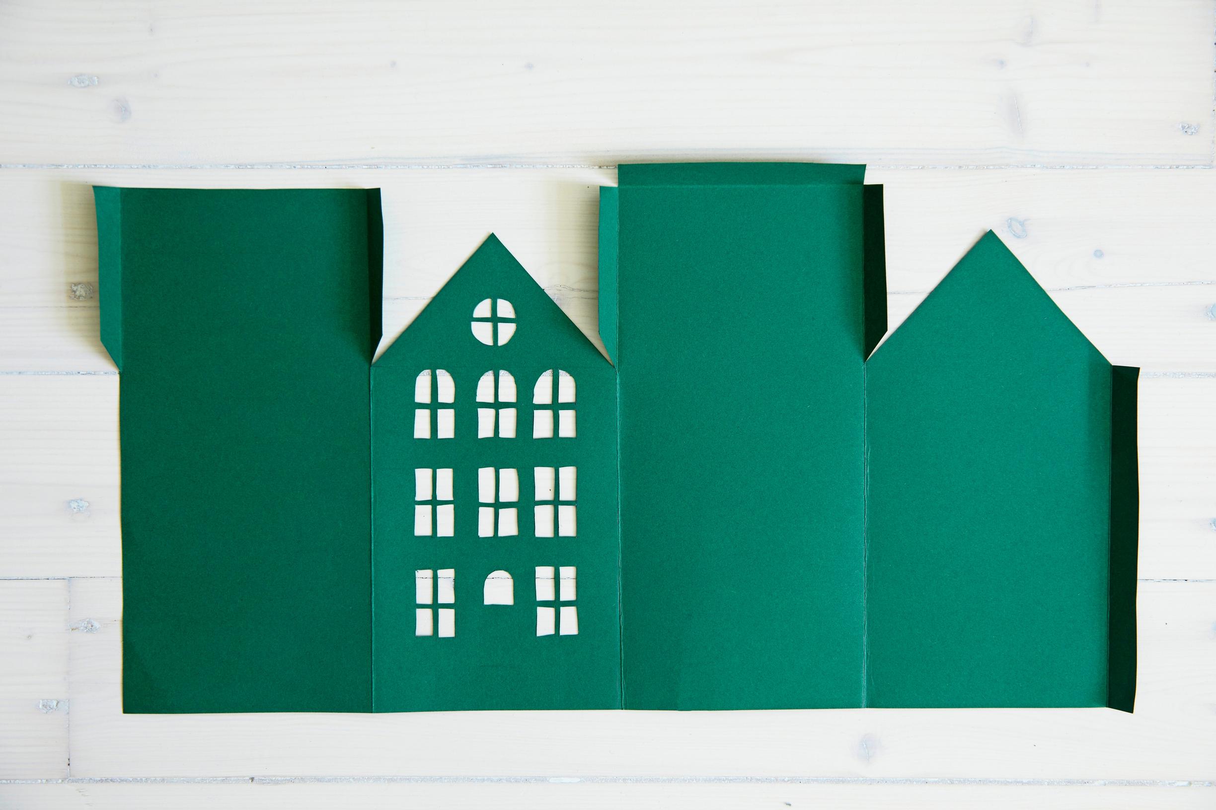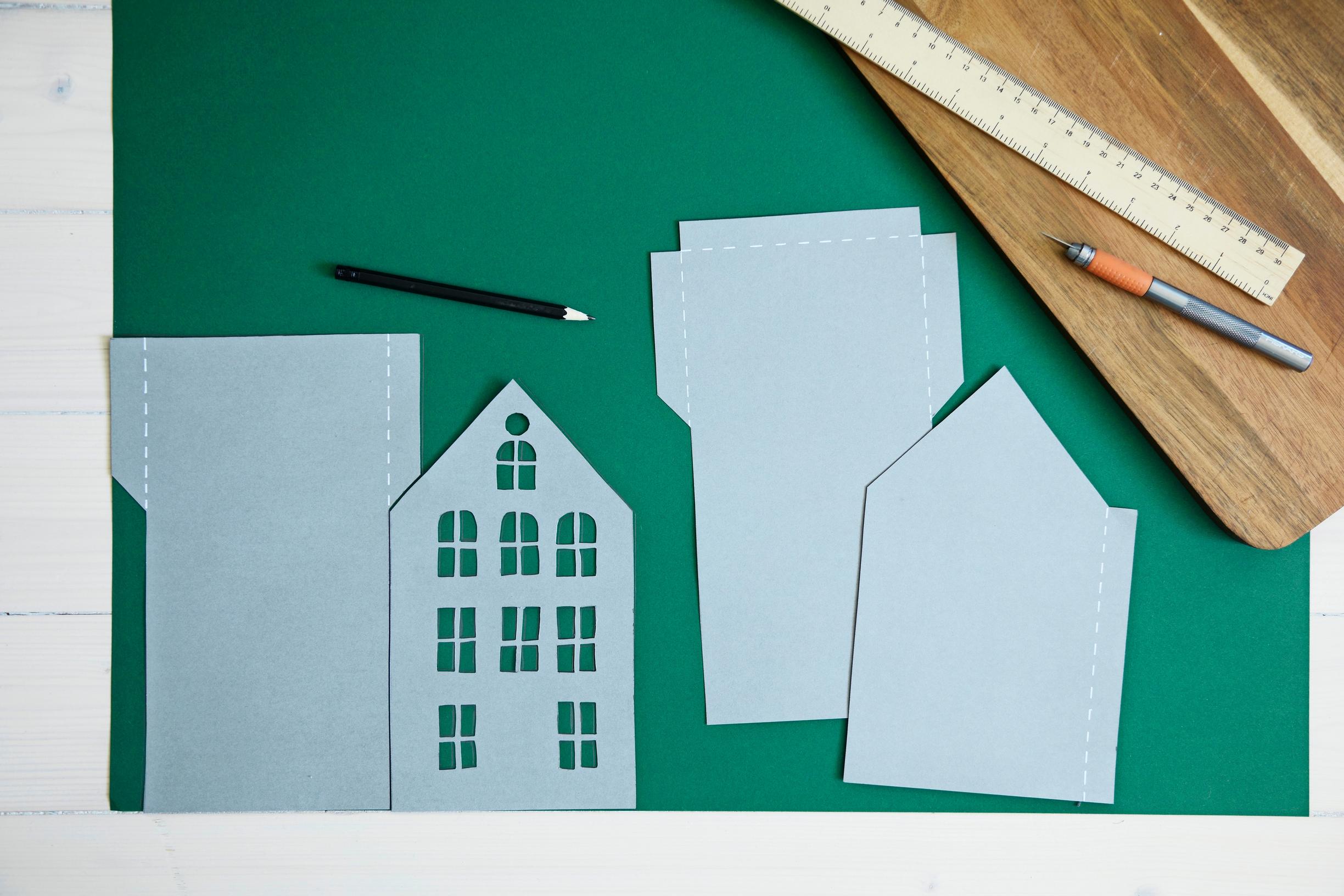 3. Cut out the templates with a craft knife on a cutting mat. Steady your blade with a ruler to keep the cuts straight. You can cut the windows freehand; a bit of asymmetry adds cozy charm.