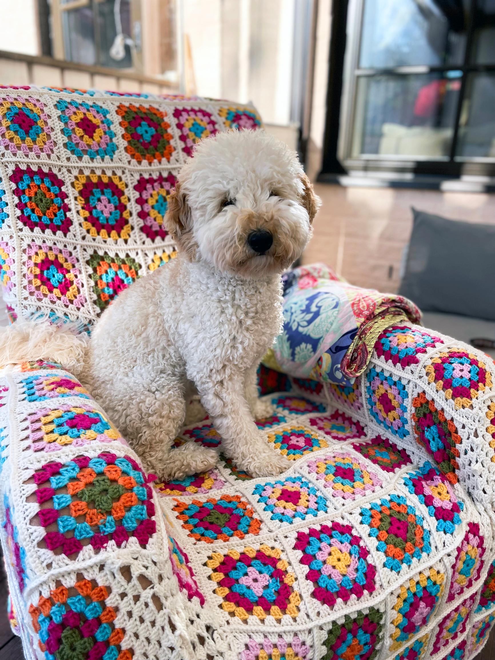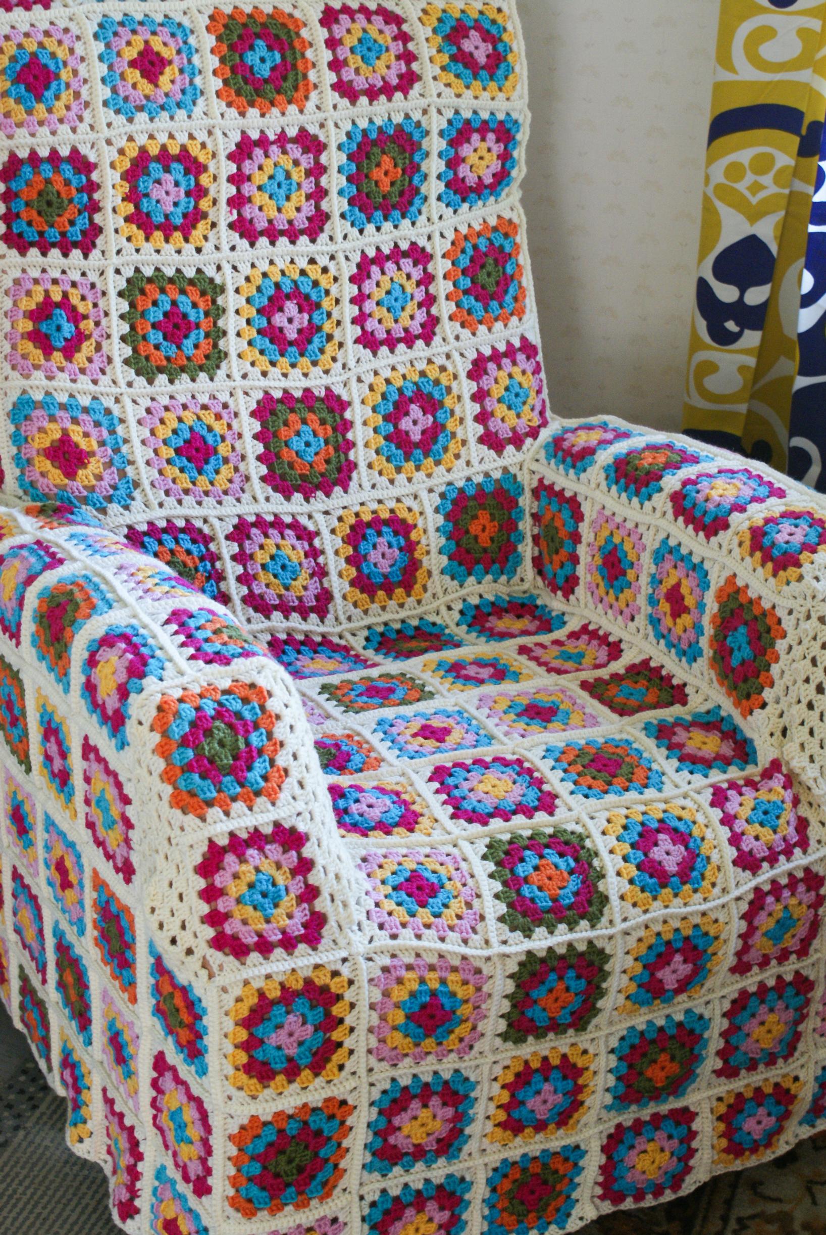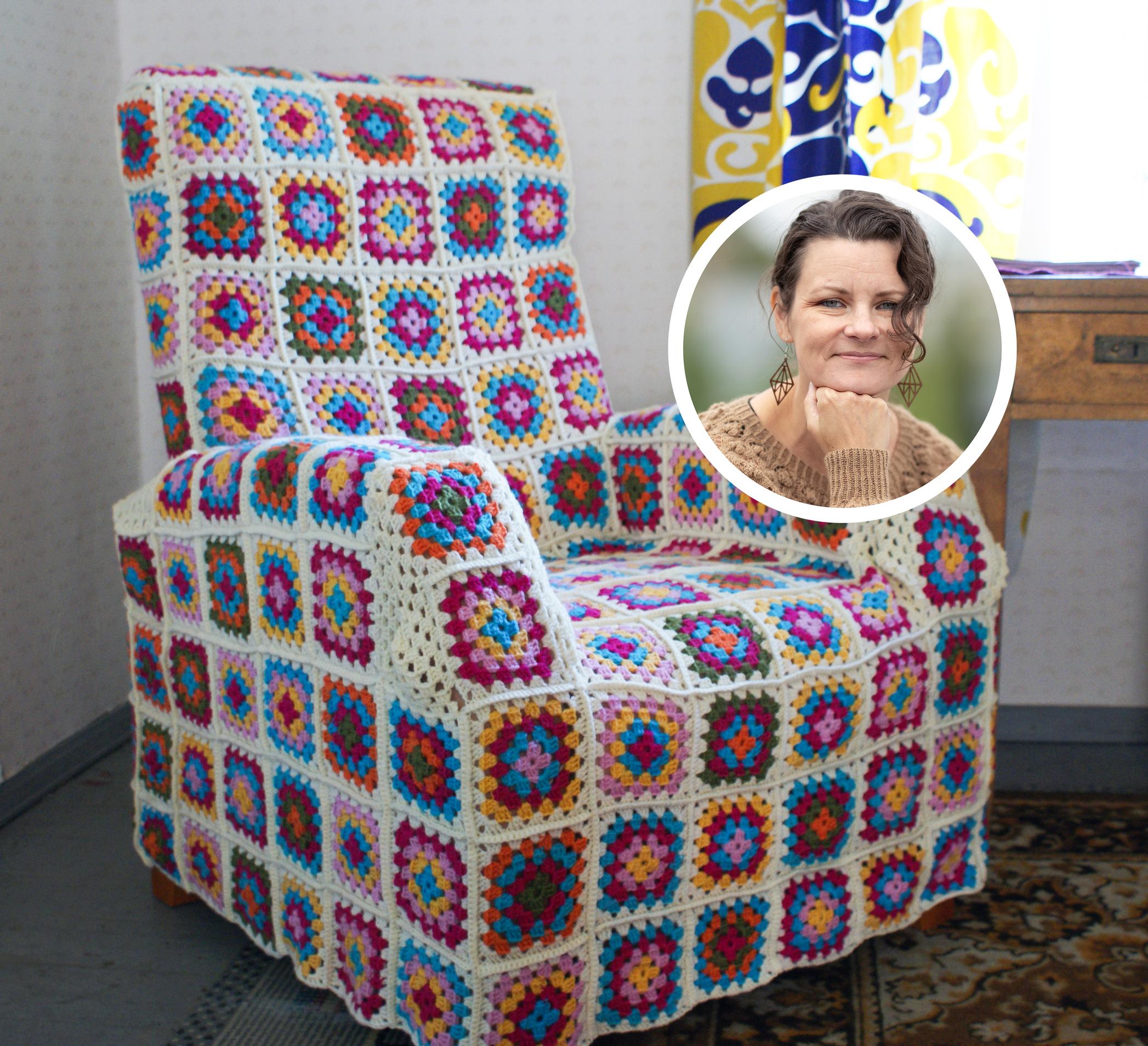 Knitwear designer Meiju Kallio transforms a large armchair with granny squares: “Crocheting is a vacation from knitting for me”