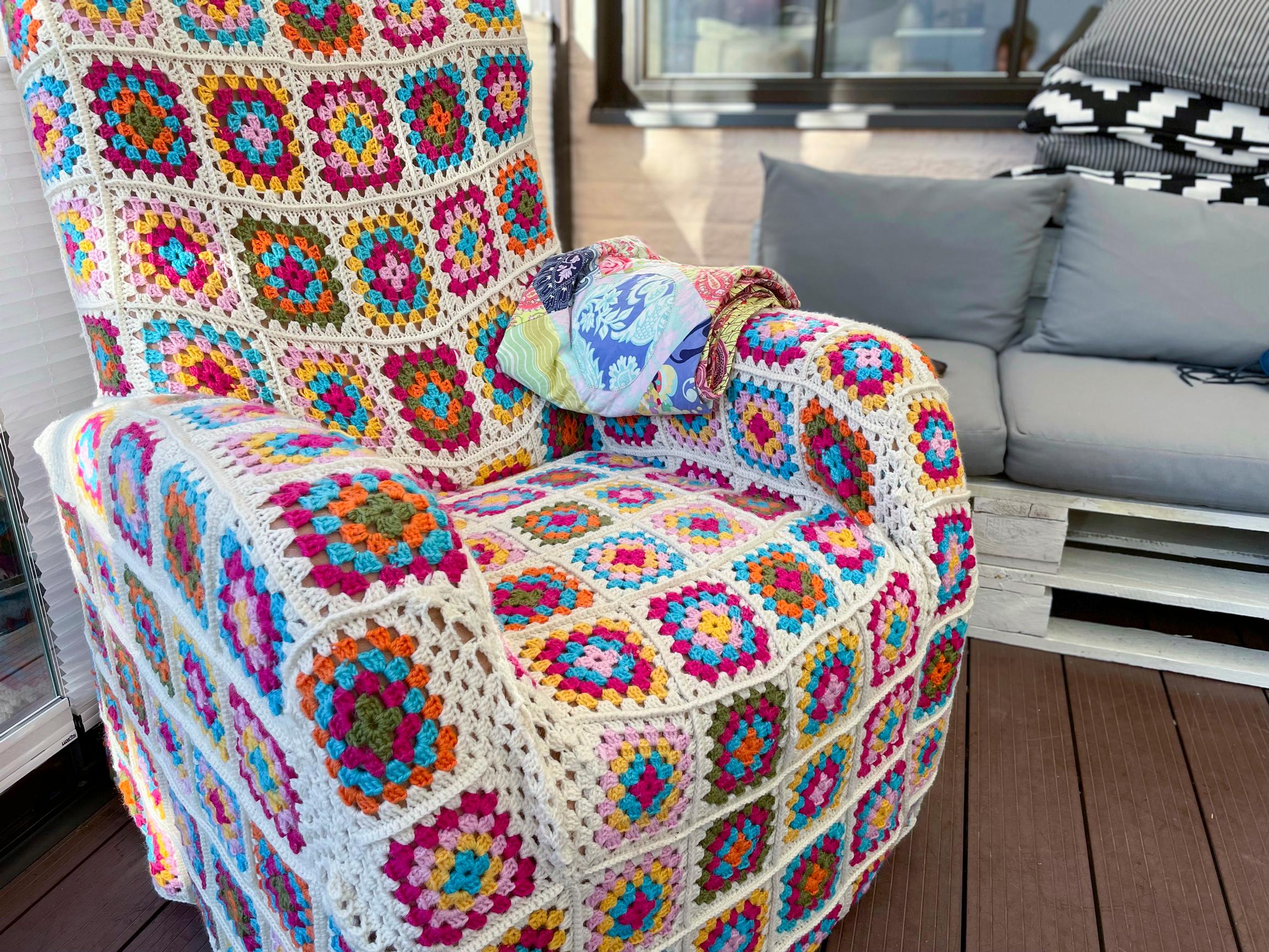 Last summer, I brought the chair and cover back from the cottage to my new home. When I went to pick it up, I realized eight squares were missing—I had forgotten the cover was unfinished! Because the chair had been in a corner with the unfinished side hidden, I never remembered to crochet more squares. Now the chair sits on my glass terrace, and you can see the gap from the living room window. I cover this small flaw with a patchwork quilt I sewed—luckily, it matches the colors!