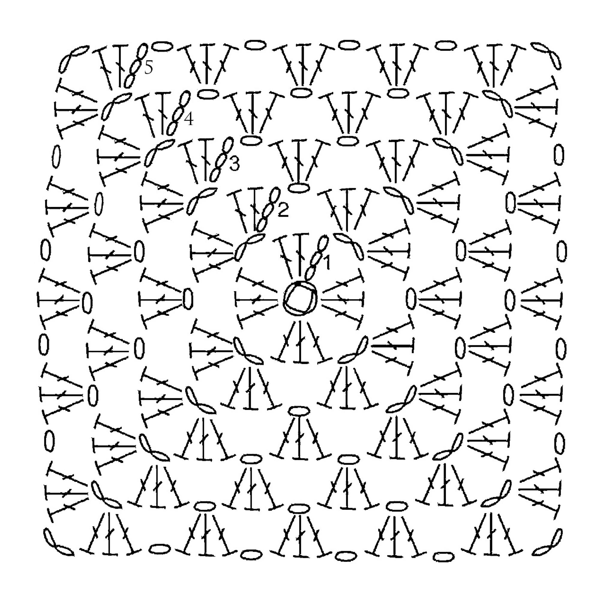 Rounds 3–5: Ch 3, 2 dc in the middle space of the side, ch 1, in the 3-ch corner space *3 dc + ch 3 + 3 dc, ch 1, 3 dc in the side space, ch 1, repeat from * two more times. In the corner, make 3 dc + ch 3 + 3 dc, ch 1, and close the round with a sl st, changing color. Continue by following the pattern for Rounds 4–5.