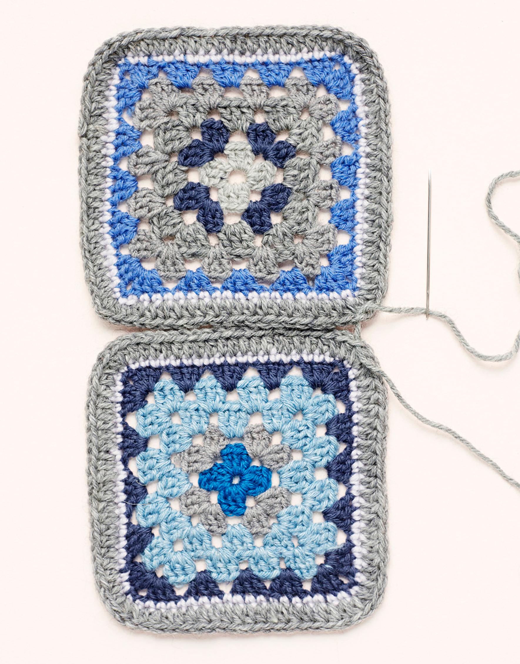 Sew the squares together. Create a border by working a sl st into any chain stitch, then ch 2 (counts as the first hdc). Continue with hdc all around. Remember to add 2 hdc in one chain stitch at each corner.