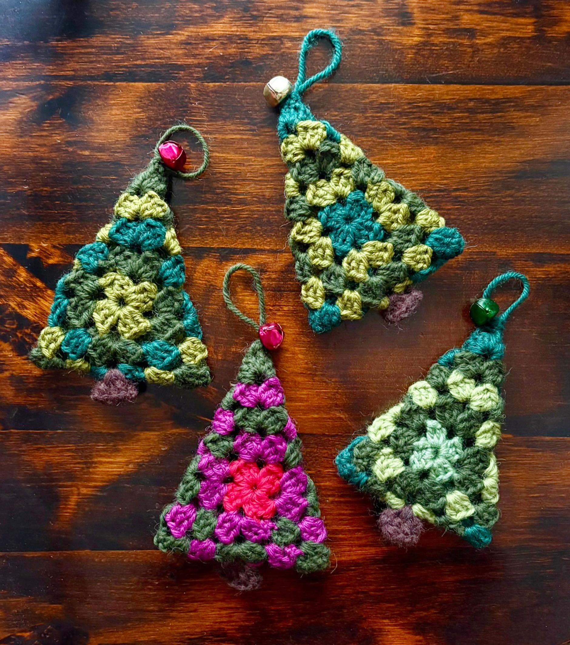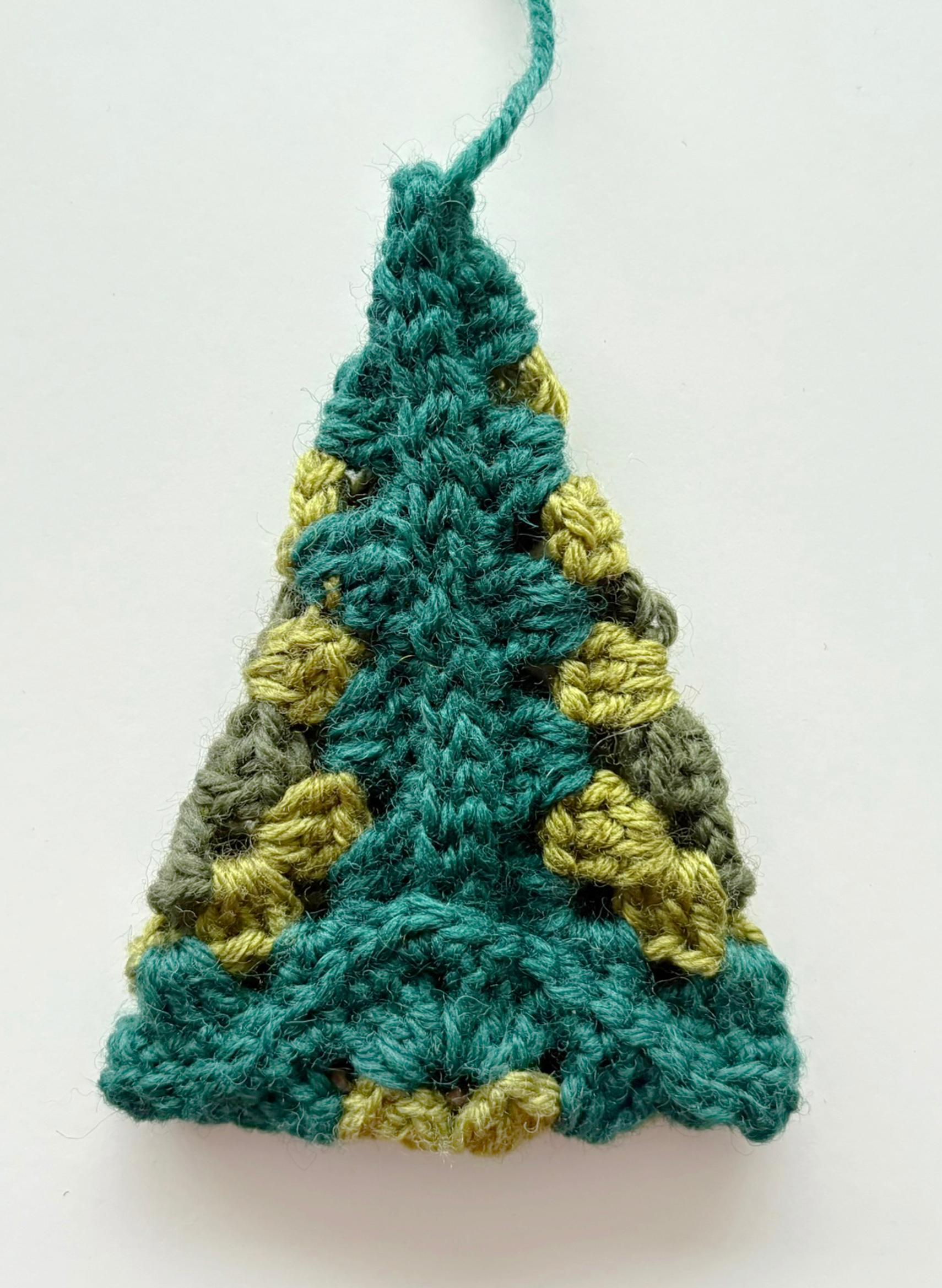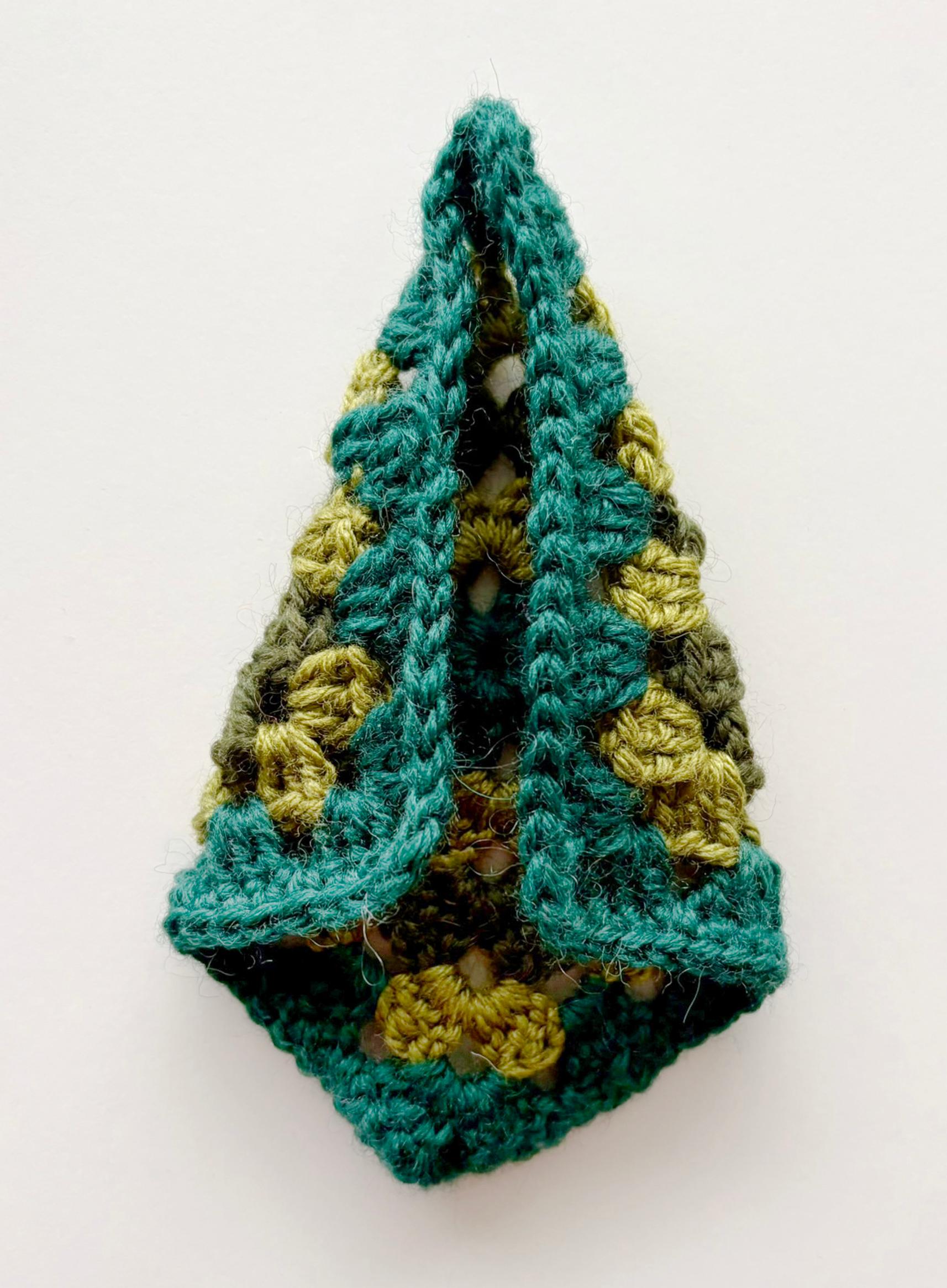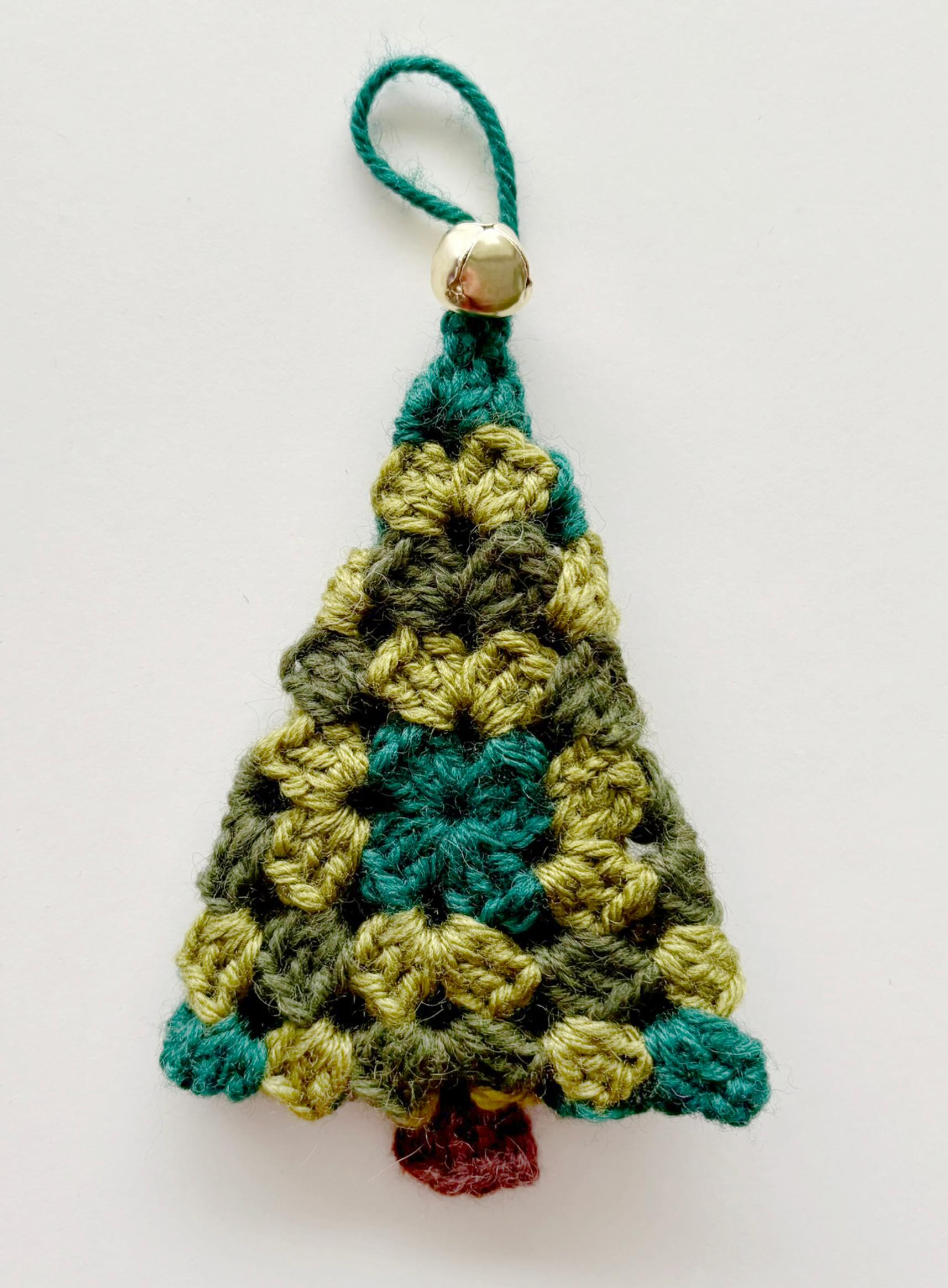 A granny square turns into a beautiful Christmas ornament with ease: crochet one square, fold it into a triangle, and stitch a couple of seams. The sweet mini tree can decorate your Christmas tree, a wreath, or a gift.