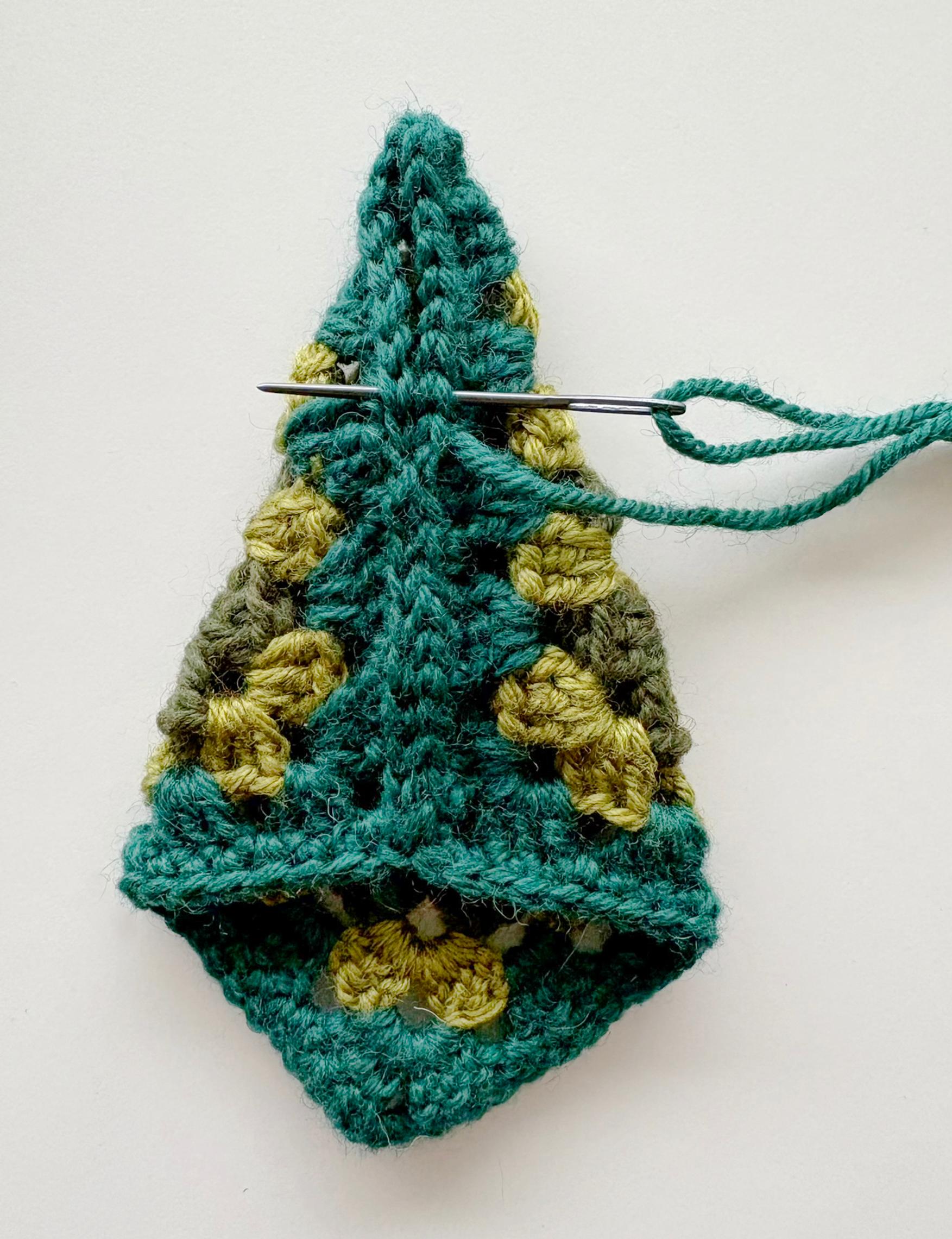 8. Attach the yarn with a slip stitch to the middle space along the tree’s bottom edge.