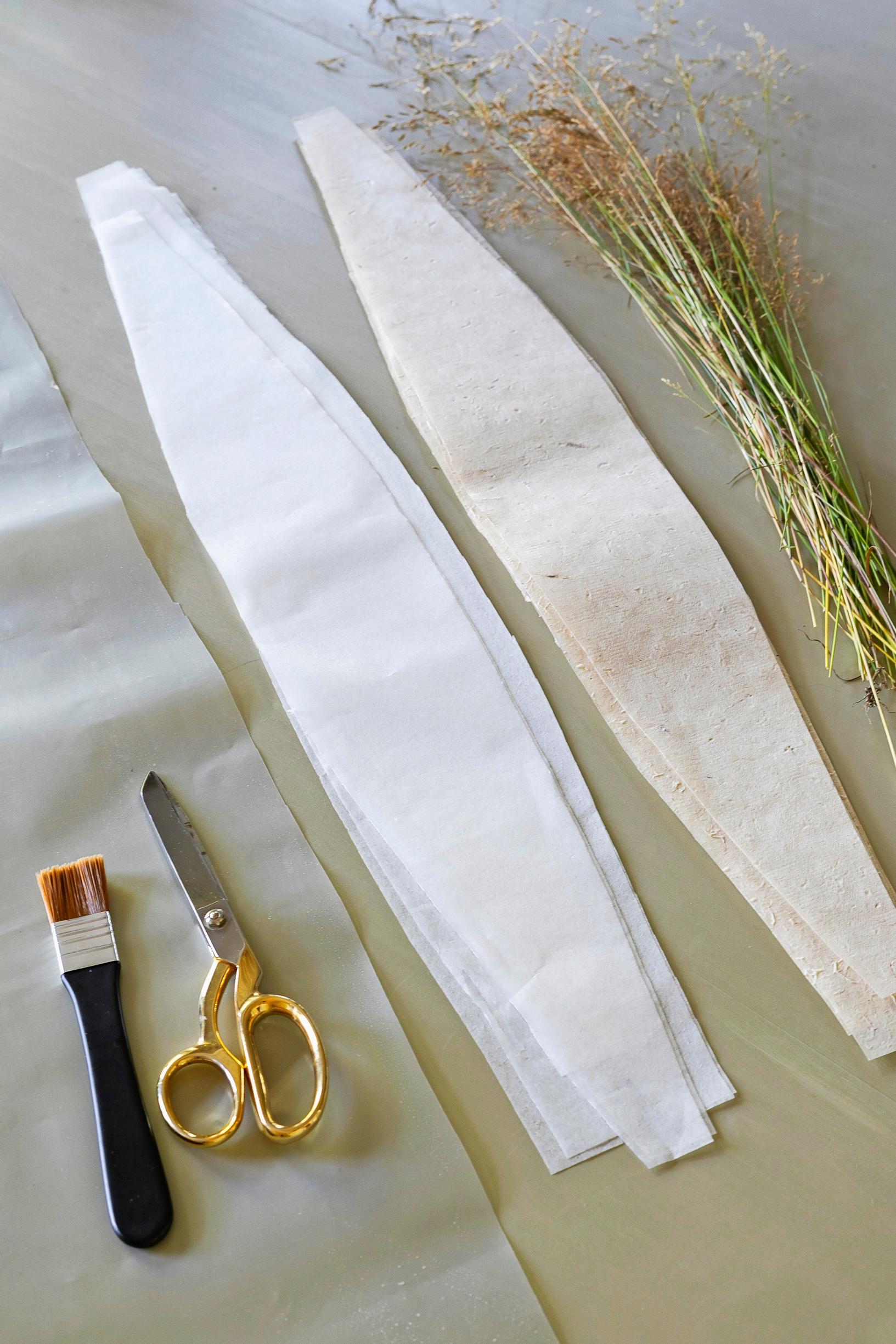 2. Cut strips of Japanese paper for the base and outer layers of your lampshade. Make sure each strip is at least a couple of centimeters (about an inch) wider than the frame’s openings.