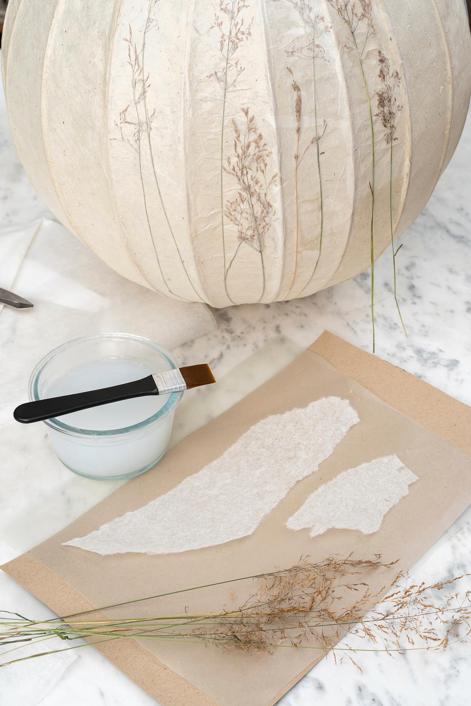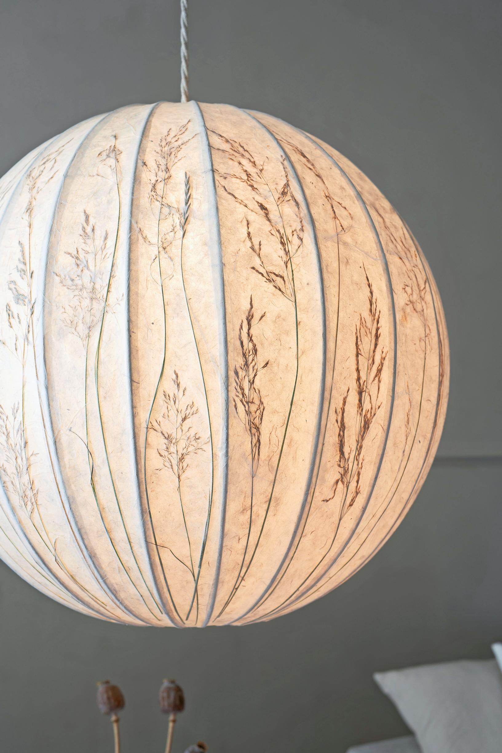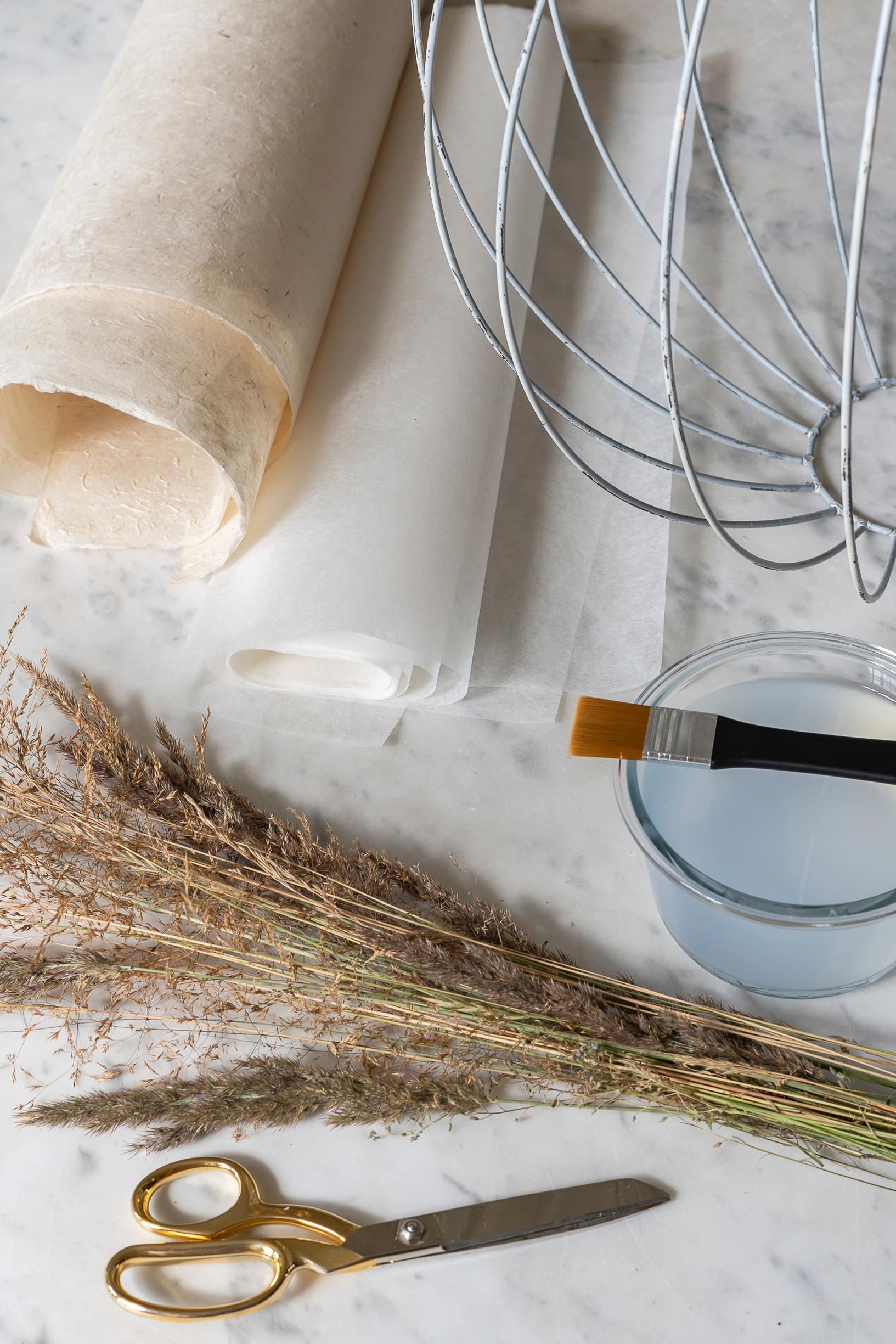 A paper lampshade covered with autumn grasses brings a gentle glow to darkening evenings. You can use these light, airy grasses just as they are, without pressing. The two-ingredient paste used in this project is easily mixed from potato starch and water.