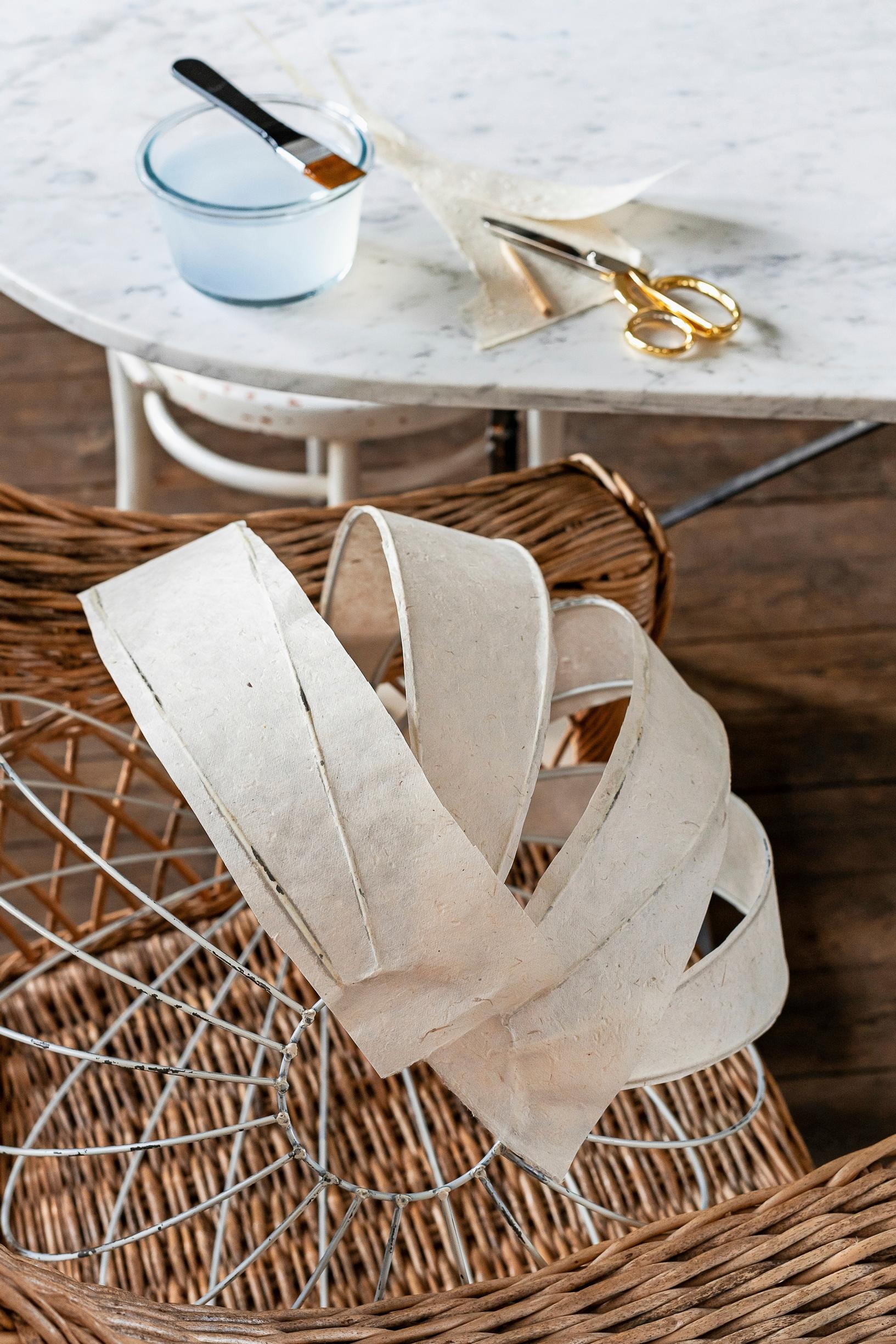 3. Attach the base paper layers first, working on every other section of the lampshade frame. Spread a thin layer of paste along the frame’s metal supports, then gently press on a dry paper strip. Use more glue if needed. You can trim excess edges with scissors, but leave at least 0.5–1 cm (0.2–0.4 in) extra.